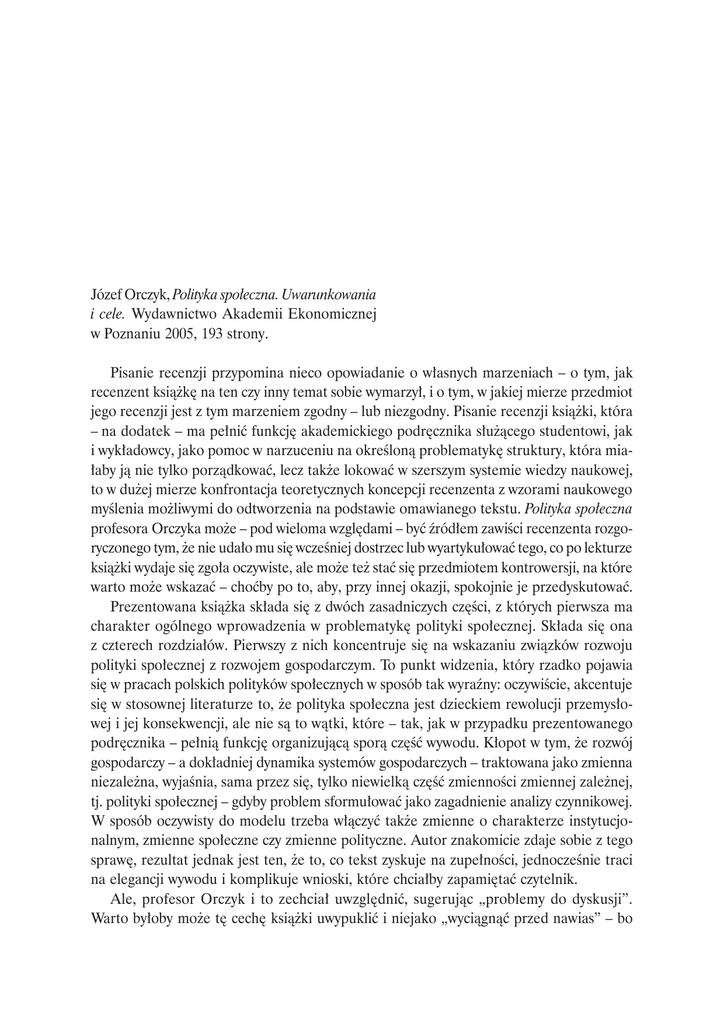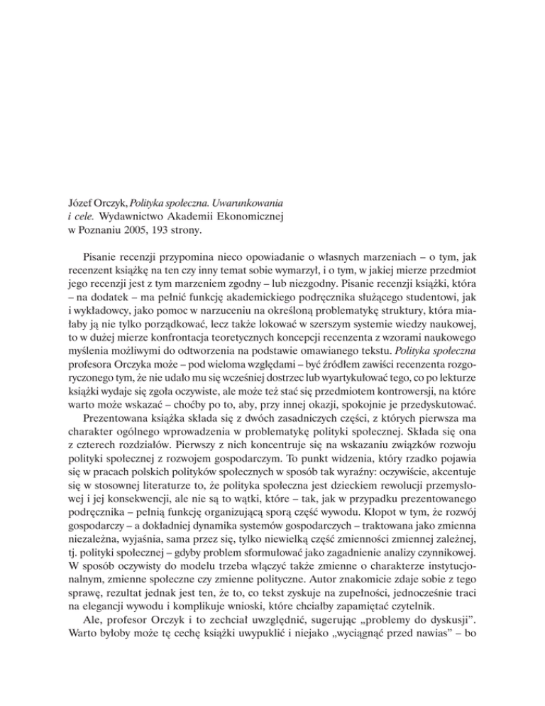 Józef Orczyk, Polityka społeczna. Uwarunkowania i cele. Wydawnictwo Akademii Ekonomicznej w Poznaniu 2005, 193 strony. Pisanie recenzji przypomina nieco opowiadanie o własnych marzeniach – o tym, jak recenzent książkę na ten czy inny temat sobie wymarzył, i o tym, w jakiej mierze przedmiot jego recenzji jest z tym marzeniem zgodny – lub niezgodny. Pisanie recenzji książki, która – na dodatek – ma pełnić funkcję akademickiego podręcznika służącego studentowi, jak i wykładowcy, jako pomoc w narzuceniu na określoną problematykę struktury, która miałaby ją nie tylko porządkować, lecz także lokować w szerszym systemie wiedzy naukowej, to w dużej mierze konfrontacja teoretycznych koncepcji recenzenta z wzorami naukowego myślenia możliwymi do odtworzenia na podstawie omawianego tekstu. Polityka społeczna profesora Orczyka może – pod wieloma względami – być źródłem zawiści recenzenta rozgoryczonego tym, że nie udało mu się wcześniej dostrzec lub wyartykułować tego, co po lekturze książki wydaje się zgoła oczywiste, ale może też stać się przedmiotem kontrowersji, na które warto może wskazać – choćby po to, aby, przy innej okazji, spokojnie je przedyskutować. Prezentowana książka składa się z dwóch zasadniczych części, z których pierwsza ma charakter ogólnego wprowadzenia w problematykę polityki społecznej. Składa się ona z czterech rozdziałów. Pierwszy z nich koncentruje się na wskazaniu związków rozwoju polityki społecznej z rozwojem gospodarczym. To punkt widzenia, który rzadko pojawia się w pracach polskich polityków społecznych w sposób tak wyraźny: oczywiście, akcentuje się w stosownej literaturze to, że polityka społeczna jest dzieckiem rewolucji przemysłowej i jej konsekwencji, ale nie są to wątki, które – tak, jak w przypadku prezentowanego podręcznika – pełnią funkcję organizującą sporą część wywodu. Kłopot w tym, że rozwój gospodarczy – a dokładniej dynamika systemów gospodarczych – traktowana jako zmienna niezależna, wyjaśnia, sama przez się, tylko niewielką część zmienności zmiennej zależnej, tj. polityki społecznej – gdyby problem sformułować jako zagadnienie analizy czynnikowej. W sposób oczywisty do modelu trzeba włączyć także zmienne o charakterze instytucjonalnym, zmienne społeczne czy zmienne polityczne. Autor znakomicie zdaje sobie z tego sprawę, rezultat jednak jest ten, że to, co tekst zyskuje na zupełności, jednocześnie traci na elegancji wywodu i komplikuje wnioski, które chciałby zapamiętać czytelnik. Ale, profesor Orczyk i to zechciał uwzględnić, sugerując „problemy do dyskusji”. Warto byłoby może tę cechę książki uwypuklić i niejako „wyciągnąć przed nawias” – bo 184 Recenzje nie tylko pierwszy, lecz także i kolejne rozdziały również kończą kilkupunktowe listy „problemów do dyskusji” – ale recenzentowi wydaje się, że są one czymś więcej aniżeli tylko zabiegiem dydaktycznym. Można bowiem rozsądnie przypuszczać, że idzie tu nie tyle o prosty zabieg wskazujący na to, co warto byłoby przedyskutować ze studentami, lecz o wskazanie wykładowcy kwestii, które sam powinien przemyśleć i znaleźć dla nich jakieś rozwiązanie – a najczęściej będzie to rozwiązanie mające postać deklaracji teoretycznej. Wystarczy pochylić się nieco uważniej nad niektórymi tylko z zagadnień nazwanych minimalistycznie problemami do dyskusji: „demokracja a świadczenia społeczne”; „wpływ rozwoju usług rynkowych na metody realizacji świadczeń społecznych” czy pytanie o to „co decyduje o zmianie znaczenia polityki społecznej?” O pierwszej z tych kwestii Luhman napisał całą – wprawdzie niedużą, ale ważną – książkę; kwestia druga jest omawiana w pierwszych rozdziałach każdego poważnego podręcznika z public policy; trzeci problem to pytanie, na które recenzent nie poważyłby się odpowiadać bez wprowadzenia serii założeń dotyczących, na przykład, funkcjonowania administracji publicznej w rozmaitych systemach politycznych. Więc, chciałby on zinterpretować intelektualny figiel ukryty w profesora Orczyka „problemach do dyskusji” jako myśl taką oto: „wiem, ale nie powiem – bo każda z odpowiedzi musiałaby być obciążona jakimiś przekonaniami, a nie widzę powodu, dla którego miałbym komukolwiek narzucać swoje przekonania”. Intelektualnie jest to rozwiązanie nader eleganckie, o tym, czy wytrzyma próbę dydaktyki, recenzent przekona się eksperymentalnie – bo, podejmując wyzwanie, wykorzysta recenzowaną książkę jako podręcznik. I – wypada dodać – chciałby do tego samego zachęcić PT Kolegów prowadzących zajęcia akademickie z polityki społecznej. Nie ma żadnej wątpliwości, że sztuka pisania podręcznika to przede wszystkim sztuka dokonywania wyboru. Wybory, których dokonał autor, z całą pewnością mają swoje uzasadnienie, logika wywodu łączącego dynamikę polityki społecznej z dynamiką gospodarczą może się bronić – ale też jest przecież i tak, że dynamika gospodarcza analizowana na osi czasu zadziwiająco się zapętla. To jeden z paradoksów, o których pisał Polanyi: wiktoriańska Anglia – to czasy gospodarczej pomyślności, także czasy narastających interwencji państwa w życie zbiorowe – i jednocześnie okres rozkwitu liberalnej retoryki społecznej, która na instytucjonalne aspekty polityki społecznej miała niemały wpływ. Więc – nie jest wykluczone, że czynniki, które – wedle propozycji autora – są wtórne wobec rozwoju gospodarczego, oddziaływają na kształt polityki społecznej samodzielnie, czy w sposób nieco bardziej autonomiczny. Gdyby tak miało być istotnie, to recenzent nie znajduje jakiegokolwiek uzasadnienia dla takiej luki w diachronii polityki społecznej, jaką wyznacza, na przykład, pominięcie powojennych, brytyjskich reform państwa opi