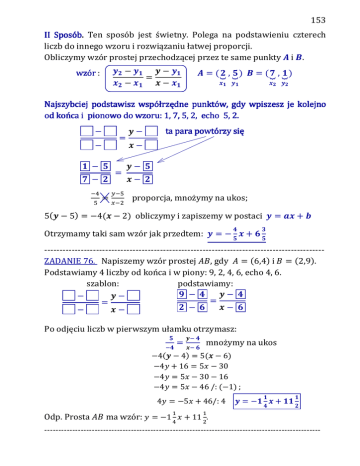 153 II Sposób. Sposób. Ten sposób jest świetny. Polega na podstawieniu czterech liczb do innego wzoru i rozwiązaniu łatwej proporcji. Obliczymy wzór prostej przechodzącej przez te same punkty % i &. wzór : : 0* @ 0- ( 0 @ 0, * @ , - , @ ,- % ( )+ *,+ / 1 & ( )2 +,+ -1 ,- 0 - ,* 0 * Najszybciej podstawisz współrzędne punktów, punktów, gdy wpiszesz je kolejno od końca i pionowo do wzoru: wzoru: 1, 7, 5, 2, echo 5, 2. @ ( @ - @ / 2 @ * 89 : ( 0@ ta para powtórzy się ,@ 0@ / ,@ * ;8: ( <8= proporcja, mnożymy na ukos; 5)0 @ 51 ( @4), @ 21 obliczymy i zapiszemy w postaci 0 ( B, C D E G Otrzymamy taki sam wzór jak przedtem: 0 ( @ / , C F / -------------------------------------------------------------------------------------------ZADANIE 76. Napiszemy wzór prostej NO, gdy N ( )6,41 i O ( )2,91. Podstawiamy 4 liczby od końca i w piony: 9, 2, 4, 6, echo 4, 6. szablon: podstawiamy: V @ E 0@ E @ 0@ ( ( * @ F ,@ F @ ,@ Po odjęciu liczb w pierwszym ułamku otrzymasz: / 08 E ( ,8 F mnożymy na ukos 8E @4)0 @ 41 ( 5), @ 61 @4Q C 16 ( 5R @ 30 @4Q ( 5R @ 30 @ 16 @4Q ( 5R @ 46 /: )@11 ; 4Q ( @5R C 46/: 4 U - - 0 ( @- E , C -- * U Odp. Prosta NO ma wzór: Q ( @1 9 R C 11 =. ---------------------------------------------------------------------------------------------------