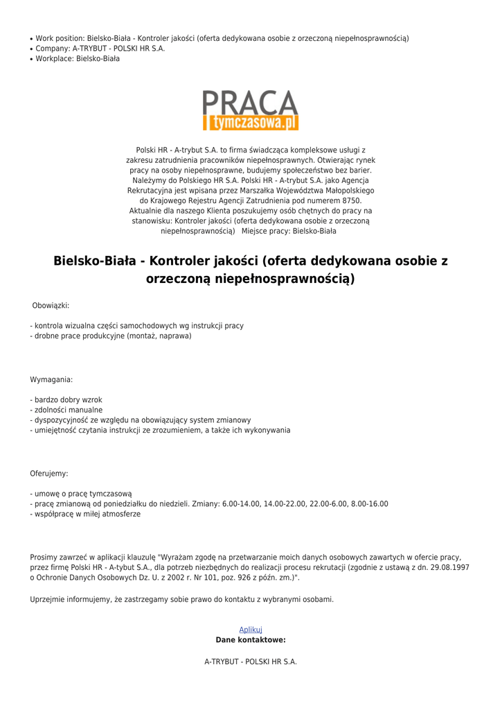 ● ● ● Work position: Bielsko-Biała - Kontroler jakości (oferta dedykowana osobie z orzeczoną niepełnosprawnością) Company: A-TRYBUT - POLSKI HR S.A. Workplace: Bielsko-Biała Polski HR - A-trybut S.A. to firma świadcząca kompleksowe usługi z zakresu zatrudnienia pracowników niepełnosprawnych. Otwierając rynek pracy na osoby niepełnosprawne, budujemy społeczeństwo bez barier. Należymy do Polskiego HR S.A. Polski HR - A-trybut S.A. jako Agencja Rekrutacyjna jest wpisana przez Marszałka Województwa Małopolskiego do Krajowego Rejestru Agencji Zatrudnienia pod numerem 8750. Aktualnie dla naszego Klienta poszukujemy osób chętnych do pracy na stanowisku: Kontroler jakości (oferta dedykowana osobie z orzeczoną niepełnosprawnością) Miejsce pracy: Bielsko-Biała Bielsko-Biała - Kontroler jakości (oferta dedykowana osobie z orzeczoną niepełnosprawnością) Obowiązki: - kontrola wizualna części samochodowych wg instrukcji pracy - drobne prace produkcyjne (montaż, naprawa) Wymagania: - bardzo dobry wzrok - zdolności manualne - dyspozycyjność ze względu na obowiązujący system zmianowy - umiejętność czytania instrukcji ze zrozumieniem, a także ich wykonywania Oferujemy: - umowę o pracę tymczasową - pracę zmianową od poniedziałku do niedzieli. Zmiany: 6.00-14.00, 14.00-22.00, 22.00-6.00, 8.00-16.00 - współpracę w miłej atmosferze Prosimy zawrzeć w aplikacji klauzulę "Wyrażam zgodę na przetwarzanie moich danych osobowych zawartych w ofercie pracy, przez firmę Polski HR - A-tybut S.A., dla potrzeb niezbędnych do realizacji procesu rekrutacji (zgodnie z ustawą z dn. 29.08.1997 o Ochronie Danych Osobowych Dz. U. z 2002 r. Nr 101, poz. 926 z późn. zm.)". Uprzejmie informujemy, że zastrzegamy sobie prawo do kontaktu z wybranymi osobami. Aplikuj Dane kontaktowe: A-TRYBUT - POLSKI HR S.A. Send Save Print Tweet