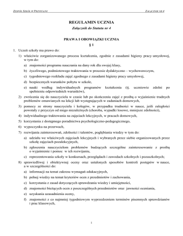 ZESPÓŁ SZKÓŁ W PRZYSTAJNI ZAŁĄCZNIK NR 4 REGULAMIN UCZNIA Załącznik do Statutu nr 4 PRAWA I OBOWIĄZKI UCZNIA §1 1. Uczeń szkoły ma prawo do: 1) właściwie zorganizowanego procesu kształcenia, zgodnie z zasadami higieny pracy umysłowej, w tym do: a) znajomości programu nauczania na dany rok dla swojej klasy, b) życzliwego, podmiotowego traktowania w procesie dydaktyczno – wychowawczym, c) tygodniowego rozkładu zajęć zgodnego z zasadami higieny pracy umysłowej, d) bezpiecznych warunków pobytu w szkole, e) nauki według indywidualnych programów spełnieniu odpowiednich warunków), kształcenia (tj. uczniowie zdolni po 2) zwrócenia się do nauczyciela w czasie lub po skończeniu zajęć z prośbą o wyjaśnienie trudnych problemów omawianych na lekcji lub występujących w zadaniach domowych, 3) pomocy ze strony nauczyciela i kolegów, w przypadku trudności w nauce, jeśli zaległości powstały z przyczyn od niego niezależnych (choroba, wypadki losowe, mniejsze zdolności), 4) indywidualnego traktowania na zajęciach lekcyjnych, w pracach domowych, 5) korzystania z dostępnego poradnictwa psychologiczno-pedagogicznego, 6) wypoczynku na przerwach, 7) rozwijania zainteresowań, zdolności i talentów, pogłębiania wiedzy w tym do: a) udziału we właściwych zajęciach lekcyjnych i wybranych przez siebie organizowanych przez szkołę zajęciach pozalekcyjnych, b) zgłoszenia nauczycielom problemów budzących szczególne zainteresowanie z prośbą o wyjaśnienie i pomoc w ich rozwijaniu, c) reprezentowania szkoły w konkursach, przeglądach i zawodach szkolnych i pozaszkolnych; 8) sprawiedliwej i obiektywnej oceny oraz ustalonych sposobów kontroli postępów w nauce, a w szczególności do: a) informacji na temat zakresu wymagań edukacyjnych, b) pełnej wiedzy na temat kryteriów ocen z przedmiotów i zachowania, c) korzystania z zasad dotyczących sprawdzania wiedzy i umiejętności, d) znajomości bieżących ocen z poszczególnych przedmiotów oraz jawności oceniania, e) uzyskania uzasadnienia oceny, f) znajomości z co najmniej tygodniowym wyprzedzeniem terminów pisemnych sprawdzianów i prac klasowych, 1 ZESPÓŁ SZKÓŁ W PRZYSTAJNI ZAŁĄCZNIK NR 4 9) opieki wychowawczej i warunków zapewniających bezpieczeństwo pobytu w szkole, ochronę przed wszystkimi formami przemocy fizycznej bądź psychicznej, nietykalność osobistą oraz ochronę i poszanowanie godności osobistej, 10) wpływania na życie szkoły przez działalność w samorządzie szkolnym oraz możliwość zrzeszania się w organizacjach uczniowskich działających w szkole, w tym do: a) zgłaszania władzom szkoły, nauczycielom, przedstawicielom, samorządu uczniowskiego wniosków i postulatów dotyczących spraw uczniowskich, b) swobody wyrażania myśli i przekonań w szczególności dotyczących życia szkoły, c) korzystania z pomieszczeń szkolnych, urządzeń, sprzętu oraz środków dydaktycznych przeznaczonych do ogólnego użytku, zgodnie z ich przeznaczeniem na zasadach ustalonych przez szkołę, 11) zwolnienia ze szkoły na pisemną prośbę rodziców (zwolnienia udziela wychowawca klasy po skontaktowaniu się z nauczycielami przedmiotów, w przypadku nieobecności wychowawcy zastępuje go dyrektor szkoły), 12) zwolnienia z części zajęć szkolnych w danym dniu w przypadkach losowych, np. zdrowotnych, po konsultacji telefonicznej wychowawcy, dyrektora szkoły lub higienistki szkolnej z rodzicem (opiekunem prawnym) ucznia, 13) kultywowania tradycji szkoły, w uroczystościach szkolnych, wzbogacania ceremoniału szkolnego i uczestnictwa 14) nagrody za wysokie wyniki w nauce, wzorową postawę społeczną zgodnie z regulaminem szkoły. §2 1. Uczeń szkoły ma obowiązek: 1) dbać o honor szkoły, godnie ją reprezentować, znać, szanować i wzbogacać jej dobre tradycje, 2) systematycznie uczęszczać do szkoły i aktywnie uczestniczyć w zajęciach szkolnych, 3) pracować nad wzbogacaniem swojej wiedzy, wykorzystywać jak najlepiej warunki i czas do nauki, 4) przedłożyć wychowawcy klasy pisemne usprawiedliwienie nieobecności edukacyjnych w terminie do 14 dni po zaistniałej nieobecności, na zajęciach 5) współdziałać w realizacji celów i zadań stojących przed szkołą, 6) być współodpowiedzialnym społeczności uczniowskiej, za wyniki pracy szkoły i wszystkie sprawy 7) dbać o czystość i poprawność używanego języka, 8) okazywać szacunek każdemu człowiekowi, w tym nauczycielom, wychowawcom oraz innym pracownikom szkoły, 9) pomagać w miarę swoich możliwości w nauce kolegom, tym którzy mają trudności powstałe z przyczyn od nich niezależnych, 10) tworzyć atmosferę wzajemnej życzliwości, pomagać słabszym, przeciwdziałać wszelkim przejawom przemocy, brutalności, zarozumialstwa, wystrzegać się plotkarstwa i lizusostwa, 11) przestrzegać regulaminu szkoły, 12) przestrzegać postanowień zawartych w statucie a zwłaszcza: 2 ZESPÓŁ SZKÓŁ W PRZYSTAJNI ZAŁĄCZNIK NR 4 a) przeciwdziałać wszelkim przejawom wandalizmu i nieodpowiedzialności oraz marnotrawstwu i niszczeniu majątku szkoły, b) ponosić materialną odpowiedzialność za szkody wyrządzone w sposób rozmyślny w mieniu szkolnym, c) chronić, pomnażać, szanować wytwory własnej pracy oraz pracy innych, szanować mienie własne, społeczne oraz mienie innych, d) dbać o porządek, ład i estetykę pomieszczeń oraz zieleń w szkole i jej otoczeniu, e) dbać o zdrowie, bezpieczeństwo swoje i kolegów, wystrzegać się szkodliwych nałogów, w szkole i poza szkołą, tj. nie palić tytoniu, nie spożywać alkoholu, nie zażywać środków narkotyzujących i innych środków odurzających, f) przestrzegać zasad higieny osobistej, dbać o estetykę ubioru oraz indywidualnie dobranej fryzury, 13) nosić odzież i obuwie właściwe dla rodzaju zajęć, tzn. a) nosić na terenie szkoły obuwie zmienne typu sportowego (np. adidas, trampek o białej lub jasnej podeszwie), ─
