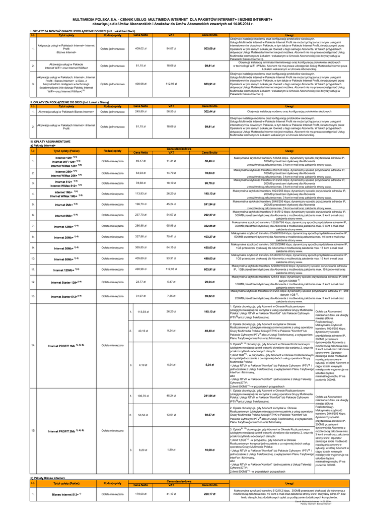 MULTIMEDIA POLSKA S.A. - CENNIK USŁUG MULTIMEDIA INTERNET DLA PAKIETÓW INTERNET+ I BIZNES INTERNET+ obow iązuje dla Umów Abonenckich i Aneksów do Umów Abonenckich zaw artych od 14.05.2014 r. I. OPŁATY ZA MONTAŻ GNIAZD I PODŁĄCZENIE DO SIECI (dot. Lokali bez Sieci) Cena Netto Lp. Tytuł opłaty Rodzaj opłaty VAT Cena Brutto 1. Aktywacja usługi w Pakietach Internet+ Internet Profit i Biznes Internet+ Opłata jednorazowa 409,02 zł 94,07 zł 503,09 zł 2. Aktywacja usługi w Pakiecie Internet WiFi+ oraz Internet WiMax+ Opłata jednorazowa 81,15 zł 18,66 zł 99,81 zł 3. Aktywacja usługi w Pakietach: Internet+, Internet Profit i Biznes Internet+ w Sieci, z bezpośrednim dostępem w technologii światłowodowej (nie dotyczy Pakietu Internet WiFi+ oraz Internet WiMax+)16) 490,98 zł Opłata jednorazowa II. OPŁATY ZA PODŁĄCZENIE DO SIECI (dot. Lokali z Siecią) Lp. Tytuł opłaty Rodzaj opłaty 1. Aktywacja usługi w Pakietach Biznes Internet+ 2. Aktywacja usługi w Pakietach Internet+ i Internet Profit Opłata jednorazowa Obejmuje instalację modemu oraz konfigurację protokołów sieciowych. Usługa Multimedia Internet w Pakiecie Internet Profit nie może być łączona z innymi usługami internetowymi w dowolnym Pakiecie, w tym także w Pakiecie Internet Profit, świadczonymi przez Operatora w tym samym Lokalu jak również u tego samego Abonenta. W takich przypadkach aktywacja Usługi Multimedia Internet nie jest możliwa. Abonent nie ma prawa udostępniać Usług Multimedia Internet poza Lokalem wskazanym w Umowie Abonenckiej (nie dotyczy usługi w Pakietach Biznes Internet+). 112,93 zł 603,91 zł Cena Netto VAT Cena Brutto Uwagi 245,89 zł 56,55 zł 302,44 zł Obejmuje instalację modemu oraz konfigurację protokołów sieciowych 81,15 zł Opłata jednorazowa Uwagi Obejmuje instalację modemu oraz konfigurację protokołów sieciowych. Usługa Multimedia Internet w Pakiecie Internet Profit nie może być łączona z innymi usługami internetowymi w dowolnym Pakiecie, w tym także w Pakiecie Internet Profit, świadczonymi przez Operatora w tym samym Lokalu jak również u tego samego Abonenta. W takich przypadkach aktywacja Usługi Multimedia Internet nie jest możliwa. Abonent nie ma prawa udostępniać Usług Multimedia Internet poza Lokalem wskazanym w Umowie Abonenckiej (nie dotyczy usługi w Pakietach Biznes Internet+). Obejmuje instalację terminala internetowego oraz konfigurację protokołów sieciowych w technologii WiFi i WiMax. Abonent nie ma prawa udostępniać Usług Multimedia Internet poza Lokalem wskazanym w Umowie Abonenckiej. 18,66 zł 99,81 zł Obejmuje instalację modemu oraz konfigurację protokołów sieciowych. Usługa Multimedia Internet w Pakiecie Internet Profit nie może być łączona z innymi usługami internetowymi w dowolnym Pakiecie, w tym także w Pakiecie Internet Profit, świadczonymi przez Operatora w tym samym Lokalu jak również u tego samego Abonenta. W takich przypadkach aktywacja Usługi Multimedia Internet nie jest możliwa. Abonent nie ma prawa udostępniać Usług Multimedia Internet poza Lokalem wskazanym w Umowie Abonenckiej. III. OPŁATY ABONAMENTOWE a) Pakiety Internet+ Lp. Tytuł opłaty (Pakiet) 1. Internet 128+ 1) 4) Internet WiFi 128+ 1) 5) Internet WiMax 128+ 1) 5) 1) 4) Rodzaj opłaty Cena Netto Cena standardowa VAT Cena Brutto Opłata miesięczna 49,17 zł 11,31 zł 60,48 zł 2. Internet 256+ Internet WiMax 256+ 1) 5) Opłata miesięczna 63,93 zł 14,70 zł 78,63 zł 3. Internet 512+ 1) 4) Internet WiMax 512+ 1) 5) Opłata miesięczna 78,68 zł 18,10 zł 96,78 zł 4. Internet 1Mb+ 1) 4) Internet WiMax 1Mb+ 1) 5) Opłata miesięczna 113,93 zł 26,20 zł 140,13 zł 5. Internet 2Mb+ 1) 4) Opłata miesięczna 196,70 zł 45,24 zł 241,94 zł 6. Internet 6Mb+ 1) 4) Opłata miesięczna 237,70 zł 54,67 zł 292,37 zł 7. Internet 12Mb+ 1) 4) Opłata miesięczna 286,88 zł 65,98 zł 352,86 zł 8. Internet 20Mb+ 1) 4) Opłata miesięczna 327,86 zł 75,41 zł 403,27 zł 9. Internet 30Mb+ 1) 4) Opłata miesięczna 365,85 zł 84,15 zł 450,00 zł 10. Internet 60Mb+ 1) 4) Opłata miesięczna 405,69 zł 93,31 zł 499,00 zł 11. Internet 120Mb+ Opłata miesięczna 490,98 zł 112,93 zł 603,91 zł 1) 4) 12. Internet Starter 128+1) 4) Opłata miesięczna 23,77 zł 5,47 zł 29,24 zł 13. Internet Starter 512+1) 4) Opłata miesięczna 31,97 zł 7,35 zł 39,32 zł 14. 15. Internet PROFIT 1Mb Internet PROFIT 2Mb 1), 4), 6), 1), 4), 6), 1. 113,93 zł 26,20 zł 140,13 zł 2. 40,16 zł 9,24 zł 49,40 zł 3. 4,10 zł 0,94 zł 5,04 zł 1. 196,70 zł 45,24 zł 241,94 zł 2. 56,56 zł 13,01 zł 69,57 zł 3. 8,20 zł 1,89 zł 10,09 zł Opłata miesięczna Opłata miesięczna Uwagi Maksymalna szybkość transferu 128/64 kbps, dynamiczny sposób przydzielania adresów IP, 100MB przestrzeni dyskowej dla Abonenta z możliwością założenia max. 3 kont e-mail oraz założenia strony www. Maksymalna szybkość transferu 256/128 kbps, dynamiczny sposób przydzielania adresów IP, 100MB przestrzeni dyskowej dla Abonenta z możliwością założenia max. 3 kont e-mail oraz założenia strony www. Maksymalna szybkość transferu 512/256 kbps; dynamiczny sposób przydzielania adresów IP, 200MB przestrzeni dyskowej dla Abonenta z możliwością założenia max. 3 kont e-mail oraz założenia strony www. Maksymalna szybkość transferu 1024/256 kbps; dynamiczny sposób przydzielania adresów IP, 200MB przestrzeni dyskowej dla Abonenta z możliwością założenia max. 3 kont e-mail oraz założenia strony www. Maksymalna szybkość transferu 2048/256 kbps; dynamiczny sposób przydzielania adresów IP, 200MB przestrzeni dyskowej dla Abonenta z możliwością założenia max. 3 kont e-mail oraz założenia strony www. Maksymalna szybkość transferu 6144/512 kbps; dynamiczny sposób przydzielania adresów IP, 300MB przestrzeni dyskowej dla Abonenta z możliwością założenia max. 5 kont e-mail oraz założenia strony www. Maksymalna szybkość transferu 12
