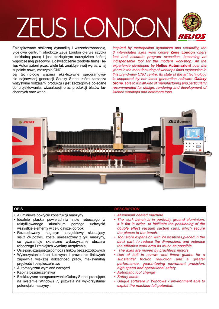 ZEUS LONDON Zainspirowane stoliczną dynamiką i wszechstronnością, 3-osiowe centrum obróbcze Zeus London oferuje szybką i dokładną pracę i jest niezbędnym narzędziem każdej współczesnej pracowni. Doświadczenie zdobyte firmą Helios Automazioni przez wiele lat, znajduje swój wyraz w tej zupełnie nowej maszynie CNC. Jej technologię wspiera ekskluzywne oprogramowanie najnowszej generacji Galaxy Stone, które zarządza wszystkimi rodzajami produkcji i jest szczególnie polecane do projektowania, wizualizacji oraz produkcji blatów kuchennych oraz wann. Made in Italy Inspired by metropolitan dynamism and versatility, the 3 interpolated axes work centre Zeus London offers fast and accurate program execution, becoming an indispensable tool for the modern workshop. All the experience developed by Helios Automazioni over the years in the manufacturing of worktops finds expression in this brand-new CNC centre. Its state of the art technology is supported by our latest generation software Galaxy Stone, able to run all kind of manufacturing and particularly recommended for design, rendering and development of kitchen worktops and bathroom tops. OPIS DESCRIPTION • Aluminiowe pokrycie konstrukcji maszyny • Idealnie płaska powierzchnia stołu roboczego z rektyfikowanego aluminium pomaga uchwycić wszystkie elementy w celu dalszej obróbki • Rozbudowany magazyn narzędziowy składający się z 24 pozycji, został umieszczony z tyłu maszyny, co gwarantuje skuteczne wykorzystanie obszaru roboczego i zmniejsza wymiary urządzenia • Osie poruszają się za pomocą silników bezszczotkowych • Wykorzystanie śrub kulowych i prowadnic liniowych zapewnia większą dokładność pracy, maksymalną prędkość i bezpieczeństwo • Automatyczna wymiana narzędzi • Kabina bezpieczeństwa • Ekskluzywne oprogramowanie Galaxy Stone, pracujące na systemie Windows 7, pozwala na wykorzystanie potencjału maszyny. • Aluminium coated machine • The work bench is in perfectly ground aluminium; it is flat in order to facilitate the positioning of the double effect vacuum suction cups, which secure the pieces to the bench. • Tool store expansion with 24 positions,placed in the back part, to reduce the dimensions and optimise the effective work area as much as possible. • The axes are moved by brushless motors • Use of ball in screws and linear guides for a substantial friction reduction and a greater performance, guaranteeing movement precision, high speed and operatiional safety. • Automatic tool change • Safety cabin • Unique software in Windows 7 environment able to exploit the machine full potential. PARAMETRY TECHNICZNE TECHNICAL FEATURES Wymiary Overall dimensions 5200x3300x2500 mm Obszar roboczy Work area Ruch wzdłuż osi X X axis stroke 3300 mm Ruch wzdłuż osi Y Y axis stroke 2000 mm Ruch wzdłuż osi Z Z axis stroke 480 mm Wrzeciono Spindle 12,5 Hp Rozbudowany magazyn narzędziowy 24 Pozycji Expandible tool store 24 Positions Moc Power 400 volt (3P+N+GND) Moc wymagana Power required 15 Kw Sprężone powietrze Compressed air Min. 7 BAR Stożek narzędziowy Tool cone ISO BT 40 Prędkość obrotowa wrzeciona Spindle rotation speed 0-12000 RPM Maksymalna prędkość w osi Max axis speed 60 m/min Waga Net weight 4000 kg Zużycie wody Water consumption 50 L/min Most Bridge passing 535 mm INDYWIDUALIZACJA CUSTOMIZATION • 3D symulacja procesu produkcyjnego • Czytnik szablonów • Pakiet dla sztuki nagrobkowej • Digitizer do nabycia 3D modelu • Czwarta oś • Tokarka CNC • Urządzenie do kontroli płaskości powierzchni • Urządzenie zerujące • Urządzenie Photograb do fototechnologii • Zbiorniki do recyklingu wody • Głowica kątowa do cięcia prostego i obróbki kolumn • Głowica kątowa do obróbki rzeźb i grawerowania frontów (Zeus) • Głowica kątowa do cięcia dyskiem wypukłym • Dodatkowe przesuwanie po osi Y • Urządzenie laserowe dla kopiowania 3D modelu, wyposażone w oprogramowanie dla projektowania oraz tworzenia rzeźb i płaskorzeźb . • 3d graphic simulation of the manufacturing process • Template reader • Funerary art package • Digitizer’s acquisition of 3d models • Fourth axis • CNC lathe • Flatness control device • Reset tool device (presetting) • Photo graffiti device • Tanks for water recycling • Angle head for straight cutting with disk and for columns grinding • Angle head for sculpture and frontal engraving(Zeus • Angle head for cutting with convex disk (shaped cutting) • Extra Y stroke • Laser copying system for the acquisition of 3D models, equipped with modeling software and sculptures and bas-reliefs execution. MOŻLIWOŚĆI OBRÓBKI SAMPLES OF PROCESSING Liternictwo Lettering Grawerowanie Engraving Rzeźbienie Sculpturing Ramki Frames Inkrustacja Inlaying works Fototechnologia Pictures’ scratching Kolumny Columns Kapitele Capitals Rzeźby Statues Blaty Tops Zlewozmywaki Drain boards Portale Portals Wanny Bathtubs Elementy dekoracyjne Kominki Fireplaces Decorative pieces Siedziba firmy / Salon wystawowy Via Olanda, allacciante H - Zona Ind. 66050 San Salvo (CH) - Italy Tel. 0039 0873 341584 Fax 0039 0873 545077 www.heliosautomazioni.com [email protected]