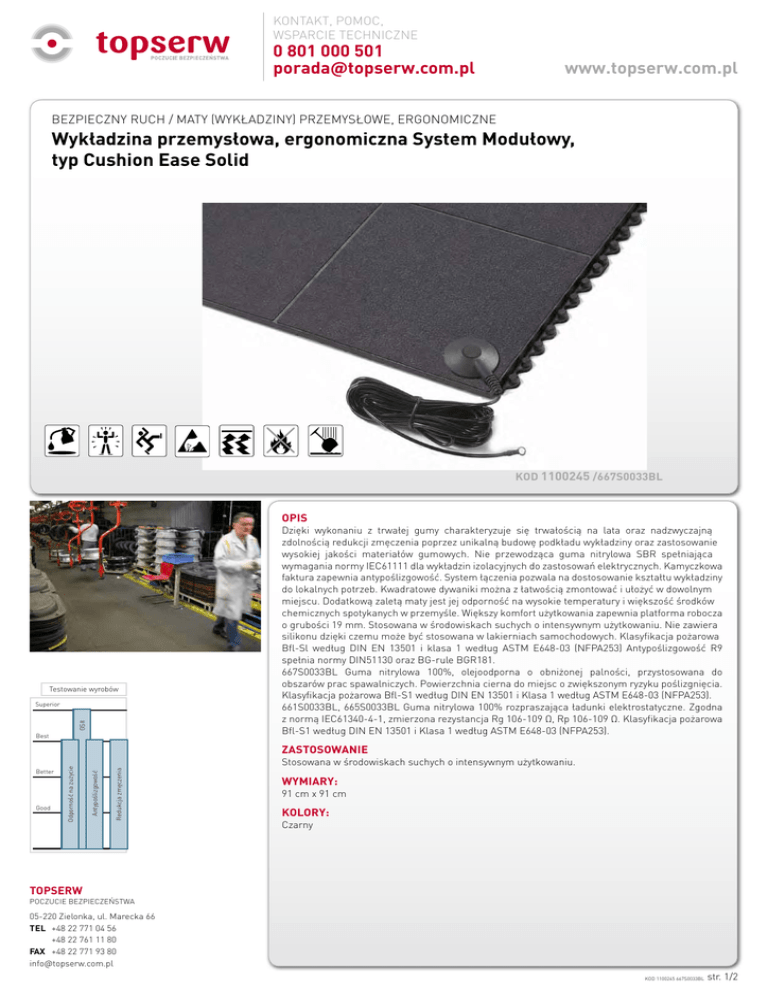 KONTAKT, POMOC, WSPARCIE TECHNICZNE 0 801 000 501 [email protected] www.topserw.com.pl BEZPIECZNY RUCH / MATY (WYKŁADZINY) PRZEMYSŁOWE, ERGONOMICZNE Wykładzina przemysłowa, ergonomiczna System Modułowy, typ Cushion Ease Solid KOD 1100245 /667S0033BL OPIS Testowanie wyrobów GSII Superior Best Dzięki wykonaniu z trwałej gumy charakteryzuje się trwałością na lata oraz nadzwyczajną zdolnością redukcji zmęczenia poprzez unikalną budowę podkładu wykładziny oraz zastosowanie wysokiej jakości materiałów gumowych. Nie przewodząca guma nitrylowa SBR spełniająca wymagania normy IEC61111 dla wykładzin izolacyjnych do zastosowań elektrycznych. Kamyczkowa faktura zapewnia antypoślizgowość. System łączenia pozwala na dostosowanie kształtu wykładziny do lokalnych potrzeb. Kwadratowe dywaniki można z łatwością zmontować i ułożyć w dowolnym miejscu. Dodatkową zaletą maty jest jej odporność na wysokie temperatury i większość środków chemicznych spotykanych w przemyśle. Większy komfort użytkowania zapewnia platforma robocza o grubości 19 mm. Stosowana w środowiskach suchych o intensywnym użytkowaniu. Nie zawiera silikonu dzięki czemu może być stosowana w lakierniach samochodowych. Klasyfikacja pożarowa Bfl-Sl według DIN EN 13501 i klasa 1 według ASTM E648-03 (NFPA253) Antypoślizgowość R9 spełnia normy DIN51130 oraz BG-rule BGR181. 667S0033BL Guma nitrylowa 100%, olejoodporna o obniżonej palności, przystosowana do obszarów prac spawalniczych. Powierzchnia cierna do miejsc o zwiększonym ryzyku poślizgnięcia. Klasyfikacja pożarowa Bfl-S1 według DIN EN 13501 i Klasa 1 według ASTM E648-03 (NFPA253). 661S0033BL, 665S0033BL Guma nitrylowa 100% rozpraszająca ładunki elektrostatyczne. Zgodna z normą IEC61340-4-1, zmierzona rezystancja Rg 106-109 Ω, Rp 106-109 Ω. Klasyfikacja pożarowa Bfl-S1 według DIN EN 13501 i Klasa 1 według ASTM E648-03 (NFPA253). Redukcja zmęczenia Good Antypoślizgowość Better Odporność na zużycie ZASTOSOWANIE Stosowana w środowiskach suchych o intensywnym użytkowaniu. WYMIARY: 91 cm x 91 cm KOLORY: Czarny TOPSERW POCZUCIE BEZPIECZEŃSTWA 05-220 Zielonka, ul. Marecka 66 TEL +48 22 771 04 56 +48 22 761 11 80 FAX +48 22 771 93 80 [email protected] KOD 1100245 667S0033BL str. 1/2 KONTAKT, POMOC, WSPARCIE TECHNICZNE 0 801 000 501 [email protected] www.topserw.com.pl BEZPIECZNY RUCH / MATY (WYKŁADZINY) PRZEMYSŁOWE, ERGONOMICZNE Wykładzina przemysłowa, ergonomiczna System Modułowy, typ Cushion Ease Solid DOSTĘPNE MODELE / DANE TECHNICZNE Kod produktu Numer artykułu Typ Waga (kg) Wymiary (cm) Kolor 1100245 667S0033BL Cushion Ease Solid NC FR 12 91*91 czarny 1100247 1100248 661S0033BL Niru Cushion Ease Solid ESD DIF FR 12 91*91 czarny 665S0033BL Niru Cushion Ease Solid ESD CON FR 12 91*91 czarny WYPOSAŻENIE DODATKOWE Numer artykułu Opis 051SFG0100 Przewód do uziemienia wykładziny antyelektrostatycznej, gniazdko 051SFG0200 052SCG0100 052SCG0200 053SCC0100 054SEB0100 054SEB0200 055SHG0100 056SWB0100 Przewód do uziemienia wykładziny antyelektrostatycznej, oczko 057SMC0100 Wspólny przewód uziemiający, wtyczka Wspólny przewód uziemiający, gniazdko Przewód spiralny, wykładziny antyelektrostatyczne, wtyczką Wtyczka do podłączenia uziemienia, wykładziny antyelektrostatyczne, wersja kontynentalna Wtyczka do podłączenia uziemienia, wykładziny antyelektrostatyczne, wersja brytyjska Uziemienie stóp, wykładziny antyelektrostatyczne Pasek nadgarstkowy, wykładziny antyelektrostatyczne Środek do czyszczenia wykładzin wykładziny antyelektrostatycznych OZNACZENIA MATY ZA POMOCĄ PIKTOGRAMÓW Redukcja zmęczenia Wykładziny zmniejszające nacisk na stopę, stymulujące krążenie krwi i pomagające w zmniejszeniu naprężeń w dolnej części pleców, stawach nóg i dużych grupach mięśni. Antypoślizgowe Wykładziny zwiększające przyczepność dzięki specjalnym wzorom i teksturom powierzchni. Izolacja Przed chłodem, ciepłem, wibracjami i hałasem. Ochrona Mniej uszkodzeń upadających przedmiotów i podłogi. Olejoodporne Wykładziny przystosowane do kontaktu z olejami w środowiskach przemysłowych. ESD Wykładziny pochłaniające ładunki elektrostatyczne. Eliminują nieprzyjemne udary elektrostatyczne, chronią urządzenia. Nierozprzestrzenianie płomienia Wykładziny nierozprzestrzeniające płomienia i odporne na ciepło, o właściwościach potwierdzonych badaniami niezależnych instytucji. TOPSERW POCZUCIE BEZPIECZEŃSTWA 05-220 Zielonka, ul. Marecka 66 TEL +48 22 771 04 56 +48 22 761 11 80 FAX +48 22 771 93 80 [email protected] KOD 1100245 667S0033BL str. 2/2
