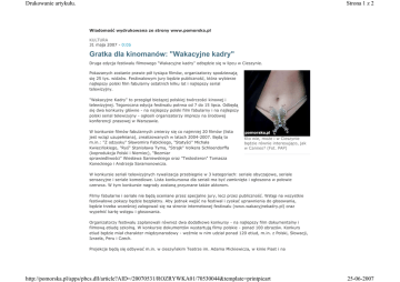 Drukowanie artykułu. Strona 1 z 2 Wiadomość wydrukowana ze strony www.pomorska.pl KULTURA 31 maja 2007 - 0:05 Gratka dla kinomanów: "Wakacyjne kadry" Druga edycja festiwalu filmowego "Wakacyjne kadry" odbędzie się w lipcu w Cieszynie. Pokazanych zostanie prawie pół tysiąca filmów, organizatorzy spodziewają się 25 tys. widzów. Festiwalowym jury będzie publiczność, która wybierze najlepszy polski film fabularny ostatnich kilku lat i najlepszy serial telewizyjny. "Wakacyjne Kadry" to przegląd bieżącej polskiej twórczości kinowej i telewizyjnej. Tegoroczna edycja festiwalu potrwa od 7 do 15 lipca. Odbędą się dwa konkursy główne - na najlepszy polski film fabularny i na najlepszy polski serial telewizyjny - ogłosili organizatorzy imprezy na środowej konferencji prasowej w Warszawie. W konkursie filmów fabularnych zmierzy się co najmniej 20 filmów (lista jest wciąż uzupełniana), zrealizowanych w latach 2004-2007. Będą to m.in.: "Z odzysku" Sławomira Fabickiego, "Statyści" Michała Kwiecińskiego, "Ryś" Stanisława Tyma, "Strajk" Volkera Schloendorffa (koprodukcja Polski i Niemiec), "Bezmiar sprawiedliwości" Wiesława Saniewskiego oraz "Testosteron" Tomasza Koneckiego i Andrzeja Saramonowicza. Kto wie, może i w Cieszynie będzie równie interesująco, jak w Cannes? (Fot. PAP) W konkursie seriali telewizyjnych rywalizacja przebiegnie w 3 kategoriach: seriale obyczajowe, seriale sensacyjne i seriale komediowe. Lista konkursowa dla seriali ma być zamknięta i ogłoszona w połowie czerwca. W tym konkursie nagrody zostaną przyznane także aktorom. Filmy fabularne i seriale nie będą oceniane przez specjalne jury, lecz przez publiczność. Wstęp na wszystkie festiwalowe pokazy będzie bezpłatny. Aby jednak wejść na festiwal i zyskać uprawnienia do głosowania, będzie trzeba wcześniej zalogować się na stronie internetowej festiwalu (www.wakacyjnekadry.pl) oraz wypełnić kartę wstępu i głosowania. Organizatorzy festiwalu zaplanowali również dwa dodatkowe konkursy - na najlepszy film dokumentalny i filmową etiudę szkolną. W konkursie dokumentów wystartują filmy polskie - ponad 100 obrazów. Konkurs etiud będzie miał charakter międzynarodowy - weźmie w nim udział ponad 120 etiud, m.in. z Polski, Słowacji, Izraela, Peru i Czech. Projekcje będą się odbywać m.in. w cieszyńskim Teatrze im. Adama Mickiewicza, w kinie Piast i na http://pomorska.pl/apps/pbcs.dll/article?AID=/20070531/ROZRYWKA01/70530044&template=printpicart 25-06-2007 Drukowanie artykułu. Strona 2 z 2 cieszyńskim Rynku. Teatr im. Adama Mickiewicza to najważniejszy ośrodek kulturalny Ziemi Cieszyńskiej. Jego secesyjny budynek wzniesiono w 1910 roku, według projektu budowniczych wiedeńskich. W teatrze tym kręcono niektóre sceny do filmu "Ziemia obiecana" Andrzeja Wajdy. Pokazom filmów towarzyszyć będą spotkania ze znanymi twórcami filmowymi i aktorami oraz wystawy - m.in. plakatów filmowych ze zbiorów Muzeum w Wilanowie. Zaplanowano także 11 koncertów - wśród wykonawców znajdzie się słynna w Czechach piosenkarka Vladivojna La Chia, która miesiąc wcześniej, w czerwcu, weźmie udział w trasie koncertowej Marylin Mansona. Głównym organizatorem festiwalu "Wakacyjne kadry" jest Urząd Miejski w Cieszynie. Równolegle, w dniach 7-8 lipca, w Cieszynie odbędzie się festiwal Nowa Muzyka. Wystąpią m.in. brytyjski kompozytor i dj Bonobo oraz Amon Tobin - muzyk który urodził się w Brazylii, a w latach 80. zamieszkał w Wielkiej Brytanii. Tobin stworzył własny gatunek muzyki, na który składają się m.in. rytmy typowe dla drum'n'base i hip hopu. Płyty obu tych muzyków wydaje znana brytyjska wytwórnia Ninja Tune. (PAP) GP Media sp. z o.o. - Bydgoszcz http://pomorska.pl/apps/pbcs.dll/article?AID=/20070531/ROZRYWKA01/70530044&template=printpicart 25-06-2007