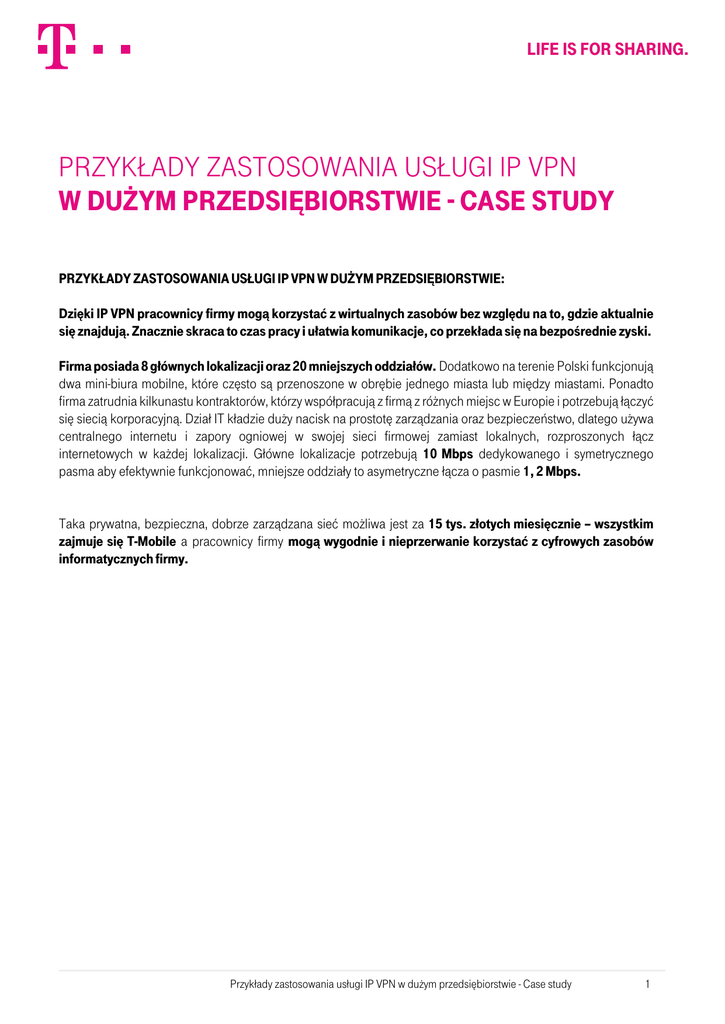 life is for sharing. przykłady zastosowania usługi ip vpn w dużym przedsiębiorstwie - case study PRZYKŁADY ZASTOSOWANIA USŁUGI IP VPN W DUŻYM PRZEDSIĘBIORSTWIE: Dzięki IP VPN pracownicy firmy mogą korzystać z wirtualnych zasobów bez względu na to, gdzie aktualnie się znajdują. Znacznie skraca to czas pracy i ułatwia komunikacje, co przekłada się na bezpośrednie zyski. Firma posiada 8 głównych lokalizacji oraz 20 mniejszych oddziałów. Dodatkowo na terenie Polski funkcjonują dwa mini-biura mobilne, które często są przenoszone w obrębie jednego miasta lub między miastami. Ponadto firma zatrudnia kilkunastu kontraktorów, którzy współpracują z firmą z różnych miejsc w Europie i potrzebują łączyć się siecią korporacyjną. Dział IT kładzie duży nacisk na prostotę zarządzania oraz bezpieczeństwo, dlatego używa centralnego internetu i zapory ogniowej w swojej sieci firmowej zamiast lokalnych, rozproszonych łącz internetowych w każdej lokalizacji. Główne lokalizacje potrzebują 10 Mbps dedykowanego i symetrycznego pasma aby efektywnie funkcjonować, mniejsze oddziały to asymetryczne łącza o pasmie 1, 2 Mbps. Taka prywatna, bezpieczna, dobrze zarządzana sieć możliwa jest za 15 tys. złotych miesięcznie – wszystkim zajmuje się T-Mobile a pracownicy firmy mogą wygodnie i nieprzerwanie korzystać z cyfrowych zasobów informatycznych firmy. Przykłady zastosowania usługi IP VPN w dużym przedsiębiorstwie - Case study 1