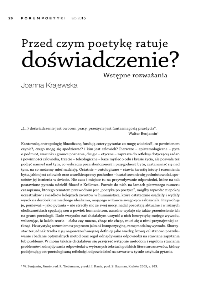 26 lato 2015 Przed czym poetykę ratuje doświadczenie? Wstępne rozważania Joanna Krajewska „(…) doświadczenie jest owocem pracy, przeżycie jest fantasmagorią przeżycia”. Walter Benjamin1 Kantowską antropologię filozoficzną fundują cztery pytania: co mogę wiedzieć?, co powinienem czynić?, czego mogę się spodziewać? i kim jest człowiek? Pierwsze – epistemologiczne – pyta o podmiot, warunki i granice poznania, drugie – etyczne – zaprasza do refleksji dotyczącej zadań i powinności człowieka, trzecie – teleologiczne – każe myśleć o celu i kresie życia, ale pozwala też podjąć namysł nad tym, co wykracza poza skończoność i przygodność bytu, zastanawiać się nad tym, na co możemy mieć nadzieję. Ostatnie – ontologiczne – stawia kwestię istoty i rozumienia bytu, jakim jest człowiek oraz wszelkie sprawy pochodne – kształtowanie się podmiotowości, sposobów jej istnienia w świecie. Nie czas i miejsce tu na przywoływanie odpowiedzi, które na tak postawione pytania udzielił filozof z Królewca. Powrót do nich na łamach pierwszego numeru czasopisma, którego tematem przewodnim jest „poetyka po poetyce”, mógłby wywołać niepokój uczestników i świadków kolejnych zwrotów w humanistyce, które ostatecznie osądziły i wydały wyrok na dorobek niemieckiego idealizmu, mającego w Kancie swego ojca założyciela. Przywołuję je, ponieważ – jako pytania – nie straciły nic ze swej mocy, nadal pozostają aktualne i w różnych okolicznościach spędzają sen z powiek humanistom, zasadne wydaje się także przeniesienie ich na grunt poetologii. Nade wszystko zaś chciałabym uczynić z nich heurystykę mojego wywodu, wskazując, iż każda teoria – słaba czy mocna, chcąc nie chcąc, musi się z nimi przynajmniej zetknąć. Heurystykę rozumiem tu po prostu jako oś kompozycyjną, ramę modalną wywodu. Skorzystać też jednak trzeba z jej najpowszechniejszej definicji jako wiedzy, której cel stanowi poszukiwanie i badanie optymalnych metod oraz reguł odnajdywania odpowiedzi na stawiane zapytania lub problemy. W moim tekście chciałabym się przyjrzeć wstępnie metodom i regułom stawiania problemów i odnajdywania odpowiedzi w wybranych tekstach polskich literaturoznawców, którzy podejmują post-poetologiczną refleksję i odpowiedzieć na zawarte w tytule artykułu pytanie. 1 W. Benjamin, Pasaże, red. R. Tiedemann, przekł. I. Kania, posł. Z. Bauman, Kraków 2005, s. 843. teorie | Joanna Krajewska, Przed czym ratuje poetykę doświadczenie? Poetyka po… czym? Refleksji literaturoznawczej zmierzyć się przyszło w ostatnich dekadach z filozoficznymi źródłami utraty bezpieczeństwa metafizycznego, oferowanego przez „wielkie narracje”. Źródła te scharakteryzował między innymi Richard Sheppard, który w pracy zatytułowanej Problematyka modernizmu europejskiego, będącej próbą syntezy europejskiego modernizmu (rozumianego jako prąd kulturowy obejmujący literaturę i sztukę schyłku XIX i pierwszego pięćdziesięciolecia XX wieku), zauważył, że u źródeł modernistycznej antropologii leży zmiana w postrzeganiu tego, co konstytuuje rzeczywistość i naturę ludzką oraz w odczuwaniu relacji między człowiekiem a rzeczywistością. Pierwsza z nich polegała na zakwestionowaniu newtonowskiego modelu wszechświata i euklidesowego pojmowania przestrzeni jako statycznej, niezmiennej i trójwymiarowej. Odkrycia Alberta Einsteina, Wernera Heisenberga czy Louis’a de Broglie udowodniły, że poza pozornie harmonijnym światem, który postrzegamy zmysłami, istnieje „metaświat” niemożliwy do opisania w kategoriach tradycyjnej fizyki przyczynowości, w którym obserwuje się nieciągłości, luki i brak regularności. Wzmiankowane odkrycia wzbudziły poczucie, że za dostępną potocznemu doświadczeniu rzeczywistością kryją się energie nieprzeniknione, a przez to niebezpieczne; przyczyniły się one również do redefinicji pojęć czasu i przestrzeni, kwestionowania zasadności ujmowania faktów w karby przyczynowo-skutkowych praw. Dziewiętnastowieczny humanista uważał, że człowiek obdarzony jest władzą rozumu, który pozwala sprawować kontrolę nad sobą samym, zło moralne i społeczne natomiast można według pozytywisty usunąć za pomocą wychowywania i reform. Jego optymizm etyczny i dobre samopoczucie zmącone zostały nowymi koncepcjami podmiotowości, wyrosłymi na gruncie tak zwanej Lebensphilosophie („filozofii życia”), którą uprawiali Artur Schopenhauer i Fryderyk Nietzsche (by wymienić tych najważniejszych) oraz freudowskiej psychoanalizy. Wspólną cechą tych szkół było przekonanie, że zachowanie człowieka determinowane jest pozaracjonalnymi siłami, tylko w ograniczonym stopniu poddaje się poznaniu i kontroli rozumu, wymuszającej stosowanie moralnych imperatywów: (…) człowiek Zachodu – pisze Sheppard, podsumowując dokonania Freuda – poczuł się głęboko zaniepokojony, ponieważ zdał sobie sprawę, że stłumione bóstwa i moce psychiczne przez nie reprezentowane nie znikną tylko dlatego, że on tego chce. I choć może próbować ukryć przed sobą samym wynikające stąd cierpienie psychiczne przez takie sublimacje, jak religia, kultura i poszukiwanie wiedzy, takie przeniesienia w ostatecznym rozrachunku są pozbawione mocy2. Psychoanaliza i „filozofia życia” inspirowały literaturę, która odtąd zaczyna się interesować destabilizacją osobowości bohaterów, wystawionych na działanie irracjonalnych sił, jakim wydawało się, że osiągnęli bezpieczną i stabilną tożsamość oraz demaskuje sposoby, dzięki którym iluzję tę udawało im się podtrzymywać. Jeśli chodzi o ostatnią zmianę, zmianę w postrzeganiu relacji człowieka i rzeczywistości, centralne dla doświadczenia modernistycznego jest poczucie wydziedziczenia, wygnania, radykalnego wyobcowania oraz nadchodzącej cywilizacyjnej katastrofy. Tragizm diagn