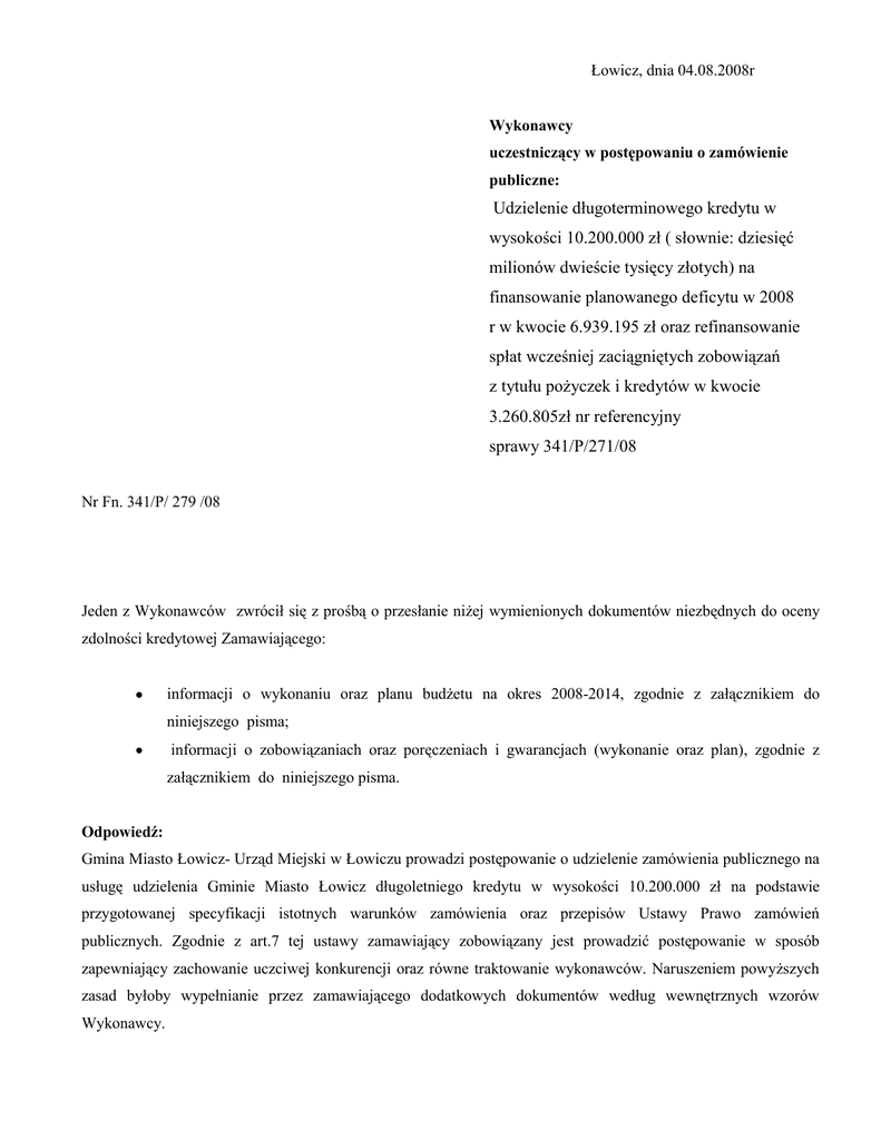 Łowicz, dnia 04.08.2008r Wykonawcy uczestniczący w postępowaniu o zamówienie publiczne: Udzielenie długoterminowego kredytu w wysokości 10.200.000 zł ( słownie: dziesięć milionów dwieście tysięcy złotych) na finansowanie planowanego deficytu w 2008 r w kwocie 6.939.195 zł oraz refinansowanie spłat wcześniej zaciągniętych zobowiązań z tytułu pożyczek i kredytów w kwocie 3.260.805zł nr referencyjny sprawy 341/P/271/08 Nr Fn. 341/P/ 279 /08 Jeden z Wykonawców zwrócił się z prośbą o przesłanie niżej wymienionych dokumentów niezbędnych do oceny zdolności kredytowej Zamawiającego: informacji o wykonaniu oraz planu budżetu na okres 2008-2014, zgodnie z załącznikiem do niniejszego pisma; informacji o zobowiązaniach oraz poręczeniach i gwarancjach (wykonanie oraz plan), zgodnie z załącznikiem do niniejszego pisma. Odpowiedź: Gmina Miasto Łowicz- Urząd Miejski w Łowiczu prowadzi postępowanie o udzielenie zamówienia publicznego na usługę udzielenia Gminie Miasto Łowicz długoletniego kredytu w wysokości 10.200.000 zł na podstawie przygotowanej specyfikacji istotnych warunków zamówienia oraz przepisów Ustawy Prawo zamówień publicznych. Zgodnie z art.7 tej ustawy zamawiający zobowiązany jest prowadzić postępowanie w sposób zapewniający zachowanie uczciwej konkurencji oraz równe traktowanie wykonawców. Naruszeniem powyższych zasad byłoby wypełnianie przez zamawiającego dodatkowych dokumentów według wewnętrznych wzorów Wykonawcy. sprawozdania z wykonania budżetu jednostki samorządu terytorialnego za rok ubiegły i za ostatni okres sprawozdawczy wraz z informacją o stanie zobowiązań i udzielonych gwarancji i poręczeń ( za ostatni okres sprawozdawczy w formie sprawozdań Rb-NDS, Rb-PDP, Rb-Z lub sprawozdania S-01 na wzorze przedstawionym przez Bank; Odpowiedź: Zamawiający przekazuje, w załączeniu sprawozdania: 1. Rb- NDS za 2007 rok – Załącznik Nr 1 do niniejszego pisma, 2. Rb- NDS II kwartał 2008 rok - Załącznik Nr 2 do niniejszego pisma, 3. Rb- Z za 2007 rok Załącznik Nr 3 do niniejszego pisma, 4. Rb- Z za II kwartał 2008 rok Załącznik Nr 4 do niniejszego pisma, 5. Rb – PDP za 2007 rok Załącznik Nr 5 do niniejszego pisma, 6. Rb – PDP II kwartał 2008 rok Załącznik Nr 6 do niniejszego pisma. założeń dot. planów budżetowych w okresie 2008-2014 z uwzględnieniem: a) tempa wzrostu dochodów oraz wydatków bieżących, b) zestawienie zobowiązań przypadających do spłat ( harmonogramy spłat rat kredytów i pożyczek, oprocentowanie kredytów i pożyczek ), c) założeń dotyczących wydatków inwestycyjnych, d) założeń dotyczących stanu udzielonych gwarancji i poręczeń. Odpowiedź: Założenia dot. planów budżetowych w okresie 2008 – 2014 przestawia Załącznik Nr 18 do Uchwały Nr XIX/169/2007 Rady Miejskiej w Łowiczu z dnia 27 grudnia 2007 roku w sprawie uchwalenia budżetu Miasta Łowicza na 2008 rok. Dokument jest dostępny na stronie internetowej Urzędu Miejskiego w Łowiczu http://www.lowicz.eu w Biuletynie Informacji Publicznej w zakładce „Finanse, podatki, opłaty, majątek – Budżet”. Zgodnie a art.38 ustawy z dnia 29 stycznia 2004r Prawo Zamówień Publicznych (Dz. U.z 2007 r Nr 223 poz.1655) przedstawiam wyjaśnienia dotyczące specyfikacji istotnych warunków zamówienia (SIWZ) dla przetargu nieograniczonego: „Udzielenie długoterminowego kredytu w wysokości 10.200.000 zł ( słownie: dziesięć milionów dwieście tysięcy złotych) na finansowanie planowanego deficytu w 2008 r w kwocie 6.939.195 zł oraz refinansowanie spłat wcześniej zaciągniętych zobowiązań z tytułu pożyczek i kredytów w kwocie 3.260.805 zł., nr referencyjny sprawy 341/P/271/08 w związku z zapytaniami zgłoszonymi przez wykonawców. Załączniki: 1) Formularz ofertowy – Załącznik nr 1 2) Formularz cenowy – Załącznik nr 2 3) Projekt umowy – Załącznik nr 3
