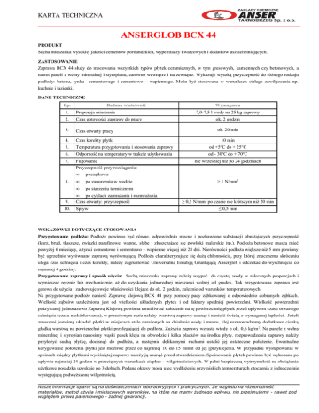 KARTA TECHNICZNA ANSERGLOB BCX 44 PRODUKT Sucha mieszanka wysokiej jakości cementów portlandzkich, wypełniaczy kwarcowych i dodatków uszlachetniających. ZASTOSOWANIE Zaprawa BCX 44 służy do mocowania wszystkich typów płytek ceramicznych, w tym gresowych, kamiennych czy betonowych, a nawet paneli z wełny mineralnej i styropianu, zarówno wewnątrz i na zewnątrz. Wykazuje wysoką przyczepność do różnego rodzaju podłoży: betonu, tynku cementowego i cementowo – wapiennego. Może być stosowana w warunkach stałego zawilgocenia np. kuchnie i łazienki. DANE TECHNICZNE Lp. Badana właściwość 1. Proporcja mieszania 2. Czas gotowości zaprawy do pracy 3. Czas otwarty pracy 4. Czas korekty płytki 5. Temperatura przygotowania i stosowania zaprawy 6. Odporność na temperatury w trakcie użytkowania 7. Fugowanie Przyczepność przy rozciąganiu: 8. • początkowa • po zanurzeniu w wodzie • po starzeniu termicznym 9. • po cyklach zamrażania i rozmrażania Czas otwarty: przyczepność 10. Spływ Wymagania 7,0-7,5 l wody na 25 kg zaprawy ok. 2 godzin ok. 20 min 10 min od +5°C do + 25°C od - 30ºC do + 70ºC nie wcześniej niż po 24 godzinach ≥ 1 N/mm2 ≥ 0,5 N/mm2 po czasie nie krótszym niż 20 min ≤ 0,5 mm WSKAZÓWKI DOTYCZĄCE STOSOWANIA Przygotowanie podłoża: Podłoże powinno być równe, odpowiednio mocne i pozbawione substancji obniżających przyczepność (kurz, brud, tłuszcze, związki parafinowe, wapno, słabe i złuszczające się powłoki malarskie itp.). Podłoża betonowe muszą mieć powyżej 6 miesięcy, a tynki cementowe i cementowo – wapienne więcej niż 28 dni. Nierówności podłoża większe niż 5 mm powinny być uprzednio wyrównane zaprawą wyrównującą. Podłoża charakteryzujące się dużą chłonnością, przy której znacznemu skróceniu ulega czas schnięcia i czas korekty, należy zagruntować Uniwersalną Emulsją Gruntującą Anserglob i odczekać do wyschnięcia co najmniej 4 godziny. Przygotowanie zaprawy i sposób użycia: Suchą mieszankę zaprawy należy wsypać do czystej wody w zalecanych proporcjach i wymieszać ręcznie lub mechanicznie, aż do uzyskania jednorodnej mieszanki wolnej od grudek. Tak przygotowana zaprawa jest gotowa do użycia i zachowuje swoje właściwości klejące do ok. 2 godzin, zależnie od warunków temperaturowych. Na przygotowane podłoże nanieść Zaprawę klejową BCX 44 przy pomocy pacy ząbkowanej o odpowiednio dobranych ząbkach. Wielkość ząbków uzależniona jest od wielkości układanych płytek i od faktury spodniej powierzchni. Wielkość powierzchni pokrywanej jednorazowo Zaprawą Klejową powinna umożliwiać nałożenie na tę powierzchnię płytek przed upływem czasu otwartego schnięcia (czasu naskórkowania), w przeciwnym razie należy warstwę zaprawy usunąć i nanieść świeżą o wymaganej lepkości. Jeżeli zmuszeni jesteśmy układać płytki w miejscach stale narażonych na działanie wody i mrozu, klej rozprowadzamy dodatkowo cienką gładką warstwą na powierzchni płytki przylegającej do podłoża. Zużycia zaprawy wzrasta wtedy o ok. 0,6 kg/m 2. Na panele z wełny mineralnej i styropian nanosimy wąski pasek kleju na obwodzie i kilka placków na środku płyty. rozprowadzeniu zaprawy należy przyłożyć suchą płytkę, docisnąć do podłoża, a następnie delikatnymi ruchami ustalić jej ostateczne położenie. Ewentualne korygowanie położenia płytki jest możliwe przez co najmniej 10 do 15 minut od jej [przyklejenia. W przypadku występowania w spoinach między płytkami wyciśniętej zaprawy należy ją usunąć przed stwardnieniem. Spoinowanie płytek powinno być wykonane po upływie najmniej 24 godzin w przeciętnych warunkach cieplno – wilgotnościowych. W pełni bezpieczną wytrzymałość na obciążenia użytkowe posadzka uzyskuje po 3 dobach. Podane okresy mogą ulec wydłużeniu przy niskich temperaturach otoczenia z jednocześnie występującą podwyższoną wilgotnością. Nasze informacje oparte są na doświadczeniach laboratoryjnych i praktycznych. Ze względu na różnorodność materiałów, metod użycia i miejscowych warunków, na które nie mamy żadnego wpływu, nie przejmujemy - nawet pod względem prawa patentowego - żadnej gwarancji. KARTA TECHNICZNA ZUŻYCIE: Wymiar zębów pacy Przybliżone zużycie zaprawy BCX 44 [kg/m 2] Płytki o boku do 10 cm 4 mm 2,2 ÷ 3,5 Płytki o boku do 15 cm Płytki o boku do 25 cm Płytki o boku do 30 cm 6 mm 8 mm 10 mm 2,5 ÷ 4,5 3,2 ÷ 5,5 3,8 ÷ 6,5 Rodzaj płytki Uwaga: Niniejsza instrukcja określa zakres stosowania materiału i zalecany sposób prowadzenia robót, ale nie może zastąpić zawodowego przygotowania wykonawcy. Oprócz podanych zaleceń prace należy wykonywać zgodnie ze sztuką budowlaną i zasadami BHP. MAGAZYNOWANIE Przechowywać w oryginalnie zamkniętych opakowaniach, w suchych przewiewnych pomieszczeniach nie dłużej niż 12 miesięcy od daty produkcji. Chronić przed zawilgoceniem. GWARANCJA Producent przyjmuje odpowiedzialność gwarancyjną za jakość produktu jedynie w przypadku zastosowania się użytkownika do zaleceń instrukcji producenta, przy jednoczesnym przestrzeganiu podstawowych zasad sztuki budowlanej i zasad BHP. OPAKOWANIE Dwuwarstwowe worki papierowe z przekładką PE – 25 kg. ATESTY Wyrób spełnia wymagania PN-EN 12004:2008 dla kleju cementowego typu C2T Atest higieniczny - Państwowy Zakład Higieny nr HK/B/0836/03/2008 Zakłady Chemiczne ANSER-TARNOBRZEG Sp. z o.o. 39-400 Tarnobrzeg, ul. Zakładowa 48 tel.: 15 641 63 07 do 09, faks: 15 641 63 22 Nasze informacje oparte są na doświadczeniach laboratoryjnych i praktycznych. Ze względu na różnorodność materiałów, metod użycia i miejscowych warunków, na które nie mamy żadnego wpływu, nie przejmujemy - nawet pod względem prawa patentowego - żadnej gwarancji.