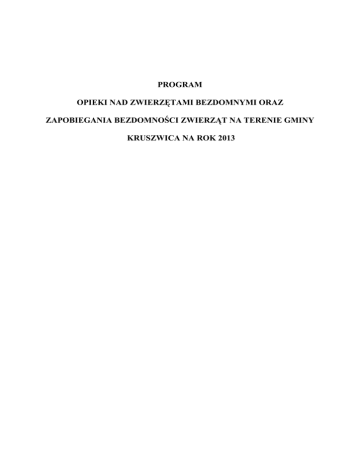 PROGRAM OPIEKI NAD ZWIERZĘTAMI BEZDOMNYMI ORAZ ZAPOBIEGANIA BEZDOMNOŚCI ZWIERZĄT NA TERENIE GMINY KRUSZWICA NA ROK 2013 Postanowienia ogólne Celem Programu jest zapewnienie opieki nad zwierzętami bezdomnymi oraz przeciwdziałanie bezdomności zwierząt na obszarze Gminy. Program jest wyrazem wypełnienia obowiązku prawnego nałożonego na gminy. Realizacja działań w zakresie opieki nad zwierzętami bezdomnymi i przeciwdziałania bezdomności zwierząt odbywa się przy wzajemnej współpracy: 1) Urzędu Miejskiego w Kruszwicy, 2) Powiatowego Lekarza Weterynarii w Inowrocławiu, 3) Policji, 4) upoważnionego przedstawiciela organizacji społecznej, których statutowym celem działania jest ochrona zwierząt. Program określa działania dotyczące: 1) zapewnienia opieki bezdomnym zwierzętom miejsca w schronisku dla zwierząt, 2) opiekę nad wolno żyjącymi kotami w tym ich dokarmianie, 3) odławiania bezdomnych zwierząt, 4) obligatoryjną sterylizację albo kastrację zwierząt w schroniskach dla zwierząt, 5) poszukiwanie właścicieli dla bezdomnych zwierząt, 6) usypianie ślepych miotów, 7) wskazanie gospodarstwa rolnego w celu zapewnienia miejsca dla zwierząt gospodarskich, 8) zapewnienie całodobowej opieki weterynaryjnej zwierzętom poszkodowanym w wypadkach drogowych na terenie Gminy Kruszwica. OPIEKA NAD BEZDOMNYMI ZWIERZĘTAMI I SPOSOBY ZAPOBIEGANIA BEZDOMNOŚCI 1. Do obowiązków Gminy należy podejmowanie działań mających na celu sprawowanie opieki nad zwierzętami bezdomnymi oraz zapobieganie zjawisku bezdomności wśród zwierząt. Zapewnienie opieki bezdomnym zwierzętom z terenu Gminy Kruszwica polegać powinno w szczególności na poszukiwaniu nowych właścicieli dla zwierząt oraz zachęcaniu mieszkańców do dokonywania adopcji. Poszukiwanie nowych właścicieli oraz prowadzenie akcji i propagowanie postaw, mających na celu zachęcanie mieszkańców do dokonywania adopcji psów i kotów jest jednym z najbardziej efektywnych sposobów przeciwdziałania bezdomności zwierząt. Problem bezdomności psów nie może zostać rozwiązany bez pomocy i wsparcia mieszkańców, w związku z czym Gmina powinna dążyć do wprowadzenia wszelkich mechanizmów zachęcających do adopcji. Problem bezdomności zwierząt na terenie Gminy Kruszwica jest szczególnie dostrzegalny w okresie letnim (wakacyjnym). Liczba porzucanych wtedy zwierząt drastycznie wzrasta. Wyjeżdzający na wakacje właściciele czworonogów zostawiają swoje zwierzęta, porzucają w ustronnych miejscach, przywiązują do drzew lub też w inny sposób się ich pozbywają. Oprócz oczywistego braku wrażliwości, odpowiedzialności i wyobraźni, takie zachowanie cechuje się również dużym okrucieństwem i powinno zostać stanowczo potępione. Opieka nad zwierzętami bezdomnymi na obszarze Gminy Kruszwica wykonywana jest na podstawie umowy z Przedsiębiorstwem Gospodarki Komunalnej i Mieszkaniowej Sp. z o. o w Inowrocławiu, prowadzącym Schronisko dla Zwierząt w Inowrocławiu. Umowa dotyczy odławiania zwierząt bezdomnych oraz utrzymania i sprawowania opieki nad nimi w Schronisku. OPIEKA NAD WOLNO ŻYJĄCYMI KOTAMI I ICH DOKARMIANIE 2. Kluczową kwestią w zakresie działań podejmowanych na rzecz opieki nad kotami jest rozróżnienie zwierząt bezdomnych od kotów wolno żyjących. Koty wolno bytujące od urodzenia nie posiadały ani właściciela ani opiekuna i zazwyczaj nie potrzebują tego rodzaju pomocy, w odróżnieniu od kotów bezdomnych, zagubionych lub porzuconych przez dotychczasowych właścicieli. Zdrowe zwierzę wolno bytujące nie pozwoli człowiekowi się pochwycić, a chore i niezdolne do ucieczki będzie utrudniało działania zmierzające do pomocy. Kot domowy, natomiast, jest przyzwyczajony do obecności ludzi i sam szuka towarzystwa człowieka. Obserwacja reakcji i zachowania zwierzęcia pozwala na właściwą kwalifikację napotkanego kota i dobranie właściwej ścieżki postępowania w zastanej sytuacji. Zapobieganie bezdomności kotów opiera się na zapewnieniu opieki zagubionym i porzuconym kotom z terenu Gminy, w szczególności poprzez zapewnienie im miejsca w schronisku oraz poszukiwanie nowych właścicieli. Opieka nad kotami wolno żyjącymi różni się od działań podejmowanych na rzecz zwierząt bezdomnych i polega głównie na ich dokarmianiu. Zwierzęta przebywające na terenie danej Gminy, w zależności od stopnia jej zurbanizowania, mają zazwyczaj coraz większe trudności z utrzymaniem się przy życiu. Brak dostępu do niezamieszkanych ciepłych pomieszczeń, szczelnie zamknięte pojemniki z odpadami oraz rozbudowa infrastruktury kosztem powierzchni środowiska naturalnego niejednokrotnie uniemożliwia samodzielne bytowanie. Okresem szczególnie uciążliwym jest sezon zimowy, podczas którego niskie temperatury stanowią dodatkowe zagrożenie dla życia zwierząt nie posiadających domu. Dostarczenie posiłków kotom wolno żyjącym umożliwia ich przetrwanie w przypadku braku możliwości samodzielnego zdobycia pokarmu. Należy pamiętać, że dokarmianie kotów powoduje, że stają się one uzależnione od dokarmiających i aby pomoc zapewniana zwierzętom nie przynosiła szkody, powinna być ona regularna i długofalowa. Opieka nad kotami wolno żyjącymi, w tym ich dokarmianie, mieści się w zakresie zadań własnych Gminy. Koty bezdomne podlegają pod taką samą formę opieki jak pozostałe zwierzęta, a wolnożyjące należy dokarmiać – może to się odbywać za pośrednictwem wolontariuszy, młodzieży szkolnej, mieszkańców Gminy, pracowników Urzędu Miejskiego. ODŁAWIANIE BEZDOMNYCH ZWIERZĄT 3. Gmina Kruszwica na bieżąco rozwiązuje problem bezdomnych psów poprzez odławianie i umieszczanie ich w Schronisku dla Zwierząt w Inowrocławiu. Psy są odławiane po otrzymaniu zgłoszeń dotyczących sytuacji i miejsca pobytu bezdomnych zwierząt. Odławianiem i przewożeniem bezdomnych zwierząt z terenu Gminy Kruszwica zajmuje się Pr