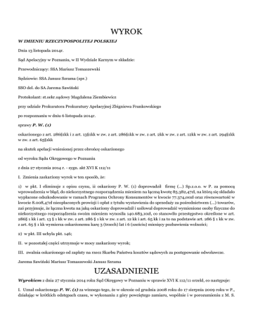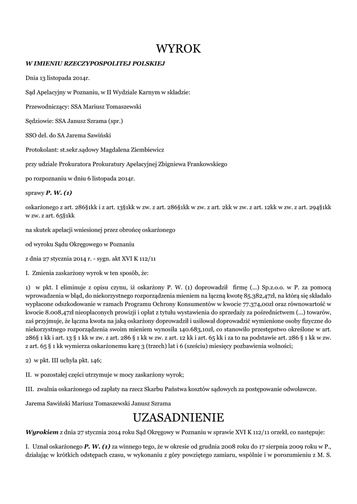 WYROK W IMIENIU RZECZYPOSPOLITEJ POLSKIEJ Dnia 13 listopada 2014r. Sąd Apelacyjny w Poznaniu, w II Wydziale Karnym w składzie: Przewodniczący: SSA Mariusz Tomaszewski Sędziowie: SSA Janusz Szrama (spr.) SSO del. do SA Jarema Sawiński Protokolant: st.sekr.sądowy Magdalena Ziembiewicz przy udziale Prokuratora Prokuratury Apelacyjnej Zbigniewa Frankowskiego po rozpoznaniu w dniu 6 listopada 2014r. sprawy P. W. (1) oskarżonego z art. 286§1kk i z art. 13§1kk w zw. z art. 286§1kk w zw. z art. 2kk w zw. z art. 12kk w zw. z art. 294§1kk w zw. z art. 65§1kk na skutek apelacji wniesionej przez obrońcę oskarżonego od wyroku Sądu Okręgowego w Poznaniu z dnia 27 stycznia 2014 r. - sygn. akt XVI K 112/11 I. Zmienia zaskarżony wyrok w ten sposób, że: 1) w pkt. I eliminuje z opisu czynu, iż oskarżony P. W. (1) doprowadził firmę (...) Sp.z.o.o. w P. za pomocą wprowadzenia w błąd, do niekorzystnego rozporządzenia mieniem na łączną kwotę 85.382,47zł, na którą się składało wypłacone odszkodowanie w ramach Programu Ochrony Konsumentów w kwocie 77.374,00zł oraz równowartość w kwocie 8.008,47zł nieopłaconych prowizji i opłat z tytułu wystawienia do sprzedaży za pośrednictwem (...) towarów, zaś przyjmuje, że łączna kwota na jaką oskarżony doprowadził i usiłował doprowadzić wymienione osoby fizyczne do niekorzystnego rozporządzenia swoim mieniem wynosiła 140.683,10zł, co stanowiło przestępstwo określone w art. 286§ 1 kk i art. 13 § 1 kk w zw. z art. 286 § 1 kk w zw. z art. 12 kk i art. 65 kk i za to na podstawie art. 286 § 1 kk w zw. z art. 65 § 1 kk wymierza oskarżonemu karę 3 (trzech) lat i 6 (sześciu) miesięcy pozbawienia wolności; 2) w pkt. III uchyla pkt. 146; II. w pozostałej części utrzymuje w mocy zaskarżony wyrok; III. zwalnia oskarżonego od zapłaty na rzecz Skarbu Państwa kosztów sądowych za postępowanie odwoławcze. Jarema Sawiński Mariusz Tomaszewski Janusz Szrama UZASADNIENIE Wyrokiem z dnia 27 stycznia 2014 roku Sąd Okręgowy w Poznaniu w sprawie XVI K 112/11 orzekł, co następuje: I. Uznał oskarżonego P. W. (1) za winnego tego, że w okresie od grudnia 2008 roku do 17 sierpnia 2009 roku w P., działając w krótkich odstępach czasu, w wykonaniu z góry powziętego zamiaru, wspólnie i w porozumieniu z M. S. (1) oraz G. O., a także z pomocą innej ustalonej osoby, doprowadził albo usiłował doprowadzić szereg osób fizycznych oraz firmę (...) Sp. z o.o. w P. za pomocą wprowadzenia w błąd do niekorzystnego rozporządzenia mieniem o łącznej wartości 216.065,57 zł w ten sposób, że po uprzednim założeniu na wyszukane przez M. S. (1) lub G. O. osoby lub uzyskaniu dostępu do co najmniej 23 rachunków bankowych oraz uzyskaniu za ich pośrednictwem niezbędnych danych umożliwiających internetową obsługę tych rachunków, nadto korzystając z uprzednio zarejestrowanych przez siebie na fikcyjne osoby kont użytkowników portalu (...) oraz jednego konta w portalu ogłoszeniowym (...), oferował do sprzedaży towary w postaci sprzętu elektronicznego, których w rzeczywistości nie posiadał, nie mając zamiaru wywiązania się z powziętych zobowiązań, po czym przyjmował wpłaty na wskazane kontrolowane przez siebie rachunki bankowe, z których podejmował następnie, po dokonaniu transferów tych środków pomiędzy poszczególnymi rachunkami, środki pieniężne w drodze dokonywanych osobiście z pomocą innej ustalonej osoby albo przez M. S. (1) wypłat gotówkowych, wskutek czego doprowadził szereg użytkowników portalu internetowego (...) oraz jednego użytkownika portalu (...) do strat w łącznej kwocie 85.105,10 zł, usiłował doprowadzić do niekorzystnego rozporządzenia mieniem w kwocie 45.578,00 zł co najmniej 43 innych użytkowników portalu (...), doprowadził do strat w mieniu firmy (...) Sp. z o.o. w P. w łącznej kwocie 77.374,00 zł wskutek wypłaty powyższej kwoty tytułem odszkodowania w ramach Programu Ochrony Kupujących oraz doprowadził do niekorzystnego rozporządzenia mieniem firmę (...) Sp. z o.o. w P. poprzez nieuiszczenie kwoty co najmniej 8.008,47 zł stanowiącej równowartość nieopłaconych prowizji i opłat z tytułu wystawienia do sprzedaży za pośrednictwem portalu (...), i tak w szczególności: 1. w dniu 3 grudnia 2008 r. posługując się nazwą użytkownika portalu (...)(...)– S. S. (1), po uprzednim wystawieniu oferty sprzedaży konsoli P. (...) w cenie 1000 zł doprowadził do niekorzystnego rozporządzenia mieniem D. N. (1) w kwocie 1000 zł przelanych przez kupującego na wskazany mu rachunek prowadzony przez (...) Bank S.A. o nr (...) dla S. S. (1), 2. w dniu 4 grudnia 2008 r. posługując się nazwą użytkownika portalu(...) (...) – S. S. (1), po uprzednim wystawieniu oferty sprzedaży telefonu komórkowego (...) w cenie 1000 zł doprowadził do niekorzystnego rozporządzenia mieniem R. O. w kwocie 400 zł przelanych przez kupującego na wskazany mu rachunek prowadzony przez (...) Bank (...) S.A. o nr (...) dla A. M. (1), 3. w dniu 6 stycznia 2009 r. posługując się nazwą użytkownika portalu (...) „(...)” – A. M. (1), po uprzednim wystawieniu oferty sprzedaży laptopa marki T. w cenie 1500 zł doprowadził do niekorzystnego rozporządzenia mieniem K. S. (1) w kwocie 800 zł przelanych przez kupującego na wskazany mu rachunek prowadzony przez (...) Bank (...) S.A. o nr (...) dla A. M. (1), 4. w dniu 19 stycznia 2009 r. działając wspólnie i w porozumieniu z M. S. (1) i G. O. oraz z pomocą innej ustalonej osoby posługując się nazwą użytkownika portalu (...) „(...)” – A. F. (1), po uprzednim wystawieniu oferty sprzedaży telefonu komórkowego S. (...) model (...)w cenie 950 zł doprowadził do niekorzystnego rozporządzenia mieniem R. C. w kwocie 730 zł wpłaconych przez kupującą na wskazany jej rachunek prowadzony przez (...) Bank (...) S.A. o nr (...) dla B. S. (1), 5. w dniu 20 stycznia 2009 r. działając w