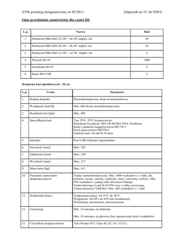 ZTM-przetarg nieograniczony nr 92/2011 Załącznik nr 1C do SIWZ Opis przedmiotu zamówienia dla części III. L.p. Nazwa Ilość 1. Patchcord MM OM3 LC/PC - SC/PC duplex 3m 20 2. Patchcord MM OM3 SC/PC - SC/PC duplex 2m 10 3. Patchcord MM OM3 LC/PC - LC/PC duplex 1m 2 4. Wtyczki RJ-45 5. Zaciskarka RJ-45 2 6. Karta SD 8 GB 2 1000 Drukarka kart plasitkowych - 20 szt. L.p. Cecha Parametry 1. Rodzaj drukarki: Monochromatyczna, druk termotransferowy 2. Wydajność [kart/h]: Min. 400 (karty monochromatyczne) 3. Rozdzielczość [dpi] Min. 300 4. Specyfikacja kart: Typ: PVC, PVC kompozytowe Szerokość/wysokość: ISO CR-80 ISO 7810, 54x86mm Karta z paskiem magnetycznym ISO 7811 Karta procesorowa ISO7816 Grubość kart: 30 mil (0.76 mm) 5. Interfejs: Port USB, Ethernet (opcjonalnie) 6. Szerokość [mm]: Max. 202 7. Głębokość [mm]: Max. 329 8. Wysokość [mm]: Max. 217 9. Masa netto [kg]: Max. 4.5 10. Parametry materiałów eksploatacyjnych Taśmy monochromatyczne: Min. 1000 wydruków z 1 rolki, dla kolorów czerny, zielony, niebieski, złoty, czerwony, srebrny; Min. 850 wydruków z jednej rolki dla koloru białego Taśma barwiąca Load-N-GoTM wraz z rolką czyszczącą Taśma kolorowa YMCKO: Min. 200 wydruków z 1 rolki 11. Środowisko pracy: Temperatura pracy: od 15°C do 30°C Wilgotność: od 20% do 65% bez kondensacji Wentylacja: powietrzem, niewymuszona 12. Gwarancja Min. 24 miesiące na drukarkę Min. 24 miesiące na głowicę (bez ograniczenia ilości wydruków) 13. Certyfikaty bezpieczeństwa Tak (Normy FCC Class B, CE, UL i CUL) ZTM-przetarg nieograniczony nr 92/2011 Załącznik nr 1C do SIWZ Drukarka etykiet/kodów kreskowych – 10 szt. Lp. Cecha Parametry 1. Drukowanie Min. rozdzielczość 300 dpi 2. Technologia Termiczna 3. Szybkość druku Min. 40 etykiet na minutę 4. Szerokość etykiet Do 60 mm 5. Złącze USB 6. Zgodność z komputerami PC i Mac 7. Standardy drukowanych kodów kreskowych Code 39, Code 128, Codabar, UPC A/E, EAN 8/13, EAN 128, ITF-14 oraz Interleaved 2 of 5 8. Funkcje Automatyczne cofanie pierwszej etykiety Funkcja zwalniania etykiety, upraszczająca wyjmowanie etykiet 9. Gwarancja Min. 12 miesięcy Skaner kodów kreskowych – 10 szt. Lp. Cecha Parametry 1. Źródło światła Dioda laserowa 650nm 2. Szybkość odczytu Min. 100 odczytów na sekundę 3. Rodzaje odczytywanych kodów UPC/EAN, UCC/EAN 128, Code 39, Code 39 Full ASCII, Code 39 Tri Optic, Code 128, Code 128 Full ASCII, Codabar, Interleaved 2 of 5, Discrete 2 of 5, Code 93, MSI, Code 11, IATA, RSS variants, Chinese 2 of 5 4. Rodzaje interface’ów RS232, emulacja klawiatury, Wand, IBM 468X/9X, USB oraz możliwość podłączenia innych poprzez kabel SYNAPSE 5. Napięcie zasilania 5 V +/- 10% 6. Typ Skanera Bi-directional 7. Klasa lasera CDRH Cass II, IEC Cass II 8. Temperatura pracy 0 – 50°C 9. Temperatura -40 – 70°C przechowywania 10. Wilgotność 5% - 95% 11. Odporność na upadek Wielokrotny upadek z wysokości 1.5m na beton 12. Waga Max 146 gm (bez kabla) 13. Akcesoria Podstawka w zestawie (P/N20-61019-01), kable połączeniowe ZTM-przetarg nieograniczony nr 92/2011 Załącznik nr 1C do SIWZ RS232, PS2, USB - w zależności od konfiguracji 14. Wymiary Max. 15,2 cm H x 6,3 cm W x 8,4 cm 15. Kolory Jasny biurowy lub czarny 13. Gwarancja Min. 5 lat gwarancji. Naprawy realizowane są przez autoryzowany serwis Symbola w Polsce. Czas pobytu w serwisie uszkodzonego sprzętu nie przekracza 3 dni roboczych. Jeżeli nie możliwa jest naprawa sprzętu w powyższym czasie to wypożyczany jest sprzęt zastępczy na życzenie Klienta. Wypożyczenie jest bezpłatne w okresie gwarancyjnym, w okresie pogwarancyjnym płatne max. 1% ceny detalicznej sprzętu za każdy dzień wypożyczenia. Koszt przesyłki do/z naprawy pokrywa firma serwisowa w okresie gwarancyjnym. W cenie czytników bezpłatna linia całodobowej pomocy telefonicznej realizowana przez pracowników serwisu Symbola. Za dodatkową opłatą są dostępne inne usługi serwisowe, np. szybka naprawa (48 godzin lub 24 godziny), serwis w siedzibie klienta (4, 24 lub 48 godzin), instalacja sprzętu, szkolenie, wydłużony okres gwarancji. Serwis Rzutnik multimedialny – 3 szt. Lp. Cecha Wymagane minimalne parametry techniczne monitora 1. System projekcyjny: 3LCD-Technology 2. LCD: Urządzenie Ustawienia Rozdzielczości: 1280x720 pixel 3. Projekcja: ręczne ustawianie powiększenia ręczne ustawianie ostrości F = 2 - 3.17 f = 22.5 - 47.2 4. Powiększenie: 1:2.1() 5. Lampa: typ: 170 W UHE (E-TORL) - lampa godzin eksploatacji: ≤ 3000 godziny 6. Właściwości obiektywu: Korekta Keystone (cyfrowa): ± 15 ° (pionowo) Korekta Keystone (ręczna): V ±102% / H ±50% Jasność obrazu: Min. 1600 ANSI Lumen Stosunek kontrastu: Min. 10,000:1 Odtwarzanie kolorów: Min. 32 bit Min. 16777216 (Kolor) 7. Sygnały video: Composite Video, komponenty wideo 8. Interfejsy: HDMI 1 x RS-232C S-Video 9. Wymiary: Max. 406 x 310 x 124 mm (szer. x głęb. x wysok.) 10. Masa: Max. 5.4kg 11. Poziom hałasu: < 26 dB(A) ZTM-przetarg nieograniczony nr 92/2011 12. Gwarancja: Załącznik nr 1C do SIWZ Min. 3 lata serwisu na miejscu. Komputer – 25 szt. Lp. Cecha 1. 11. Typ Wymagane minimalne parametry techniczne komputerów Komputer stacjonarny. W ofercie wymagane jest podanie modelu, symbolu oraz producenta 2. Zastosowanie Komputer będzie wykorzystywany dla potrzeb aplikacji biurowych, aplikacji edukacyjnych, aplikacji obliczeniowych, dostępu do internetu oraz poczty elektronicznej, jako lokalna baza danych, stacja programistyczna 3. Wydajność obliczeniowa Procesor powinien osiągać w teście wydajności PassMark PerformanceTest (wynik dostępny: http://www.passmark.com/products/pt.htm) co najmniej wynik 3959 punktów Passmark CPU Mark (wynik na dzień 14/07/2011) 4. Pamięć operacyjna 2GB (1x2048MB) 1333 MHz możliwość rozbudowy do min 8GB, RAM 5. Parametry pamieci masowej Min. 250 GB SATA, 7200 obr./min. 6. Wydajność grafiki Grafika zintegrowana z procesorem po