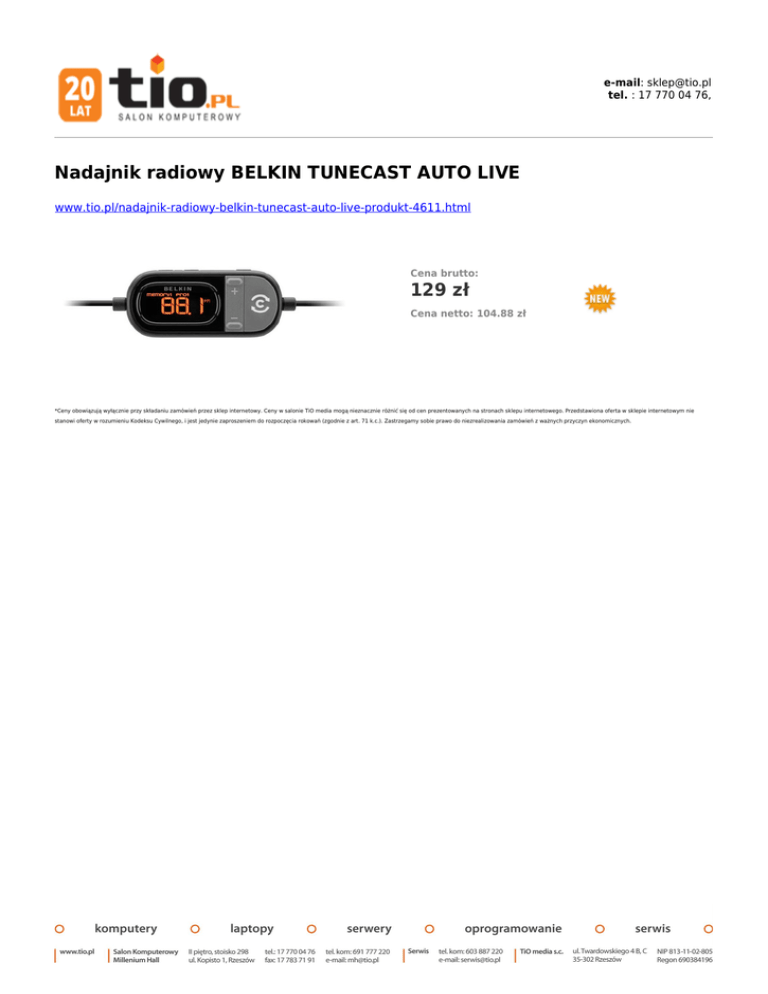e-mail: [email protected] tel. : 17 770 04 76, Nadajnik radiowy BELKIN TUNECAST AUTO LIVE www.tio.pl/nadajnik-radiowy-belkin-tunecast-auto-live-produkt-4611.html Cena brutto: 129 zł Cena netto: 104.88 zł *Ceny obowiązują wyłącznie przy składaniu zamówień przez sklep internetowy. Ceny w salonie TiO media mogą nieznacznie różnić się od cen prezentowanych na stronach sklepu internetowego. Przedstawiona oferta w sklepie internetowym nie stanowi oferty w rozumieniu Kodeksu Cywilnego, i jest jedynie zaproszeniem do rozpoczęcia rokowań (zgodnie z art. 71 k.c.). Zastrzegamy sobie prawo do niezrealizowania zamówień z ważnych przyczyn ekonomicznych.