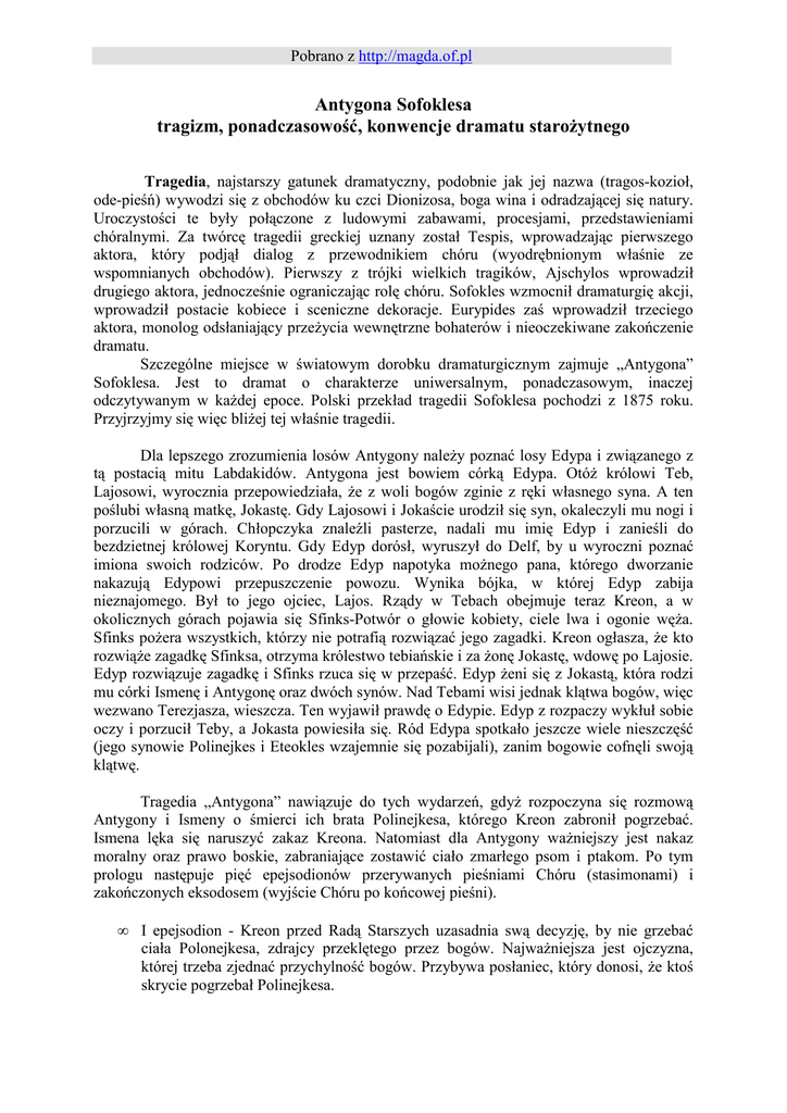 Pobrano z http://magda.of.pl Antygona Sofoklesa tragizm, ponadczasowość, konwencje dramatu staroŜytnego Tragedia, najstarszy gatunek dramatyczny, podobnie jak jej nazwa (tragos-kozioł, ode-pieśń) wywodzi się z obchodów ku czci Dionizosa, boga wina i odradzającej się natury. Uroczystości te były połączone z ludowymi zabawami, procesjami, przedstawieniami chóralnymi. Za twórcę tragedii greckiej uznany został Tespis, wprowadzając pierwszego aktora, który podjął dialog z przewodnikiem chóru (wyodrębnionym właśnie ze wspomnianych obchodów). Pierwszy z trójki wielkich tragików, Ajschylos wprowadził drugiego aktora, jednocześnie ograniczając rolę chóru. Sofokles wzmocnił dramaturgię akcji, wprowadził postacie kobiece i sceniczne dekoracje. Eurypides zaś wprowadził trzeciego aktora, monolog odsłaniający przeŜycia wewnętrzne bohaterów i nieoczekiwane zakończenie dramatu. Szczególne miejsce w światowym dorobku dramaturgicznym zajmuje „Antygona” Sofoklesa. Jest to dramat o charakterze uniwersalnym, ponadczasowym, inaczej odczytywanym w kaŜdej epoce. Polski przekład tragedii Sofoklesa pochodzi z 1875 roku. Przyjrzyjmy się więc bliŜej tej właśnie tragedii. Dla lepszego zrozumienia losów Antygony naleŜy poznać losy Edypa i związanego z tą postacią mitu Labdakidów. Antygona jest bowiem córką Edypa. OtóŜ królowi Teb, Lajosowi, wyrocznia przepowiedziała, Ŝe z woli bogów zginie z ręki własnego syna. A ten poślubi własną matkę, Jokastę. Gdy Lajosowi i Jokaście urodził się syn, okaleczyli mu nogi i porzucili w górach. Chłopczyka znaleźli pasterze, nadali mu imię Edyp i zanieśli do bezdzietnej królowej Koryntu. Gdy Edyp dorósł, wyruszył do Delf, by u wyroczni poznać imiona swoich rodziców. Po drodze Edyp napotyka moŜnego pana, którego dworzanie nakazują Edypowi przepuszczenie powozu. Wynika bójka, w której Edyp zabija nieznajomego. Był to jego ojciec, Lajos. Rządy w Tebach obejmuje teraz Kreon, a w okolicznych górach pojawia się Sfinks-Potwór o głowie kobiety, ciele lwa i ogonie węŜa. Sfinks poŜera wszystkich, którzy nie potrafią rozwiązać jego zagadki. Kreon ogłasza, Ŝe kto rozwiąŜe zagadkę Sfinksa, otrzyma królestwo tebiańskie i za Ŝonę Jokastę, wdowę po Lajosie. Edyp rozwiązuje zagadkę i Sfinks rzuca się w przepaść. Edyp Ŝeni się z Jokastą, która rodzi mu córki Ismenę i Antygonę oraz dwóch synów. Nad Tebami wisi jednak klątwa bogów, więc wezwano Terezjasza, wieszcza. Ten wyjawił prawdę o Edypie. Edyp z rozpaczy wykłuł sobie oczy i porzucił Teby, a Jokasta powiesiła się. Ród Edypa spotkało jeszcze wiele nieszczęść (jego synowie Polinejkes i Eteokles wzajemnie się pozabijali), zanim bogowie cofnęli swoją klątwę. Tragedia „Antygona” nawiązuje do tych wydarzeń, gdyŜ rozpoczyna się rozmową Antygony i Ismeny o śmierci ich brata Polinejkesa, którego Kreon zabronił pogrzebać. Ismena lęka się naruszyć zakaz Kreona. Natomiast dla Antygony waŜniejszy jest nakaz moralny oraz prawo boskie, zabraniające zostawić ciało zmarłego psom i ptakom. Po tym prologu następuje pięć epejsodionów przerywanych pieśniami Chóru (stasimonami) i zakończonych eksodosem (wyjście Chóru po końcowej pieśni). • I epejsodion - Kreon przed Radą Starszych uzasadnia swą decyzję, by nie grzebać ciała Polonejkesa, zdrajcy przeklętego przez bogów. NajwaŜniejsza jest ojczyzna, której trzeba zjednać przychylność bogów. Przybywa posłaniec, który donosi, Ŝe ktoś skrycie pogrzebał Polinejkesa. Pobrano z http://magda.of.pl • II epejsodion - straŜnik wprowadza Antygonę, która ośmieliła się złamać zakaz Kreona i pogrzebała brata. Antygona wyjaśnia, Ŝe uczyniła to zgodnie z prawem boskim: tylko pogrzebany zmarły wejdzie po śmierci do Hadesu. Nie lęka się nawet kary śmierci ze strony Kreona. Tego gniewa szczególnie fakt, Ŝe ośmieliła mu się przeciwstawić kobieta. Zjawia się Ismena, która próbuje wziąć winę na siebie. Antygona nie zgadza się. Stwierdza, Ŝe działała świadomie grzebiąc brata. • III epejsodion - Hajmon przybywa do swego ojca Kreona, gdyŜ nie pojmuje jego zaciekłości. UwaŜa, Ŝe bogowie po to dali człowiekowi rozum, by się nim kierował. Tak właśnie postępuje Antygona, dowodzi Hajmon. Rozgniewany Kreon nazywa syna „poddanym kobiety”. Ułaskawia Ismenę, ale nakazuje zamurować Ŝywcem Antygonę. • IV epejsodion - straŜnicy prowadzą Antygonę na śmierć. Kobieta wierzy, Ŝe po śmierci spotka się z rodzicami i Polinejkesem. Kreon twierdzi, Ŝe tylko przestrzega praw i wypełnia swój obowiązek króla. • V epejsodion - przybywa Terezjasz, ślepy wieszcz i wyjawia Kreonowi klątwę ciąŜącą nad rodem Edypa. Nazywa Kreona tyranem. Przepowiada upadek jego władzy. Władcę ogarnia strach. Postanawia wydobyć Antygonę z grobowca, a złoŜyć do niego ciało Polinejkesa. • Eksodos - przybywa posłaniec z wiadomością, Ŝe Antygona nie Ŝyje. Gdy zobaczył to Hajmon, wydobył sztylet i odebrał sobie Ŝycie. Na wieść o tym jego matka, Eurydyka, wybiegła z pałacu i takŜe popełniła samobójstwo. Kreon wobec tragedii, której był winien, postanawia opuścić miasto. Tak kończy się ta tragedia. Jednym z istotnych jej elementów jest tragizm, jako najwaŜniejsza kategoria estetyczna antycznej tragedii. Polega on na ukazaniu nierozwiązywalnego konfliktu: starcia jednostki z przerastającą ją siłą wyŜszą instancją (fatum, bogiem, ideą). Zderzenie sprzecznych racji nieuchronnie prowadzi do katastrofy i klęski jednostki, co z kolei jest podstawą do tzw. katharsis-oczyszczenia z uczuć litości i trwogi, pobudzającego widza do podziwu i współodczuwania z bohaterem. Niezbędnym elementem konfliktu tragicznego jest dojście przez bohatera do samowiedzy o swym losie (chwila, kiedy rozpoznaje on swoje przeznaczenie). W konflikcie tragicznym w „Antygonie” uczestniczy zar