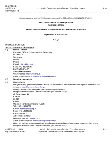 Dz.U./S S181 20/09/2016 325094-2016-PL - - Usługi - Ogłoszenie o zamówieniu - Procedura otwarta 1/6 Niniejsze ogłoszenie w witrynie TED: http://ted.europa.eu/udl?uri=TED:NOTICE:325094-2016:TEXT:PL:HTML Polska-Warszawa: Kursy komputerowe 2016/S 181-325094 Usługi społeczne i inne szczególne usługi – zamówienia publiczne Ogłoszenie o zamówieniu Usługi Dyrektywa 2014/24/UE Sekcja I: Instytucja zamawiająca I.1) Nazwa i adresy Komenda Główna Ochotniczych Hufców Pracy ul. Tamka 1 Warszawa 00-349 Polska E-mail: [email protected] Faks: +48 225784747 Kod NUTS: PL127 Adresy internetowe: Główny adres: http://www.ohp.pl Adres profilu nabywcy: http://bip.malopolska.ohp.pl/ I.2) Wspólne zamówienie I.3) Komunikacja Nieograniczony, pełny i bezpośredni dostęp do dokumentów zamówienia można uzyskać bezpłatnie pod adresem: http://bip.malopolska.ohp.pl/ Więcej informacji można uzyskać pod następującym adresem: Małopolska Wojewódzka Komenda Ochotniczych Hufców Pracy al. Słowackiego 44 Kraków 30-018 Polska Osoba do kontaktów: Marlena Pudełko Tel.: +48 126330706 E-mail: [email protected] Faks: +48 126330706 Kod NUTS: PL21 Adresy internetowe: Główny adres: http://www.ohp.pl Adres profilu nabywcy: http://bip.malopolska.ohp.pl/ Oferty lub wnioski o dopuszczenie do udziału w postępowaniu należy przesyłać na następujący adres: Małopolska Wojewódzka Komenda Ochotniczych Hufców Pracy 20/09/2016 S181 http://ted.europa.eu/TED - - Usługi - Ogłoszenie o zamówieniu - Procedura otwarta Suplement do Dziennika Urzędowego Unii Europejskiej 1/6 Dz.U./S S181 20/09/2016 325094-2016-PL - - Usługi - Ogłoszenie o zamówieniu - Procedura otwarta 2/6 al. Słowackiego 44 Kraków 30-018 Polska Osoba do kontaktów: Marlena Pudełko Tel.: +48 126330706 E-mail: [email protected] Faks: +48 126330706 Kod NUTS: PL21 Adresy internetowe: Główny adres: http://www.ohp.pl Adres profilu nabywcy: http://bip.malopolska.ohp.pl/ I.4) Rodzaj instytucji zamawiającej Inny rodzaj: jednostka budżetowa podległa MRPiPS I.5) Główny przedmiot działalności Edukacja Sekcja II: Przedmiot II.1) Wielkość lub zakres zamówienia II.1.1) Nazwa: Przeprowadzenie kursów ECDL Base lub kursu o równoważnym standardzie dla beneficjentów projektu „Akcja Aktywizacja – YEI” w ramach programu PO WER. Numer referencyjny: DB-271-MałopolskaZP14/2016 II.1.2) Główny kod CPV 80533200 II.1.3) Rodzaj zamówienia Usługi II.1.4) Krótki opis: Przedmiotem zamówienia jest przeprowadzenie kursów ECDL Base lub kursu o równoważnym standardzie dla beneficjentów projektu „Akcja Aktywacja- YEI” w ramach programu PO WER. Projekt realizowany w ramach Inicjatywy na rzecz zatrudnienia ludzi młodych. Miejsca realizacji zamówienia: Kraków, Miechów, Kety, Dąbrowa Tarnowska Każda miejscowość realizacji zamówienia stanowi część zamówienia Oferty można składać w odniesieniu do wszystkich części. Termin realizacji zamówienia: — gr. IB – do 31.1.2017 — gr II – do 28.2.2017. II.1.6) Informacje o częściach To zamówienie podzielone jest na części: tak Oferty można składać w odniesieniu do wszystkich części II.2) Opis II.2.1) Nazwa: Kraków Część nr: 1 20/09/2016 S181 http://ted.europa.eu/TED - - Usługi - Ogłoszenie o zamówieniu - Procedura otwarta Suplement do Dziennika Urzędowego Unii Europejskiej 2/6 Dz.U./S S181 20/09/2016 325094-2016-PL - - Usługi - Ogłoszenie o zamówieniu - Procedura otwarta 3/6 II.2.2) Dodatkowy kod lub kody CPV 80533200 II.2.3) Miejsce świadczenia usług Kod NUTS: PL213 Główne miejsce lub lokalizacja realizacji: os. Szkolne 19 31-977 Kraków. II.2.4) Opis zamówienia: Przedmiotem zamówienia jest przeprowadzenie kursów ECDL Base lub kursu o równoważnym standardzie dla 4 osób w ilości 60 godz. na osobę. II.2.6) Szacunkowa wartość Wartość bez VAT: 7 200.00 PLN II.2.7) Okres obowiązywania zamówienia lub umowy ramowej Koniec: 31/01/2017 II.2.13) Informacje o funduszach Unii Europejskiej Zamówienie dotyczy projektu/programu finansowanego ze środków Unii Europejskiej: tak Numer identyfikacyjny projektu: POWR.01.03.02-00-0002/16. II.2.14) Informacje dodatkowe II.2) Opis II.2.1) Nazwa: Miechów Część nr: 2 II.2.2) Dodatkowy kod lub kody CPV 80533200 II.2.3) Miejsce świadczenia usług Kod NUTS: PL214 Główne miejsce lub lokalizacja realizacji: ul. Sienkiewicza 25 32-200 Miechów. II.2.4) Opis zamówienia: Przedmiotem zamówienia jest przeprowadzenie kursów ECDL Base lub kursu o równoważnym standardzie dla 6 osób w ilości 60 godz. na osobę. II.2.6) Szacunkowa wartość Wartość bez VAT: 10 800.00 PLN II.2.7) Okres obowiązywania zamówienia lub umowy ramowej Koniec: 28/02/2017 II.2.13) Informacje o funduszach Unii Europejskiej Zamówienie dotyczy projektu/programu finansowanego ze środków Unii Europejskiej: tak Numer identyfikacyjny projektu: POWR.01.03.02-00-0002/16. II.2.14) Informacje dodatkowe II.2) Opis II.2.1) Nazwa: 20/09/2016 S181 http://ted.europa.eu/TED - - Usługi - Ogłoszenie o zamówieniu - Procedura otwarta Suplement do Dziennika Urzędowego Unii Europejskiej 3/6 Dz.U./S S181 20/09/2016 325094-2016-PL - - Usługi - Ogłoszenie o zamówieniu - Procedura otwarta 4/6 Kęty Część nr: 3 II.2.2) Dodatkowy kod lub kody CPV 80533200 II.2.3) Miejsce świadczenia usług Kod NUTS: PL216 Główne miejsce lub lokalizacja realizacji: ul. Sobieskiego 16 32-650 Kęty. II.2.4) Opis zamówienia: Przedmiotem zamówienia jest przeprowadzenie kursów ECDL Base lub kursu o równoważnym standardzie dla 10 osób w ilości 60 godz. na osobę. II.2.6) Szacunkowa wartość Wartość bez VAT: 18 000.00 PLN II.2.7) Okres obowiązywania zamówienia lub umowy ramowej Koniec: 28/02/2017 II.2.13) Informacje o funduszach Unii Europejskiej Zamówienie dotyczy projektu/programu finansowanego ze środków Unii Europejskiej: tak Numer identyfikacyjny projektu: POWR.01.03.02-00-0002/16. II.2.14) Informacje dodatkowe II.2) Opis II.2.1) Nazwa: Dąbro