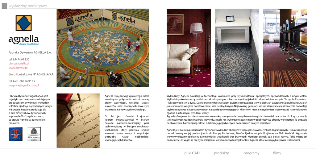 wykładziny podłogowe Fabryka Dywanów AGNELLA S.A. tel. 85/ 74 09 350 [email protected] www.agnella.pl Biuro Kontraktowe FD AGNELLA S.A. tel. kom. 606 96 96 85 [email protected] Fabryka Dywanów Agnella S.A. jest największym i najnowocześniejszym producentem dywanów i wykładzin w Polsce i jedną z największych fabryk w Europie. Rocznie produkuje ok. 2 mln m² wyrobów dywanowych w ponad 400 różnych wzorach, co stawia Agnellę w europejskiej czołówce. Agnella swą pozycję rynkowego lidera zawdzięcza połączeniu zróżnicowanej oferty wzorniczej, wysokiej jakości surowców oraz znaczących inwestycji w zakresie najnowszych technologii. Od lat jest również krajowym liderem innowacyjności w branży. Posiada najnowo-cześniejszy park technologiczny w Europie środkowowschodniej, który pozwala szybko kreować nowe wzory i zaspokajać potrzeby nawet najbardziej wymagających klientów. Wykładziny Agnelli powstają w technologii Axminster, przy wykorzystaniu specjalnych, sprowadzanych z Anglii wełen. Wykładziny Axminster są produktem ekskluzywnym, o bardzo wysokiej jakości i odporności na zużycie. To symbol komfortu i luksusowego stylu życia. Dzięki swoim właściwościom świetnie sprawdzają się w obiektach użyteczności publicznej, takich jak restauracje, wnętrza hotelowe, hole, kina, teatry, kasyna. Najnowszej generacji krosna sterowane elektronicznie pozwalają szybko reagować na potrzeby nawet najbardziej wymagających klientów i niemal natychmiast wprowadzać na rynek nowe, zgodne z aktualnymi trendami wzory. Agnella oferuje swoim klientom zarówno szeroką paletę standardowych wzorów wykładzin w wielu wariantach kolorystycznych, jak i możliwość realizacji wzorów indywidualnych, np. wykorzystujących motyw zdobniczy już obecny we wnętrzu. To pozwala na stworzenie harmonijnej całości z dekoracją pojedynczych pomieszczeń i całych obiektów. Agnella jest polskim producentem dywanów i wykładzin obecnym w kraju, jak i na wielu rynkach zagranicznych. Firma eksportuje ponad połowę swojej produkcji m.in. do Europy Zachodniej, Stanów Zjednoczonych, Rosji oraz na Bliski Wschód. Wyposaża w swe wykładziny obiekty na całym świecie: sieci hoteli (np. Starwood i Marriott), ośrodki spa, biura i kasyna. Takie miasta jak Cannes czy Las Vegas są częstymi miejscami wizyt roboczych projektantów Agnelli, które owocują kolejnymi realizacjami. pliki CAD produkty programy filmy