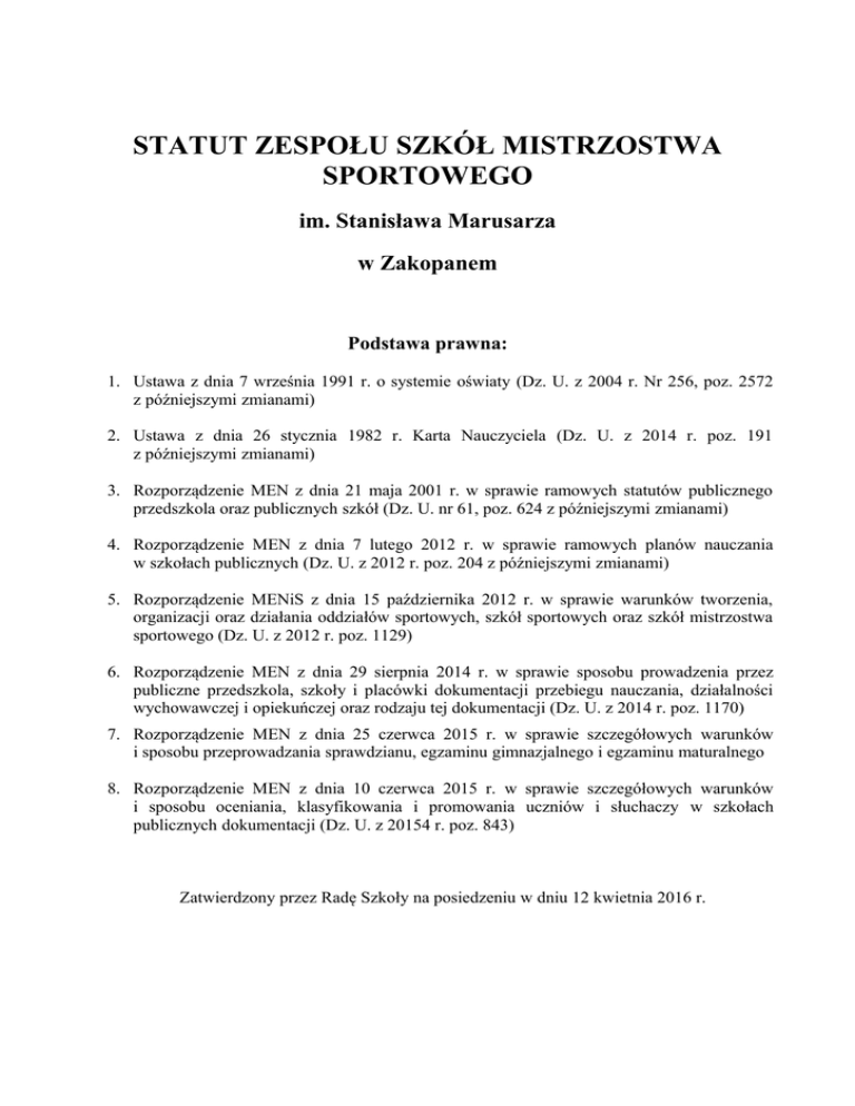 STATUT ZESPOŁU SZKÓŁ MISTRZOSTWA SPORTOWEGO im. Stanisława Marusarza w Zakopanem Podstawa prawna: 1. Ustawa z dnia 7 września 1991 r. o systemie oświaty (Dz. U. z 2004 r. Nr 256, poz. 2572 z późniejszymi zmianami) 2. Ustawa z dnia 26 stycznia 1982 r. Karta Nauczyciela (Dz. U. z 2014 r. poz. 191 z późniejszymi zmianami) 3. Rozporządzenie MEN z dnia 21 maja 2001 r. w sprawie ramowych statutów publicznego przedszkola oraz publicznych szkół (Dz. U. nr 61, poz. 624 z późniejszymi zmianami) 4. Rozporządzenie MEN z dnia 7 lutego 2012 r. w sprawie ramowych planów nauczania w szkołach publicznych (Dz. U. z 2012 r. poz. 204 z późniejszymi zmianami) 5. Rozporządzenie MENiS z dnia 15 października 2012 r. w sprawie warunków tworzenia, organizacji oraz działania oddziałów sportowych, szkół sportowych oraz szkół mistrzostwa sportowego (Dz. U. z 2012 r. poz. 1129) 6. Rozporządzenie MEN z dnia 29 sierpnia 2014 r. w sprawie sposobu prowadzenia przez publiczne przedszkola, szkoły i placówki dokumentacji przebiegu nauczania, działalności wychowawczej i opiekuńczej oraz rodzaju tej dokumentacji (Dz. U. z 2014 r. poz. 1170) 7. Rozporządzenie MEN z dnia 25 czerwca 2015 r. w sprawie szczegółowych warunków i sposobu przeprowadzania sprawdzianu, egzaminu gimnazjalnego i egzaminu maturalnego 8. Rozporządzenie MEN z dnia 10 czerwca 2015 r. w sprawie szczegółowych warunków i sposobu oceniania, klasyfikowania i promowania uczniów i słuchaczy w szkołach publicznych dokumentacji (Dz. U. z 20154 r. poz. 843) Zatwierdzony przez Radę Szkoły na posiedzeniu w dniu 12 kwietnia 2016 r. Rozdział I Postanowienia ogólne §1 1. Nazwa szkoły brzmi: Zespół Szkół Mistrzostwa Sportowego imienia Stanisława Marusarza w Zakopanem. 2. Skrótami używanymi przy podawaniu informacji o szkole są skróty: ZSMS, SMS (Szkoła Mistrzostwa Sportowego). §2 Siedziba szkoły mieści się pod adresem: ul. Droga do Olczy 26, 34-500 Zakopane. §3 Zespół Szkół Mistrzostwa Sportowego w Zakopanem jest szkołą publiczną. §4 Organem prowadzącym szkołę jest Województwo Małopolskie. §5 1. W skład Zespołu Szkół Mistrzostwa Sportowego wchodzą następujące szkoły: 1) Gimnazjum Mistrzostwa Sportowego; 2) Liceum Ogólnokształcące Mistrzostwa Sportowego; 2a) Szkoła Podstawowa Nr 10 Mistrzostwa Sportowego; oraz placówka: 3) Internat Zespołu Szkół Mistrzostwa Sportowego im. Stanisława Marusarza w Zakopanem. 2. Szkoły wchodzące w skład ZSMS są szkołami feryjnymi, internat ZSMS jest placówką feryjną, działającą również w okresach wolnych od zajęć dydaktycznych. 3. Skróty używane przy podawaniu informacji o szkołach brzmią odpowiednio: GMS, LOMS i SPMS. §6 O ile w tekście niniejszego statutu nie zaznaczono inaczej, ilekroć mowa jest o: 1) szkole – należy przez to rozumieć cały zespół szkół; 1a) dyrektorze - należy przez to rozumieć dyrektora całego zespołu szkół; 1b) oddziale w danym roczniku – należy przez to rozumieć również klasę; 2) uczniu – należy przez to rozumieć ucznia jednej ze szkół wchodzących w skład ZSMS; 3) wychowanku - należy przez to rozumieć mieszkańca internatu ZSMS; 4) rodzicach - należy przez to rozumieć także prawnych opiekunów dziecka oraz osoby (podmioty) sprawujące pieczę zastępczą nad dzieckiem; 2 5) nauczycielu – należy przez to rozumieć każdego pracownika pedagogicznego ZSMS, to jest nauczycieli przedmiotów, trenerów, wychowawców internatu i świetlicy, pedagoga, psychologa, logopedę, nauczyciela bibliotekarza; 6) ustawie - należy przez to rozumieć ustawę z dnia 7 września 1991 r. o systemie oświaty z późniejszymi zmianami; 7) Karcie Nauczyciela – należy przez to rozumieć ustawę z dnia 26 stycznia 1982 r. - Karta Nauczyciela z późniejszymi zmianami. §7 1. Cykl kształcenia jest zgodny z przepisami w sprawie warunków tworzenia, organizacji oraz działania oddziałów sportowych, szkół sportowych oraz szkół mistrzostwa sportowego i wynosi: 1) w Gimnazjum Mistrzostwa Sportowego – 3 lata; 2) w Liceum Ogólnokształcącym Mistrzostwa Sportowego - 3 lata 3) w Szkole Podstawowej Nr 10 Mistrzostwa Sportowego – 3 lata (II etap kształcenia, klasy IV – VI). 2. Szkoła kształci uczniów w minimum jednym oddziale sportowym. Liczba uczniów w oddziale sportowym szkoły mistrzostwa sportowego uzależniona jest od możliwości zebrania uczniów o zbliżonym poziomie sportowym. 3. Szkoła w porozumieniu z organem prowadzącym może organizować nauczanie indywidualne dla uczniów posiadających orzeczenie o potrzebie indywidualnego nauczania. §8 1. ZSMS prowadzi szkolenie sportowe ukierunkowane (na III etapie kształcenia – gimnazjum) i specjalistyczne (na IV etapie kształcenia - liceum ogólnokształcące) w następujących sportach: 1) narciarstwo: a) narciarstwo alpejskie, b) narciarstwo klasyczne, - biegi narciarskie, - skoki narciarskie, - kombinacja norweska, c) snowboard, 2) łyżwiarstwo szybkie; 3) biathlon. 3 1a. Na II etapie kształcenia (klasy IV – VI szkoły podstawowej) ZSMS prowadzi ukierunkowane szkolenie sportowe bez podziału na poszczególne sporty, mające na celu ujawnienie predyspozycji i uzdolnień kwalifikujących uczniów do szkolenia w określonym sporcie. 2. ZSMS umożliwia naukę zawodnikom szkolonym w klubach sportowych także w innych sportach. 3. Dla SPMS Nr 10 oraz GMS nie ustala się obwodu - ZSMS jest szkołą ponadregionalną i przyjmuje uczniów uzdolnionych sportowo również spoza terenu gminy Zakopane, powiatu tatrzańskiego i województwa małopolskiego. 4. Szkoła może przyjmować uczniów uzdolnionych sportowo zza granicy, nieposiadających obywatelstwa polskiego. Zasady przyjmowania takich uczniów określają odrębne porozumienia. 5. Szkoleniem sportowym objęci są uczniowie wszystkich klas i oddziałów danego typu szkoły. 6. Szkolenie sportowe prowadzone jest w ramach zajęć sportowych, wg programów szkolenia sportowe