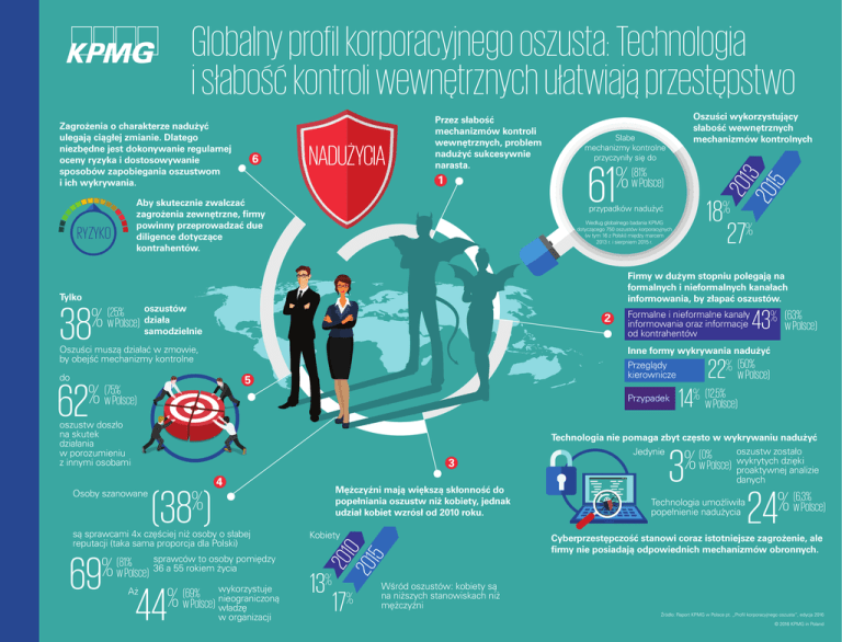 Globalny profil korporacyjnego oszusta: Technologia i słabość kontroli wewnętrznych ułatwiają przestępstwo 6 NADUŻYCIA 1 Aby skutecznie zwalczać zagrożenia zewnętrzne, firmy powinny przeprowadzać due diligence dotyczące kontrahentów. RYZYKO Słabe mechanizmy kontrolne przyczyniły się do 61 % 38 % 62 % Firmy w dużym stopniu polegają na formalnych i nieformalnych kanałach informowania, by złapać oszustów. oszustów działa samodzielnie 2 5 Przypadek 3 4 są sprawcami 4x częściej niż osoby o słabej reputacji (taka sama proporcja dla Polski) 69 % sprawców to osoby pomiędzy 36 a 55 rokiem życia 44 Aż % (69% w Polsce) wykorzystuje nieograniczoną władzę w organizacji Mężczyźni mają większą skłonność do popełniania oszustw niż kobiety, jednak udział kobiet wzrósł od 2010 roku. Kobiety 201 0 201 5 (38 ) % 43 % (63% w Polsce) 22 % (50% Przeglądy kierownicze oszustw doszło na skutek działania w porozumieniu z innymi osobami (81% w Polsce) Formalne i nieformalne kanały informowania oraz informacje od kontrahentów Inne formy wykrywania nadużyć (75% w Polsce) Osoby szanowane 18% % 27 Według globalnego badania KPMG dotyczącego 750 oszustów korporacyjnych (w tym 16 z Polski) między marcem 2013 r. i sierpniem 2015 r. Oszuści muszą działać w zmowie, by obejść mechanizmy kontrolne do (81% w Polsce) przypadków nadużyć Tylko (25% w Polsce) Oszuści wykorzystujący słabość wewnętrznych mechanizmów kontrolnych 201 3 201 5 Zagrożenia o charakterze nadużyć ulegają ciągłej zmianie. Dlatego niezbędne jest dokonywanie regularnej oceny ryzyka i dostosowywanie sposobów zapobiegania oszustwom i ich wykrywania. Przez słabość mechanizmów kontroli wewnętrznych, problem nadużyć sukcesywnie narasta. 13% 17% 14 w Polsce) % (12,5% w Polsce) Technologia nie pomaga zbyt często w wykrywaniu nadużyć oszustw zostało Jedynie (0% dzięki w Polsce) wykrytych proaktywnej analizie danych 3 % Technologia umożliwiła popełnienie nadużycia 24 % (6,3% w Polsce) Cyberprzestępczość stanowi coraz istotniejsze zagrożenie, ale firmy nie posiadają odpowiednich mechanizmów obronnych. Wśród oszustów: kobiety są na niższych stanowiskach niż mężczyźni Źródło: Raport KPMG w Polsce pt. „Profil korporacyjnego oszusta”, edycja 2016 © 2016 KPMG in Poland