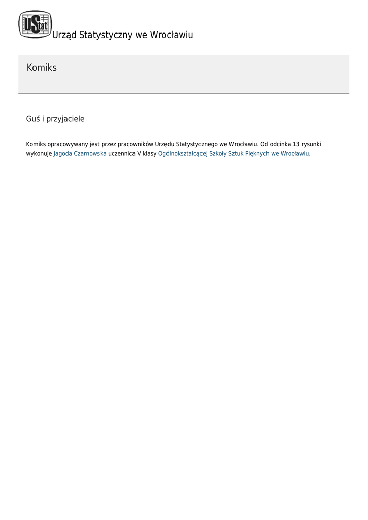 Urząd Statystyczny we Wrocławiu Komiks Guś i przyjaciele Komiks opracowywany jest przez pracowników Urzędu Statystycznego we Wrocławiu. Od odcinka 13 rysunki wykonuje Jagoda Czarnowska uczennica V klasy Ogólnokształcącej Szkoły Sztuk Pięknych we Wrocławiu.