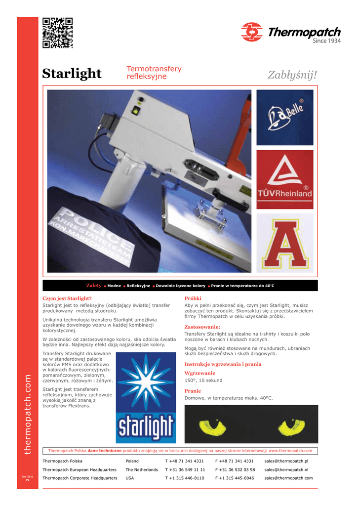 Termotransfery refleksyjne Starlight Zalety Modne Refleksyjne Dowolnie łączone kolory Próbki Starlight jest to refleksyjny (odbijający światło) transfer produkowany metodą sitodruku. Aby w pełni przekonać się, czym jest Starlight, musisz zobaczyć ten produkt. Skontaktuj się z przedstawicielem firmy Thermopatch w celu uzyskania próbki. Zastosowanie: W zależności od zastosowanego koloru, siła odbicia światła będzie inna. Najlepszy efekt dają najjaśniejsze kolory. thermopatch.com Pranie w temperaturze do 40°C Czym jest Starlight? Unikalna technologia transferu Starlight umożliwia uzyskanie dowolnego wzoru w każdej kombinacji kolorystycznej. Jun 2011 PL Zabłyśnij! Transfery Starlight drukowane są w standardowej palecie kolorów PMS oraz dodatkowo w kolorach fluorescencyjnych: pomarańczowym, zielonym, czerwonym, różowym i żółtym. Transfery Starlight są idealne na t-shirty i koszulki polo noszone w barach i klubach nocnych. Mogą być również stosowane na mundurach, ubraniach służb bezpieczeństwa i służb drogowych. Instrukcje wgrzewania i prania Wgrzewanie 150°, 10 sekund Starlight jest transferem refleksyjnym, który zachowuje wysokią jakość znaną z transferów Flextrans. Pranie Domowe, w temperaturze maks. 40ºC. Thermopatch Polska dane techniczne produktu znajdują sie w broszurce dostępnej na naszej stronie internetowej: www.thermopatch.com Thermopatch Polska Poland T +48 71 341 4331 F +48 71 341 4331 [email protected] Thermopatch European Headquarters The Netherlands T +31 36 549 11 11 F +31 36 532 03 98 [email protected] Thermopatch Corporate Headquarters USA T +1 315 446-8110 F +1 315 445-8046 [email protected]