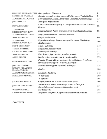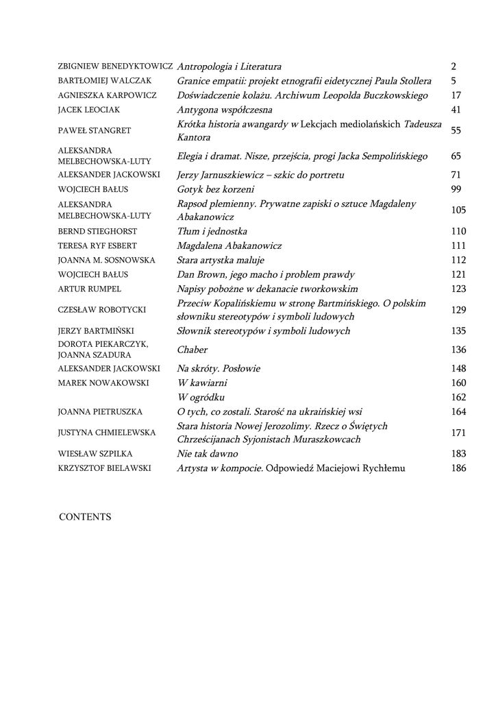 Antropologia i Literatura Granice empatii: projekt etnografii eidetycznej Paula Stollera Doświadczenie kolażu. Archiwum Leopolda Buczkowskiego Antygona współczesna Krótka historia awangardy w Lekcjach mediolańskich Tadeusza Kantora 2 5 17 41 ALEKSANDRA MELBECHOWSKA-LUTY Elegia i dramat. Nisze, przejścia, progi Jacka Sempolińskiego 65 ALEKSANDER JACKOWSKI Jerzy Jarnuszkiewicz – szkic do portretu Gotyk bez korzeni Rapsod plemienny. Prywatne zapiski o sztuce Magdaleny Abakanowicz Tłum i jednostka Magdalena Abakanowicz Stara artystka maluje Dan Brown, jego macho i problem prawdy Napisy pobożne w dekanacie tworkowskim Przeciw Kopalińskiemu w stronę Bartmińskiego. O polskim słowniku stereotypów i symboli ludowych Słownik stereotypów i symboli ludowych 71 99 DOROTA PIEKARCZYK, JOANNA SZADURA Chaber 136 ALEKSANDER JACKOWSKI Na skróty. Posłowie W kawiarni W ogródku O tych, co zostali. Starość na ukraińskiej wsi Stara historia Nowej Jerozolimy. Rzecz o Świętych Chrześcijanach Syjonistach Muraszkowcach Nie tak dawno Artysta w kompocie. Odpowiedź Maciejowi Rychłemu 148 160 162 164 ZBIGNIEW BENEDYKTOWICZ BARTŁOMIEJ WALCZAK AGNIESZKA KARPOWICZ JACEK LEOCIAK PAWEŁ STANGRET WOJCIECH BAŁUS ALEKSANDRA MELBECHOWSKA-LUTY BERND STIEGHORST TERESA RYF ESBERT JOANNA M. SOSNOWSKA WOJCIECH BAŁUS ARTUR RUMPEL CZESŁAW ROBOTYCKI JERZY BARTMIŃSKI MAREK NOWAKOWSKI JOANNA PIETRUSZKA JUSTYNA CHMIELEWSKA WIESŁAW SZPILKA KRZYSZTOF BIELAWSKI CONTENTS 55 105 110 111 112 121 123 129 135 171 183 186 BARTŁOMIEJ WALCZAK Paul Stoller’s Project of Eidetic Ethnography AGNIESZKA KARPOWICZ The Collage Experiment. The Leopold Buczkowski Archive JACEK LEOCIAK Contemporary Antigone PAWEŁ STANGRET A Concise History of the Avantgarde in Tadeusz Kantor’s “Lekcje mediolańskie” ALEKSANDRA MELBECHOWSKA-LUTY Elegy and Drama. The Niches, Passages and Thresholds of Jacek Sempoliński ALEKSANDER JACKOWSKI Jerzy Jarnuszkiewicz WOJCIECH BAŁUS Gothic with no Roots ALEKSANDRA MELBECHOWSKA-LUTY Tribal Rhapsody. Private Notes on the Art of Magdalena Abakanowicz BERND STIEGHORST The Crowd and the Individual TERESA RYF ESBERT Magdalena Abakanowicz JOANNA SOSNOWSKA An Old Female Artist Paints WOJCIECH BAŁUS Dan Brown, his Macho and the Question of Truth ARTUR RUMPEL Pious Inscriptions in the Tworki Deanery CZESŁAW ROBOTYCKI Against Kopaliński and towards Bartmiński. On a Polish Dictionary of Folk Stereotypes and Symbols JERZY BARTMIŃSKI Polish Dictionary Folk Stereotypes and Symbols ALEKSANDER JACKOWSKI “Na Skróty”. Postscript JOANNA PIETRUSZKA On Those who Stayed Behind. A Study on Old Age and the Looming Extinction of the Ukrainian JUSTYNA CHMIELEWSKA An Old Story of New Jerusalem WIESŁAW SZPILKA Not So Long Ago A Pterodactyl in a Compote. The answer to Maciej Rychły