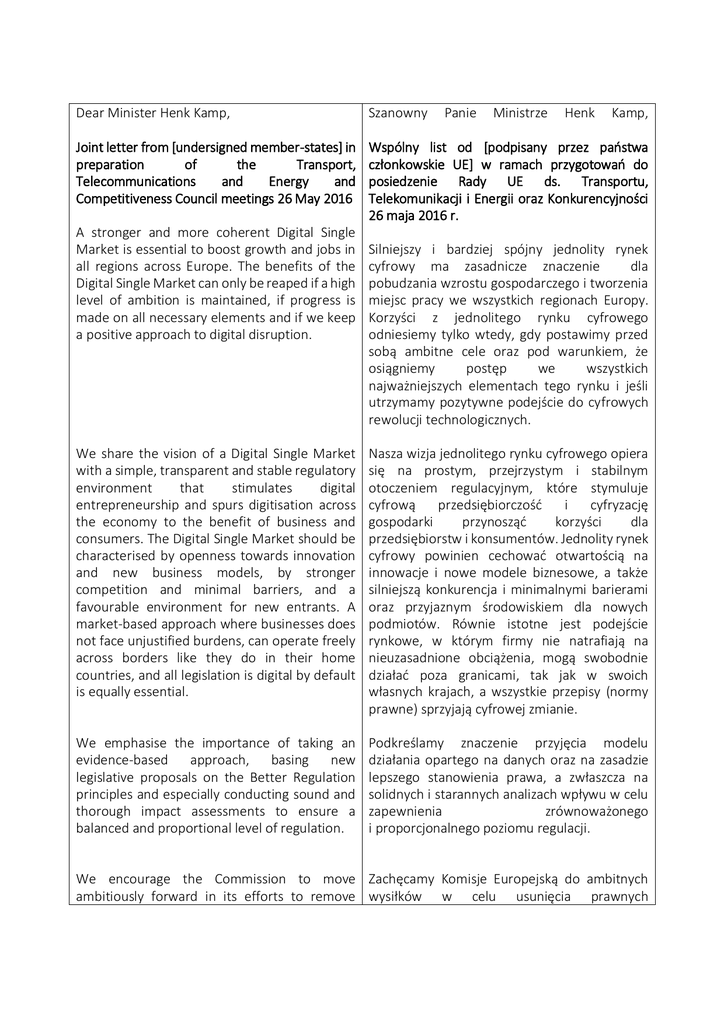Dear Minister Henk Kamp, Szanowny Joint letter from [undersigned member-states] in preparation of the Transport, Telecommunications and Energy and Competitiveness Council meetings 26 May 2016 Wspólny list od [podpisany przez państwa członkowskie UE] w ramach przygotowań do posiedzenie Rady UE ds. Transportu, Telekomunikacji i Energii oraz Konkurencyjności 26 maja 2016 r. A stronger and more coherent Digital Single Market is essential to boost growth and jobs in all regions across Europe. The benefits of the Digital Single Market can only be reaped if a high level of ambition is maintained, if progress is made on all necessary elements and if we keep a positive approach to digital disruption. Panie Ministrze Henk Kamp, Silniejszy i bardziej spójny jednolity rynek cyfrowy ma zasadnicze znaczenie dla pobudzania wzrostu gospodarczego i tworzenia miejsc pracy we wszystkich regionach Europy. Korzyści z jednolitego rynku cyfrowego odniesiemy tylko wtedy, gdy postawimy przed sobą ambitne cele oraz pod warunkiem, że osiągniemy postęp we wszystkich najważniejszych elementach tego rynku i jeśli utrzymamy pozytywne podejście do cyfrowych rewolucji technologicznych. We share the vision of a Digital Single Market with a simple, transparent and stable regulatory environment that stimulates digital entrepreneurship and spurs digitisation across the economy to the benefit of business and consumers. The Digital Single Market should be characterised by openness towards innovation and new business models, by stronger competition and minimal barriers, and a favourable environment for new entrants. A market-based approach where businesses does not face unjustified burdens, can operate freely across borders like they do in their home countries, and all legislation is digital by default is equally essential. Nasza wizja jednolitego rynku cyfrowego opiera się na prostym, przejrzystym i stabilnym otoczeniem regulacyjnym, które stymuluje cyfrową przedsiębiorczość i cyfryzację gospodarki przynosząć korzyści dla przedsiębiorstw i konsumentów. Jednolity rynek cyfrowy powinien cechować otwartością na innowacje i nowe modele biznesowe, a także silniejszą konkurencja i minimalnymi barierami oraz przyjaznym środowiskiem dla nowych podmiotów. Równie istotne jest podejście rynkowe, w którym firmy nie natrafiają na nieuzasadnione obciążenia, mogą swobodnie działać poza granicami, tak jak w swoich własnych krajach, a wszystkie przepisy (normy prawne) sprzyjają cyfrowej zmianie. We emphasise the importance of taking an evidence-based approach, basing new legislative proposals on the Better Regulation principles and especially conducting sound and thorough impact assessments to ensure a balanced and proportional level of regulation. Podkreślamy znaczenie przyjęcia modelu działania opartego na danych oraz na zasadzie lepszego stanowienia prawa, a zwłaszcza na solidnych i starannych analizach wpływu w celu zapewnienia zrównoważonego i proporcjonalnego poziomu regulacji. We encourage the Commission to move Zachęcamy Komisje Europejską do ambitnych ambitiously forward in its efforts to remove wysiłków w celu usunięcia prawnych regulatory and non-regulatory barriers in the i pozaprawnych barier na jednolitym rynku Digital Single Market taking the following into cyfrowym, biorąc pod uwagę poniższe aspekty: account: Build a solid foundation for the digital economy. For the digital economy to flourish businesses and consumers must thrive in a trusted and connected digital environment. Zbudowanie solidnych podstaw dla gospodarki cyfrowej. W gospodarce cyfrowej firmy i konsumenci muszą prosperować w zaufanym i wzajemnie połączonym środowisku cyfrowym. We must provide a coherent and technology neutral data-protection regime without overlapping regulation. We encourage the Commission to deliver an ambitious review of the e-Privacy directive with the aim to repeal all elements that are no longer fit for purpose while ensuring the right balance between digital products and services and the fundamental rights of data subjects across the regulatory framework. Musimy zapewnić spójny i technologicznie neutralny system ochrony danych bez nakładających się na siebie, zbędnych przepisów. Zachęcamy Komisję do dokonania ambitnego przeglądu dyrektywy o eprywatności w celu uchylenia wszystkich tych przepisów, które już są nieaktualne, przy jednoczesnym zapewnieniu równowagi pomiędzy rozwojem cyfrowych produktów i usług oraz podstawowymi prawami podmiotów danych w całych ramach regulacyjnych. Ubiquitous access to high-speed broadband and innovative communication services is an integral part of the telecommunications review. The regulatory framework should be adapted to better spur investments in high-speed broadband and promote competitive prices and innovative services by removing all unjustified requirements. Powszechny dostęp do szybkich łączy szerokopasmowych oraz innowacyjnych usług komunikacyjnych jest integralną częścią przeglądu ram telekomunikacyjnych. Ramy regulacyjne, poprzez usunięcie wszelkich nieuzasadnionych wymagań, powinny być dostosowane to tego aby stymulować inwestycje w szybkie łącza, pobudzać konkurencję cenową i rozwój innowacyjnych usług. Strengthen the framework for digital innovation and entrepreneurship. It is vital for European competitiveness to take a positive approach to new advancements in digital technologies and business models. Wzmocnienie innowacji i przedsiębiorczości cyfrowej. Ważne dla konkurencyjności Europy jest przyjęcie pozytywnego podejście do nowych rozwiązań w zakresie technologii cyfrowych i modeli biznesowych. Online platforms bring new opportunities for consumers and businesses and content providers alike. We should welcome their contribution to innovation and refrain from onesize-fits-all regulation which would reduce competition and hamper innovation. In the first instance we should focus on