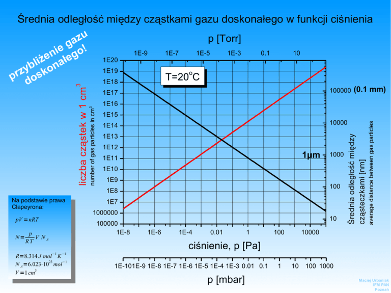 100000 1E17 1E16 10000 1E14 1E13 1E12 1μm 1E11 pV =nRT N= 1E10 1E9 100 1E7 1000000 100000 1E-8 p V NA RT 1000 10 1E-6 1E-4 0.01 1 100 average distance between gas particles 1E15 1E8 Na podstawie prawa Clapeyrona: (0.1 mm) Średnia odległość między cząsteczkami [nm] number of gas particles in cm3 liczba cząstek w 1 cm 3 Średnia odległość między cząstkami gazu doskonałego w funkcji ciśnienia zu p [Torr] a g ie go! 1E-9 1E-7 1E-5 1E-3 0.1 10 n e e 1E20 ż li nał b y ko 1E19 o z r p dos T=20 C 1E18 10000 ciśnienie, p [Pa] −1 −1 R=8.314 J mol K 23 −1 N A =6.023⋅10 mol V =1 cm3 1E-101E-9 1E-8 1E-7 1E-6 1E-5 1E-4 1E-3 0.01 0.1 p [mbar] 1 10 100 1000 Maciej Urbaniak IFM PAN Poznań
