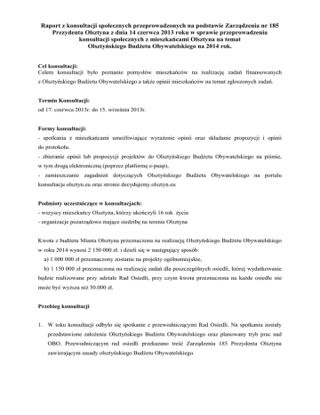 Raport z konsultacji społecznych przeprowadzonych na podstawie Zarządzenia nr 185 Prezydenta Olsztyna z dnia 14 czerwca 2013 roku w sprawie przeprowadzenia konsultacji społecznych z mieszkańcami Olsztyna na temat Olsztyńskiego Budżetu Obywatelskiego na 2014 rok. Cel konsultacji: Celem konsultacji było poznanie pomysłów mieszkańców na realizację zadań finansowanych z Olsztyńskiego Budżetu Obywatelskiego a także opinii mieszkańców na temat zgłoszonych zadań. Termin Konsultacji: od 17. czerwca 2013r. do 15. września 2013r. Formy konsultacji: - spotkania z mieszkańcami umożliwiające wyrażenie opinii oraz składanie propozycji i opinii do protokołu. - zbieranie opinii lub propozycji projektów do Olsztyńskiego Budżetu Obywatelskiego na piśmie, w tym drogą elektroniczną (poprzez platformę e-puap), - zamieszczanie zagadnień dotyczących Olsztyńskiego Budżetu Obywatelskiego na portalu konsultacje.olsztyn.eu oraz stronie decydujemy.olsztyn.eu Podmioty uczestniczące w konsultacjach: - wszyscy mieszkańcy Olsztyna, którzy ukończyli 16 rok życia - organizacje pozarządowe mające siedzibę na terenie Olsztyna Kwota z budżetu Miasta Olsztyna przeznaczona na realizację Olsztyńskiego Budżetu Obywatelskiego w roku 2014 wynosi 2 150 000 zł. i dzieli się w następujący sposób: a) 1 000 000 zł przeznaczony zostanie na projekty ogólnomiejskie, b) 1 150 000 zł przeznaczona na realizację zadań dla poszczególnych osiedli, której wydatkowanie będzie realizowane przy udziale Rad Osiedli, przy czym kwota przeznaczona na każde osiedle nie może być wyższa niż 50.000 zł. Przebieg konsultacji 1. W toku konsultacji odbyło się spotkanie z przewodniczącymi Rad Osiedli. Na spotkaniu zostały przedstawione założenia Olsztyńskiego Budżetu Obywatelskiego oraz planowany tryb prac nad OBO. Przewodniczącym rad osiedli przekazano treść Zarządzenia 185 Prezydenta Olsztyna zawierającym zasady olsztyńskiego Budżetu Obywatelskiego. 2. Partner Miasta – Związek Stowarzyszeń „Razem w Olsztynie” przygotował konspekt szkolenia oraz przeszkolił moderatorów odpowiedzialnych za prowadzenie spotkań w poszczególnych osiedlach. 3. W ramach dyskusji z mieszkańcami w terminie pomiędzy 1. lipca a 5. września odbyło się 47 spotkań w poszczególnych osiedlach. 4. Akcja edukacyjno promocyjna skierowana była do mieszkańców Olsztyna i obejmowała: - ulotki informacyjne zawierające 4 kroki realizacji Olsztyńskiego Budżetu Obywatelskiego, - plakaty promocyjne zawierające terminy spotkań z mieszkańcami, umieszczone na słupach ogłoszeniowych, w sieciach sklepów oraz w autobusach miejskich, - radiowe spoty reklamowe, - publikacje w prasie lokalnej, - komiks przedstawiający poszczególne etapy realizacji OBO, - publikacja informacji na stronach internetowych, konsultacje.olsztyn.eu, olsztyn.eu, decydujemy.olsztyn.pl oraz na profilu Facebook. 5. Powołano 2 punkty konsultacyjne dla mieszkańców, których zadaniem było wspieranie w przygotowaniu wniosków. 6. W ramach budżetu złożonych zostało 160 wniosków, z czego 38 projektów ogólnomiejskich i 142 projekty osiedlowe. 7. Projekty zostały zaopiniowane podczas dwóch posiedzeń przez Zespół Koordynujący, w którego skład wchodzi: 3 przedstawicieli Prezydenta, 3 radnych wskazanych przez Przewodniczącego Rady Miasta oraz 3 przedstawicieli Rad Osiedli i 3 przedstawicieli organizacji pozarządowych. Do głosowania dopuszczono 82 projekty osiedlowe ( w tym 2 projekty połączone 154 i 155 – siłowania na osiedlu Pojezierze) i 18 projektów ogólnomiejskich ( w tym 2 projekty połączone - nr 1 i 4 – rower miejski) Lista projektów nie dopuszczonych do głosowania stanowi załącznik nr 1 do Raportu. 8. W dniach 2 – 13 września odbyło się głosowanie nad wnioskami. Mieszkańcy złożyli 10.519 kart do głosowania (w tym 5.001 na projekty osiedlowe oraz 5.518 na projekty ogólnomiejskie. Kart nieważnych było 288. w związku z faktem, że każdy mieszkaniec miał do rozdysponowania 5 punktów na projekty ogólnomiejskie i 5 na projekty osiedlowe – liczba kart do głosowania była mniejsza niż liczba oddanych głosów na poszczególne projekty. Ogółem oddano 11.426 głosów w tym na projekty osiedlowe 5.370, a na projekty ogólnomiejskie 6.056 głosów. Lista projektów dopuszczonych do głosowania wraz z wynikami głosowania stanowi załącznik 2 i 3 do raportu. Załącznik nr 1 do Raportu WNIOSKI OSIEDLOWE NIE DOPUSZCZONE DO GŁOSOWANIA Lp. 1 2 3 NR: projektu 2 9 15 Tytuł zadania Wymiana chodnika przy ul. ŚwityczWidackiej 3 lokalizacja (osiedle) Pieczewo Realizacja i wykonanie Wieloletniego Planu Inwestycyjnego na lata 2011-2014. Kod zadania : MZDiM50/2010/02. Kętrzyńskieg Potwierdzone pismem przez Pana o Prezydenta Nr Mz.TD.5540-8a/10 z dnia 07.06.2010. Przedłużenie linii autobusowej nr 30 lub 33 o odcinek ul. Sikorskiego do ul. Barcza (pętla) przez ul. Wańkowicza . Wyłączenie z ruchu tranzytowego odcinka drogi ul. Orłowicza 13 i7. a) wykonanie dwóch parkingów b) odpowiednie wykończenie chodników z zaznaczeniem pasów dla pieszych i odpowiednich oznakowań ul. Orłowicza 23 i 21, oraz ul. Orłowicza 23 i 7. Nagórki Szacunkowe koszty zadania (w zł) opis zadania powód niedopuszczenia do głosowania 0,00 Z uwagi, iż chodnik w okolicy budynku przychodni jest zniszczony (brakujące płytki, zniszczone płytki) zagrażają bezpieczeństwu pacjentom, pracownikom oraz mieszkańcom osiedla. Od czasu budowy przychodni, tj. od 20 lat nie były podejmowane żadne działania w kierunku poprawy nawierzchni chodnika. wniosek nie spełnia wymogów formalnych z powodu braku kosztorysu 190 000,00 0,00 Budowa drogi dojazdowej do bloku Kętrzyńskiego Budżet projektu przekracza 9, utwardzenie placu pod miejsca postojowe oraz środki przeznaczone na wykonanie chodnika. Zgodnie z WPJ na lata 2011Olsztyński Budżet 2014. Obywatelski w roku 2014 1. Linię autobusową nr 30 lub 33 sk