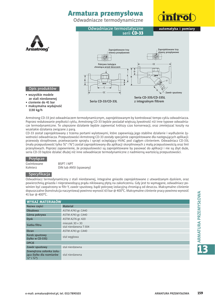Armatura przemysłowa Odwadniacze termodynamiczne Odwadniacze termostatyczne serii CD-33 ;BQSPKFLUPXBOFUSS[Z PUXPSZQS[FQZXPXF ;BQSPKFLUPXBOFUS[Z PUXPSZQS[FQZXPXF F $$ 1PLSZXBJ[PMVKDB DISPOJDBQS[FEEFT[D[FN % & # ' " Opis produktów $ $$ • wszystkie modele ze stali nierdzewnej • cisnienie do 41 bar • maksymalna wydajność 1130 kg/h # 4FSJB$%$%- ( ;BXÌSTQVTUPXZ 4FSJB$%4$%4- 4FSJB $% 4$% 4[JOUFHSBMOZNGJMUSFN Armstrong CD-33 jest odwadniaczem termodynamicznym, zaprojektowanym by kontrolować tempo cyklu odwadniacza. Poprzez redukowanie prędkości cyklu, Armstrong CD-33 będzie posiadał większą żywotność niż inne typowe odwadniacze termodynamiczne. Te ulepszone działanie będzie zapewniać krótszy czas konserwacji, oraz zmniejszać koszty na wszelakie działania związane z parą. CD-33 został zaprojektowany z trzema portami wylotowymi, które zapewniają jego stabilne działanie i wydłużenie żywotności odwadniacza. Przepustowości Armstrong CD-33 zostały specjalnie zaprojektowane dla następujących aplikacji: przewody skroplinowe, przetwarzanie sprzętu i sprzęt ocieplający HVAC pod ciągłym ciśnieniem. Odwadniacz CD-33L (mała przepustowość tylko ½” i ¾”) został zaprojektowany dla aplikacji skorplinowych z małą przepustowością oraz linii przesyłowych. Poprzez zapewnienie, że przepustowości są zaprojektowane by pasować do aplikacji i nie są zbyt duże, seria CD-33 będzie działać dłużej niż inne odwadniacze termodynamiczne z nadmierną wartością przepustowości. Przyłącze Gwintowane Kołnierz BSPT i NPT DIN lub ANSI (spawany) WYKAZ MATERIAŁÓW Nazwa części Obudowa Górna pokrywa Dysk Siatka filtru Ekran Korek spustowy (tylko w CD-33S) OPCJE Zawór spustowy Zewnętrzna osłonka izolująca (tylko dla rozmiarów ½” i ¾”) Materiał ASTM A743 gr. CA40 ASTM A743 gr. CA40 ASTM A276 gr. 420 mieszek 30 × 30 stal nierdzewna T-304 ASTM A743 gr. CA40 stal węglowa ARMATURA PRZEMYSŁOWA Specyfikacja Odwadniacz termodynamiczny z stali nierdzewnej, integralne gniazdo zaprojektowane z utwardzanym dyskiem, oraz powierzchnią gniazda i nieprzewodzącą prądu niklowaną płytą na zakończeniu. Gdy jest to wymagane, odwadniacz powinien być zaopatrzony w filtr Y, zawór spustowy, bądź pokrywę izolacyjną chroniącą od deszczu. Maksymalne ciśnienie dopuszczalne (konstrukcja naczyniowa) powinno wynosić 63 bar @ 400°C. Maksymalne ciśnienie pracy powinno wynosić 41 bar @ 400°C. 13 stal nierdzewna stal nierdzewna e-mail: [email protected], tel. 032/7890103 ARMATURA PRZEMYSŁOWA 159 Armatura przemysłowa Odwadniacze termodynamiczne PRZEPUSTOWOŚĆ DLA SERII CD-33 8ZEBKOPw¿<LHI> Przypis: Odwadniacze CD-33 mogą działać z minimalnym ciśnieniem wlotowym 0,15 bar i przy maksimum 80% ciśnienia zwrotnego. Jednakże, dla lepszego rezultatu, ciśnienie wlotowe nie powinno spadać poniżej 0,70 bar i ciśnienie zwrotne nie powinno przekraczać 50% ciśnienia wlotowego. 3ÌOJDBDJwOJFÊ<CBS> ODWADNIACZE SERII CD-33 (wymiary w mm) Model ARMATURA PRZEMYSŁOWA Wielkość przyłącza CD-33S (z filtrem) CD-33 15 – 20 25 15 – 20 CD-33L (mała wydajność) CD-33L (z filtrem) (mała wydajność) 15 – 20 15 – 20 25 „A” Średnica odwadniacza 37 25 37 44 37 37 „B” Całkowita wysokość 63 44 108 121 63 108 „C” od czoła do czoła (gwintowane) 84 79 90 105 84 90 „CC” od czoła do czoła (kołnierz PN40*) 150 100 150 160 150 150 „D” 44 160 44 57 44 44 „E” - 57 76 76 - 76 „F” - - ¼” NPT ¼” NPT - ¼” NPT „G” - - 89 89 - 89 Waga w kg (gwintowany) 0,64 - 1,0 1,5 0,64 1,0 Waga w kg (kołnierzowy PN40*) 2,1 – 2,7 1,1 2,5 – 3,1 4,1 2,1 – 2,7 2,5 – 3,1 Maksymalne ciśnienie dopuszczalne Minimalne ciśnienie pracy Maksymalne ciśnienie pracy 3,7 63 bar przy 400°C 0,24 bar 41 bar przy 252°C * Inne rozmiary kołnierzy, charakterystyki i wymiary „od czoła do czoła” są dostępne na zapytanie. Wszystkie modele tej są zgodne z artykułem 3.3 PED (97/23/EC). 13 160 ARMATURA PRZEMYSŁOWA tel. 032/7890103, e-mail: [email protected]