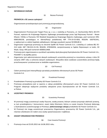 Regulamin Promocji I. INFORMACJE OGÓLNE §1 Nazwa Promocji PROMOCJA z GE zawsze zyskujesz! Organizowane przedsięwzięcie jest promocją prosprzedażową. §2 1. 2. 3. 4. Organizatorem Promocji jest Target Press sp. z o.o. z siedzibą w Poznaniu, ul. Ciechocińska 96/3, 60-473 Poznań, wpisana do Krajowego Rejestru Sądowego prowadzonego przez Sąd Rejonowy Poznań - Nowe Miasto i Wilda w Poznaniu VIII Wydział Gospodarczy Krajowego Rejestru Sadowego, pod numerem KRS: 0000196258, posiadająca nr identyfikacji podatkowej NIP 779-19-55-850; REGON: 630792341, o wpłaconym w całości kapitale zakładowym, którego wysokość wynosi 50 000,00 zł. Organizator organizuje promocję na zlecenie Spółki GE Power Controls S.A. z siedzibą ul. Lodowa 88, 92313 Łódź, NIP 728-013-21-59, REGON: 470546456, zarejestrowanej w Sądzie Rejonowym w Łodzi, XX Wydz. Gosp. KRS pod numerem 0000012468. Promocja jest organizowana w punktach sprzedaży dystrybucyjnej Dystrybutorów GE Power Controls S.A., POLIMET S. Kij Spółka jawna Organizator jest administratorem danych osobowych uczestnika promocji w rozumieniu ustawy z dnia 29 sierpnia 1997 roku o ochronie danych osobowych. Wszystkie dane osobowe uczestników promocji będą przechowywane i przetwarzane w siedzibie organizatora. §3 1. Organizator Cel Promocji Celem promocji jest intensyfikacja sprzedaży produktów oferowanych przez GE Power Controls S.A. §4 Przedmiot Promocji 1. 2. Przedmiotem Promocji są produkty GE Power Controls S.A. Promocja prowadzona jest w oparciu o zakup produktów oferowanych przez GE Power Controls S.A. Program obejmuje wyłącznie produkty zakupione przez Dystrybutorów od GE Power Controls S.A. w Polsce. II. UCZESTNICY PROMOCJI §5 1. 2. III. W promocji mogą uczestniczyć osoby fizyczne, osoby prawne, którym ustawa przyznaje zdolność prawną, w tym przedsiębiorcy i konsumenci, zwani dalej Klientami, którzy w czasie trwania Promocji dokonają u Dystrybutora uczestniczącego w Promocji jednorazowego zakupu produktów GE Power Controls S.A. W Promocji nie mogą uczestniczyć pracownicy Organizatora, pracownicy GE Power Controls S.A., jak również członkowie ich rodzin oraz osoby spowinowacone i najbliższe. ZASADY ORGANIZACYJNE PROMOCJI §6 1. Uczestnicy Promocji Czas trwania Promocji Promocja trwa od 25.05.2015 do 16.06.2015 roku. 1 2. Dla oceny uczestnictwa w Promocji uwzględniana będzie data dokonania zakupów produktów oferowanych przez Organizatora u Dystrybutora uczestniczącego w Promocji. Organizator może zmienić czas trwania Promocji podany w § 6 ust. 1 Regulaminu po uprzednim podaniu informacji o zmianie z trzydniowym wyprzedzeniem w wybranych punktach sprzedaży dystrybucyjnej. §7 1. 2. 3. 4. Promocja prowadzona jest w oparciu o zakup produktów GE Power Controls S.A. w wybranym punkcie sprzedaży dystrybucyjnej. Warunkiem uczestnictwa w Promocji jest zakup przez Klienta produktów GE Power Controls S.A. Odbiór nagród odbywać się będzie bezpośrednio u Dystrybutora po dokonaniu zakupu. Przewiduje się następujące nagrody I. II. 5. 6. 7. 8. 9. 10. Zasady Promocji Bony Sodexo o wartości 50 zł za zakup o wartości 1000 zł netto, Bony Sodexo o wartości 20 zł za zakup o wartości 500 zł netto. Warunkiem otrzymania nagrody jest dokonanie w czasie trwania promocji zakupu produktów GE Power Controls S.A. w punkcie Dystrybucyjnym. Uczestnik nie może żądać wymiany nagrody na ekwiwalent pieniężny. Uczestnik nie może domagać się, aby nagroda posiadała szczególne właściwości. Organizator nie będzie ponosił jakiejkolwiek odpowiedzialności za wady fizyczne przyznawanych nagród (odpowiedzialności z tytułu rękojmi i gwarancji). Wszelkie roszczenia związane z wadami fizycznymi rzeczy wydanych w formie nagród winny być zgłaszane bezpośrednio gwarantowi lub sprzedawcy, od którego Organizator nabył nagrody. Organizator zastrzega sobie prawo odrzucenia Formularza Odbioru Nagrody i nie dopuszczenia Uczestnika do udziału w Programie bez podania przyczyn oraz prawo wykluczenia Uczestnika z udziału w Programie w dowolnym momencie trwania Programu, bez podania przyczyn, w szczególności w przypadku wystąpienia zaległości płatniczych Uczestnika wobec Dystrybutora bądź w przypadku podania przez Uczestnika informacji nieprawdziwych. W wypadku jakichkolwiek wątpliwości związanych ze stosowaniem niniejszego regulaminu Organizator zastrzega sobie prawo do ostatecznej interpretacji jego postanowień. W wypadku wątpliwości, co do stosowania regulaminu Uczestnik ma w każdym czasie prawo zwrócić się do Organizatora o dokonanie właściwej wykładni jego postanowień. IV. SPOSÓB WYDAWANIA NAGRÓD 1. W zamian za dokonanie zakupu Uczestnik Promocji nabywa prawo do nagród, określonych w materiałach informacyjnych dostępnych u Dystrybutora. Organizator nie odpowiada za wyczerpanie się zapasów nagród. Przekazanie Organizatorowi Informacji o Odbiorze Nagrody jest równoznaczne z wyrażeniem przez Uczestnika zgody na postanowienia Regulaminu oraz gromadzenie i przetwarzanie jego danych osobowych. Administratorem danych osobowych w rozumieniu ustawy z dnia 29 sierpnia 1997 r. o ochronie danych osobowych (tj. Dz.U. z 2002 r., nr 101, poz. 926 ze zm.) jest Organizator. Uczestnik swoje dane podaje na zasadzie dobrowolności, ma prawo wglądu do nich oraz ich poprawiania. Uczestnik konkursu (osoba fizyczna) jest obowiązany zapłacić podatek w wysokości 10% od wartości wygranej nagrody jeżeli jej wartość przekracza 760 zł (zgodnie z art. 21 ust.1 pkt. 68 ustawy z dnia 26 lipca 1991r. o podatku dochodowym od osób fizycznych – tekst jednolity Dz. U. z 2010r. Nr 51, poz.307 z późn. zm. – „wolne od podatku dochodowego są: wartość wygranych w konkursach i grach organizowanych i emitowanych (ogłaszanych) przez środki masowego przekazu (prasa, radio i telewizja) oraz konkursach 2. 3. 4. 2 z dziedziny nauki, kultury, sztuki, dziennikarstwa i sportu, a także nagród