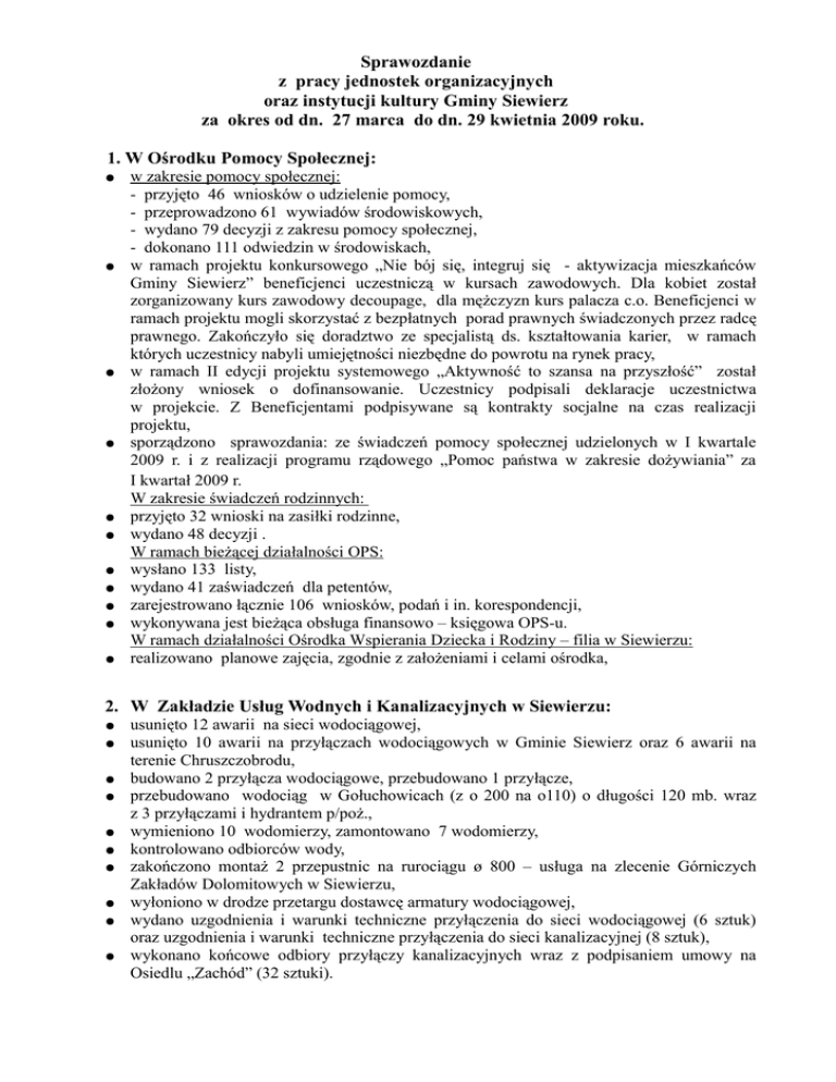 Sprawozdanie z pracy jednostek organizacyjnych oraz instytucji kultury Gminy Siewierz za okres od dn. 27 marca do dn. 29 kwietnia 2009 roku. 1. W Ośrodku Pomocy Społecznej: ● ● ● ● ● ● ● ● ● ● ● w zakresie pomocy społecznej: - przyjęto 46 wniosków o udzielenie pomocy, - przeprowadzono 61 wywiadów środowiskowych, - wydano 79 decyzji z zakresu pomocy społecznej, - dokonano 111 odwiedzin w środowiskach, w ramach projektu konkursowego „Nie bój się, integruj się - aktywizacja mieszkańców Gminy Siewierz” beneficjenci uczestniczą w kursach zawodowych. Dla kobiet został zorganizowany kurs zawodowy decoupage, dla mężczyzn kurs palacza c.o. Beneficjenci w ramach projektu mogli skorzystać z bezpłatnych porad prawnych świadczonych przez radcę prawnego. Zakończyło się doradztwo ze specjalistą ds. kształtowania karier, w ramach których uczestnicy nabyli umiejętności niezbędne do powrotu na rynek pracy, w ramach II edycji projektu systemowego „Aktywność to szansa na przyszłość” został złożony wniosek o dofinansowanie. Uczestnicy podpisali deklaracje uczestnictwa w projekcie. Z Beneficjentami podpisywane są kontrakty socjalne na czas realizacji projektu, sporządzono sprawozdania: ze świadczeń pomocy społecznej udzielonych w I kwartale 2009 r. i z realizacji programu rządowego „Pomoc państwa w zakresie dożywiania” za I kwartał 2009 r. W zakresie świadczeń rodzinnych: przyjęto 32 wnioski na zasiłki rodzinne, wydano 48 decyzji . W ramach bieżącej działalności OPS: wysłano 133 listy, wydano 41 zaświadczeń dla petentów, zarejestrowano łącznie 106 wniosków, podań i in. korespondencji, wykonywana jest bieżąca obsługa finansowo – księgowa OPS-u. W ramach działalności Ośrodka Wspierania Dziecka i Rodziny – filia w Siewierzu: realizowano planowe zajęcia, zgodnie z założeniami i celami ośrodka, 2. W Zakładzie Usług Wodnych i Kanalizacyjnych w Siewierzu: ● ● ● ● ● ● ● ● ● ● usunięto 12 awarii na sieci wodociągowej, usunięto 10 awarii na przyłączach wodociągowych w Gminie Siewierz oraz 6 awarii na terenie Chruszczobrodu, budowano 2 przyłącza wodociągowe, przebudowano 1 przyłącze, przebudowano wodociąg w Gołuchowicach (z o 200 na o110) o długości 120 mb. wraz z 3 przyłączami i hydrantem p/poż., wymieniono 10 wodomierzy, zamontowano 7 wodomierzy, kontrolowano odbiorców wody, zakończono montaż 2 przepustnic na rurociągu ø 800 – usługa na zlecenie Górniczych Zakładów Dolomitowych w Siewierzu, wyłoniono w drodze przetargu dostawcę armatury wodociągowej, wydano uzgodnienia i warunki techniczne przyłączenia do sieci wodociągowej (6 sztuk) oraz uzgodnienia i warunki techniczne przyłączenia do sieci kanalizacyjnej (8 sztuk), wykonano końcowe odbiory przyłączy kanalizacyjnych wraz z podpisaniem umowy na Osiedlu „Zachód” (32 sztuki). 3. W Miejsko-Gminnym Ośrodku Kultury w Siewierzu: w zakresie bieżącej organizacji imprez i widowni odbyły się: ● ● ● ● ● ● ● ● Kino Papieskie (projekcja filmu dokumentalnego o Janie Pawle II) i koncert zespołu Liberi Deus, VI Festiwal Artystyczny Młodzieży Ziemi Siewierskiej, IX Mistrzostwa Miasta i Gminy Siewierz w tenisie stołowym, III Kuźnia Młodych Talentów 2009”, Bajkolandia Najmłodszych – przedstawienie dla dzieci „ Cztery pory roku” Swoje cykliczne zajęcia odbywały grupy i zespoły zainteresowań tj: - Zespół Wokalny Seniorów „Ale Babki”, - Młodzieżowa Akademia Ruchu i Tańca ( pop, disco), - Klub Relaksu i Odprężenia (aerobik, joga), - Siłownia rekreacyjno-sportowa, - Klub Czasu Wolnego (bilard, piłkarzyki), - Orkiestry Dęte Gminy Siewierz, - Przedszkolny Zespół Tańca Ludowego „Mały Siewierz”, - Akademia Aktywności i Ekspresji Twórczej „KOLOROSKOP”, w zajęciach Centrum Kształcenia w Żelisławicach od 23 marca do 26 kwietnia br. uczestniczyło 280 osób, w tym dzieci i młodzież 228 osoby (81,4 %) i dorośli 52 osoby (18,6 %), z usług kserograficznych w ramach zajęć informatyczno-edukacyjnych skorzystało 46 osób, przygotowano i przedłożono Burmistrzowi sprawozdanie z działalności kulturalnej MGOK za I kwartał 2009 r. 4. W Miejsko-Gminnej Bibliotece Publicznej w Siewierzu w ramach różnych form promocji książki, w bibliotece w Siewierzu oraz w filiach zorganizowano i przeprowadzono następujące przedsięwzięcia: ● ● ● ● ● ● ● ● spotkanie autorskie z p. Pawłem Beresewiczem – pisarzem dla dzieci - odbyło się w filii w Wojkowicach Kościelnych, w ramach akcji prowadzonej przez Bibliotekę Śląską pn. „Trochę cudackie fanaberie literackie”. Jest to akcja promująca czytelnictwo w małych miejscowościach. W spotkaniu wzięły udział dzieci z kl. I – III SP w Wojkowicach Kościelnych, przeprowadzono 5 lekcji bibliotecznych i spotkanie z poezją, zorganizowano 11 wystaw, gazetek, na bieżąco prezentowano nowości wydawnicze, pomagano dzieciom w odrabianiu lekcji, organizowano dla nich gry i zabawy. W kwietniowych spotkaniach w centrali biblioteki i filiach uczestniczyło ponad 200 osób. W ramach udostępniania księgozbioru na zewnątrz: wypożyczono 8.412 książek, 408 czasopism nieoprawnych i 113 zbiorów specjalnych. Ogółem liczba odwiedzin: 1.614 czytelników. W ramach udostępniania prezencyjnego – w czytelni: wypożyczono 1.732 książki, 734 czasopisma nieoprawne i 20 zbiorów specjalnych. Ogółem liczba odwiedzin w czytelni: 585 czytelników, z czytelni internetowej - od początku istnienia „IKONKI” - skorzystało ponad 1.230 osób. W agregatowym indeksie aktywności bibliotek województwa śląskiego Miejsko – Gminna Biblioteka Publiczna w Siewierzu, za swoją działalność w 2008 roku zajęła pierwsze miejsce wśród bibliotek powiatu będzińskiego.