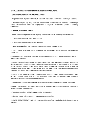 REGULAMIN TRIATHLON KRAŚNIK OLIMPIJSKI INDYWIDUALNY. I. ORGANIZATORZY i WSPÓŁORGANIZATORZY 1. Organizatorem imprezy TRIATHLON KRAŚNIK jest Strefa Triathlonu z siedzibą w Kraśniku. 2. Impreza odbywa się przy wsparciu finansowym Miasta Kraśnik, Powiatu Kraśnickiego, Gminy Dzierzkowice oraz we współpracy z Miejskim Ośrodkiem Sportu i Rekreacji w Kraśniku. II. TERMIN, DYSTANSE, TRASY 1. Biuro zawodów będzie mieściło się przy Zalewie Kraśnickim. Godziny otwarcia biura: - 27.08.2016 r. sobota w godz. 17.00-19.00 - 28.08.2016 r. niedziela w godz. 08.00-11.00 2. TRIATHLON KRAŚNIK 2016 dystans olimpijski (1,5 km/ 40 km/ 10 km). 3. Start i Meta. Start oraz meta znajdować się będzie przy plaży miejskiej nad Zalewem Kraśnickim. 4. Pływanie – 1,5 km (Zalew Kraśnicki, spodziewana temperatura wody w sierpniu: 19-24°C, start z plaży miejskiej.) 5. Rower – 40 km (Trasa płaska, pomiar trasy GPS. Na całej trasie ruch drogowy otwarty, na skrzyżowaniach i innych punktach kolizyjnych zabezpieczenie ze strony Policji, Ochotniczej Straży Pożarnej. Należy przestrzegać zasad ruchu drogowego, podczas trasy trzymać się prawej strony jezdni. Kask obowiązkowy. Podczas konkurencji kolarskiej obowiązuje zakaz używania słuchawek do odbioru sygnałów dźwiękowych). 6. Bieg – 10 km (Zalew Kraśnicki); nawierzchnia: kostka brukowa. Oznaczenia długości trasy co 1km, pomiar trasy GPS. Podczas konkurencji biegowej obowiązuje zakaz używania słuchawek do odbioru sygnałów dźwiękowych. 7. Strefa zmian zlokalizowana będzie bezpośrednio przy wyjściu z wody (Zalew Kraśnicki). 8. Punkty odżywiania – na trasie dwa punkty, w punktach dostępne będą napoje izotoniczne, woda mineralna niegazowana. 9. Toalety przenośne – zlokalizowane blisko strefy zmian. 11. Pomiar czasu – elektroniczny z wykorzystaniem chipów. 12. KASK OBOWIĄZKOWY na trasie rowerowej i w strefie zmian (od wzięcia do odstawienia roweru). III. KLASYFIKACJE i KATEGORIE WIEKOWE Kobiety K Open K1 (18-24 lata) K2 (25-34 lata) K3 (35-44 lata) K4 (45 lat i więcej) KK (najlepsza Kraśniczanka) Mężczyźni M Open M1 (18-24 lata) M2 (25-34 lat) M3 (35-44 lata) M4 (45-54 lat) M5 (55 lat i więcej) MK (najlepszy Kraśniczanin) O przynależności do kategorii Kraśniczanka/Kraśniczanin decyduje udokumentowanie stałego lub czasowego miejsca zameldowania. IV. NAGRODY 1.Ceremonia wręczania nagród odbędzie się przy Zalewie Kraśnickim zgodnie z programem minutowym imprezy. 2. Zdobywcy miejsc I-III w klasyfikacji generalnej mężczyzn i kobiet TRIATHLON KRAŚNIK otrzymają nagrody rzeczowe lub pieniężne ufundowane w formie voucherów i puchary. 3. Zdobywcy miejsc I-III w klasyfikacji generalnej mężczyzn i kobiet TRIATHLON KRAŚNIK nie biorą udziału w klasyfikacji poszczególnych kategorii wiekowych. 4. Zdobywcy miejsc I-III wśród kobiet i mężczyzn w poszczególnych kategoriach wiekowych oraz kategorii Kraśniczan otrzymają pamiątkowe statuetki. 5. Odbiór osobisty, wyłącznie podczas ceremonii wręczania nagród. 6. Organizator zastrzega sobie prawo do wprowadzenia dodatkowych nagród w wybranych przez siebie kategoriach. 7. Wszyscy uczestnicy, którzy ukończyli TRIATHLON KRAŚNIK otrzymają pamiątkowe medale. 8. Wśród wszystkich uczestników, którzy ukończą TRIATHLON KRAŚNIK zostaną rozlosowane nagrody rzeczowe. V. WARUNKI UCZESTNICTWA 1. W zawodach mogą wziąć udział osoby pełnoletnie, które podpiszą oświadczenie o braku przeciwwskazań medycznych do udziału w imprezie. VI. ZGŁOSZENIA I OPŁATA STARTOWA 1. Zgłoszenia do TRIATHLON KRAŚNIK będą przyjmowane poprzez formularz zgłoszeniowy dostępny na stronie internetowej www.triathlonkrasnik.pl. 2. Zgłoszenia on-line będą przyjmowane do dnia 20 sierpnia 2016r. Po tym terminie zgłoszenia nie będą przyjmowane. 3. Za zgłoszenie uważa się dostarczenie prawidłowo wypełnionego formularza zgłoszeniowego i podpisanego oświadczenia oraz uiszczenie opłaty startowej. 4. Limit uczestników w Triathlon Kraśnik dystans olimpijski wynosi 100 osób. Organizator zastrzega sobie prawo do zwiększenia limitu zgłoszeń. 5. Opłata startowa za udział w TRIATHLON KRAŚNIK w zależności od terminu wpłaty wynosi: - do 30 kwietnia 2016r. - 130 PLN - do 30 czerwca 2016r. - 160 PLN - do 30 lipca 2016r. - 190 PLN - do 20 sierpnia 2016r. – 190 PLN – bez pełnego pakietu startowego. 6. Uczestnik jest zobowiązany do wniesienia opłaty startowej w ciągu 7 dni od momentu dokonania zgłoszenia. W przeciwnym wypadku jego zgłoszenie zostanie anulowane. 7. Dowodem przyjęcia opłaty startowej jest pojawienie się numeru startowego przy nazwisku zawodnika. 8. O terminie zgłoszenia decyduje data dokonania opłaty za wpisowe przez uczestnika zawodów, za którą przyjmuje się datę zaksięgowania kwoty wpisowego na rachunku bankowym Organizatora. 9. W przypadku wniesienia opłaty startowej w niewystarczającej wysokości (np. w wyniku przekroczenia terminu wpłaty określonego w niniejszym regulaminie) zawodnik jest zobowiązany do dopłacenia różnicy do wysokości kwoty, jaką winien on był wnieść zgodnie z terminem, w jakim dokonał pierwszej opłaty. 10. Podczas odbioru pakietu zawodnicy muszą posiadać dokument ze zdjęciem celem weryfikacji danych osobowych oraz wieku. 11. Nie ma możliwości przeniesienia raz wniesionej opłaty na innego uczestnika lub na inny rok. 12. Organizator zwraca 50% opłaty startowej do dnia 31.07.2016 r. po wcześniejszym powiadomieniu przesłanym na adres [email protected]. Po w/w terminie organizator nie zwraca opłaty startowej. 13. W ramach opłaty startowej każdy uczestnik TRIATHLON KRAŚNIK otrzymuje: - ubezpieczenie NNW na kwotę 10.000 zł, - numery startowe wraz z agrafkami, - czepek, - pamiątkową koszulkę TRIATHLON KRAŚNIK, - napoje (woda, izotonik), owoce na punktach odświeżania i w strefie mety - medal na mecie, - upominki od sponsorów i partnerów imprezy. VII. NOCLEGI I WY