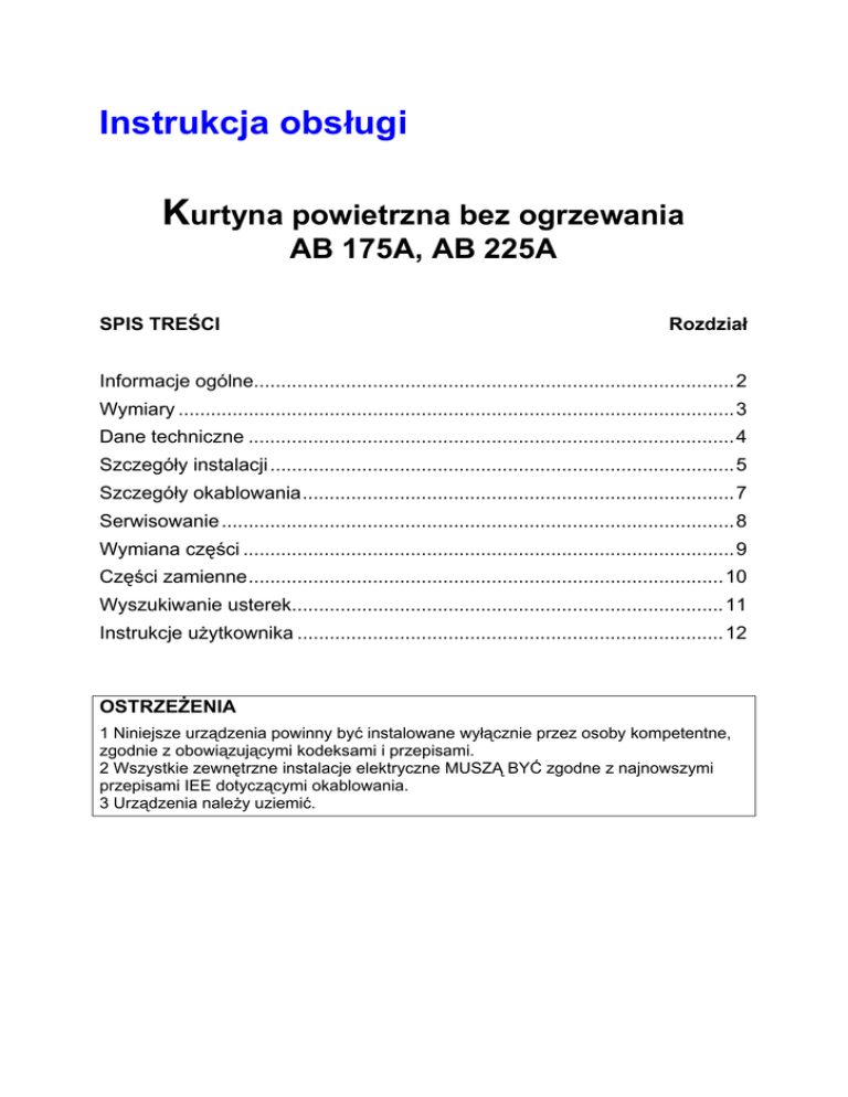 Instrukcja obsługi Kurtyna powietrzna bez ogrzewania AB 175A, AB 225A SPIS TREŚCI Rozdział Informacje ogólne.........................................................................................2 Wymiary .......................................................................................................3 Dane techniczne ..........................................................................................4 Szczegóły instalacji ......................................................................................5 Szczegóły okablowania................................................................................7 Serwisowanie ...............................................................................................8 Wymiana części ...........................................................................................9 Części zamienne........................................................................................10 Wyszukiwanie usterek................................................................................11 Instrukcje użytkownika ...............................................................................12 OSTRZEŻENIA 1 Niniejsze urządzenia powinny być instalowane wyłącznie przez osoby kompetentne, zgodnie z obowiązującymi kodeksami i przepisami. 2 Wszystkie zewnętrzne instalacje elektryczne MUSZĄ BYĆ zgodne z najnowszymi przepisami IEE dotyczącymi okablowania. 3 Urządzenia należy uziemić. 1. Informacje ogólne Prezentujemy nowe modele kurtyn powietrznych bez ogrzewania Airbloc AB. Przepisy prawa mogą być różne w różnych krajach; instalator ma obowiązek przestrzegać przepisów obowiązujących w danym kraju. Procedury instalacji, montażu, przekazania do eksploatacji i serwisowania muszą być wykonywane przez osoby z odpowiednimi kwalifikacjami i zgodnie z przepisami obowiązującymi w kraju użytkowania. Podczas montażu, instalacji, przekazywania do eksploatacji oraz serwisowania kurtyn powietrznych należy przestrzegać przepisów dotyczących pracy na wysokości. Wszystkie wymiary podane zostały w mm (o ile nie określono inaczej). Producent zastrzega sobie prawo do zmiany danych technicznych bez uprzedzenia. PRZECZYTAJ ten dokument przed rozpoczęciem instalacji, aby zapoznać się z częściami i narzędziami wymaganymi na różnych etapach instalacji. Głównym powodem instalowania kurtyn powietrznych jest zapobieganie przedostawaniu Bez kurtyny powietrznej się zimnego powietrza przez drzwi do obszaru ogrzewanego. Typowe zastosowania to duże bramy na rampach załadunkowych w fabrykach i magazynach oraz drzwi wewnętrzne pomiędzy obszarami o różnych temperaturach. W szerszych otworach drzwiowych można zamontować dwa lub więcej urządzeń skręconych razem. Kurtyny powietrzne kontrolują klimat wewnętrzny kierując strumień powietrza o dużej prędkości na podłogę, tworząc w ten sposób barierę powietrza w obszarze drzwi. Aby zapobiec przeciągom powietrza z zewnątrz, żaluzje wylotowe kierowane są na zewnątrz, tak by powietrze wychodzące z budynku zderzało się z podmuchem powietrza z zewnątrz i odrzucało go (patrz rysunek poniżej). Kurtyny powietrzne Airbloc zapewniają równomierną dystrybucję powietrza na całej szerokości drzwi, utrzymując podgrzane lub klimatyzowane powietrze wewnątrz budynku i zapobiegając dostawaniu się do środka zimnego powietrza, podmuchów i pyłu. W tej instrukcji obsługi zawarte zostały szczegółowe informacje na temat instalacji kurtyn powietrznych Airbloc. Bardzo ważne jest, by te urządzenia były instalowane zgodnie z zaleceniami producenta. Z kurtyną powietrzną Wlot powietrza Na zewnątrz Schemat przepływu Wewnątrz 2. Wymiary Model WIDOK OGÓLNY WIDOK OD DOŁU WIDOK OD PRZODU WIDOK Z Rysunek 1: Wymiary A B C D E F G Masa mm mm mm mm mm mm mm (kg) AB 175A 1750 523 457 507 260 86 1695 90 AB 225A 2250 523 457 507 260 86 2195 115 3. Dane techniczne Model kurtyny powietrznej AB 175A AB 225A Wentylatory Odśrodkowy (z wbudowanym wyłącznikiem termicznym) Typ Prędkości 3 3 Liczba wentylatorów 4 3 9425m3/h 7068 m /h Maksymalny przepływ 230 V, 1 faza, 50 Hz Napięcie 550 W Moc znam. (jeden wentylator) 4,5 A (maks.) Prąd (jeden wentylator) 11,25 A Prąd rozruchowy (jeden wentylator) Moc Pobór całkowity energii elektrycznej 1650 kW 2200 kW Budowa Model AB175 AB350= X2 AB400= X1 AB450= AB225 X1 X2 AB525= X3 AB575= X2 X1 AB625= X1 X2 AB675= X3 4. Szczegóły instalacji Przepisy BHP Należy zwrócić uwagę na obowiązki wynikające z przepisów ustawy o BHP z 1974 r. oraz odpowiednich kodeksów branżowych. Dodatkowo, instalację powinien wykonać wykwalifikowany instalator zgodnie z obowiązującymi przepisami okablowania IEE oraz wszystkimi innymi normami brytyjskimi i kodeksami branżowymi. Przed rozpoczęciem instalacji odłączyć zasilanie elektryczne od grzejnika i panelu sterowania. Dla własnego bezpieczeństwa zaleca się stosowanie sprzętu ochrony osobistej. Kurtyny powietrzne Airbloc dostarczane są ze wstępnie zamontowanymi wspornikami montażowymi; można je montować jako pojedyncze urządzenia lub w zespołach skręconych razem, dostosowanych do drzwi o różnych szerokościach. Minimalna wysokość montażu wynosi 3 metry (patrz rysunek 2 poniżej). 4.1 Każdą osobną kurtynę powietrzną należy zamontować we wspornikach podporowych (nie dołączonych), a następnie do konstrukcji budynku poprzez bezpośrednie skręcenie razem z użyciem odpowiednich wsporników nośnych lub podwieszenie na odpowiedniej konstrukcji stalowej (patrz rysunek 3 na stronie 6). 4.2 Kilka kurtyn powietrznych można skręcić razem za pomocą 3 dodatkowych śrub ustalających M10, nakrętek i podkładek, poprzez otwory we wspornikach montażowych; następnie odpowiednie ceowniki nośne (nie dołączone) należy zamocować do wsporników zamontowanych fabrycznie na całej długości zmontowanych kurtyn, aby równomiernie rozłożyć obciążen