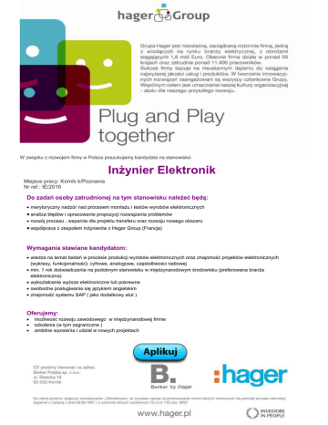 W związku z rozwojem firmy w Polsce poszukujemy kandydata na stanowisko: Inżynier Elektronik Miejsce pracy: Kórnik k/Poznania Nr ref.: IE/2016 Do zadań osoby zatrudnionej na tym stanowisku należeć będą: merytoryczny nadzór nad procesem montażu i testów wyrobów elektronicznych analiza błędów i opracowanie propozycji rozwiązania problemów rozwój procesu , wsparcie dla projektu transferu oraz rozwoju nowego obszaru współpraca z zespołem inżynierów z Hager Group (Francja) Wymagania stawiane kandydatom: wiedza na temat badań w procesie produkcji wyrobów elektronicznych oraz znajomość projektów elektronicznych (wykresy, funkcjonalność): cyfrowe, analogowe, częstotliwości radiowej min. 1 rok doświadczenia na podobnym stanowisku w międzynarodowym środowisku (preferowana branża elektroniczna) wykształcenie wyższe elektroniczne lub pokrewne swobodne posługiwanie się językiem angielskim znajomość systemu SAP ( jako dodatkowy atut ) Oferujemy: możliwość rozwoju zawodowego w międzynarodowej firmie szkolenia (w tym zagraniczne ) ambitne wyzwania i udział w nowych projektach