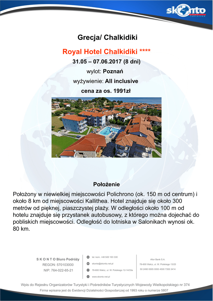 Grecja/ Chalkidiki Royal Hotel Chalkidiki **** 31.05 – 07.06.2017 (8 dni) wylot: Poznań wyżywienie: All inclusive cena za os. 1991zł Położenie Położony w niewielkiej miejscowości Polichrono (ok. 150 m od centrum) i około 8 km od miejscowości Kallithea. Hotel znajduje się około 300 metrów od pięknej, piaszczystej plaży. W odległości około 100 m od hotelu znajduje się przystanek autobusowy, z którego można dojechać do pobliskich miejscowości. Odległość do lotniska w Salonikach wynosi ok. 80 km. Plaża Hotel znajduje się ok. 300 metrów od pięknej, piaszczystej plaży. Leżaki i parasole za dodatkową opłatą (około 6 EUR/dzień). Do dyspozycji gości Recepcja, sejf w recepcji (dodatkowo płatny około 10 EUR/tydzień), restauracja, bar, bar przy basenie, ogród, wypożyczalnia rowerów. 2 baseny (z wodą słodką), leżaki i parasole przy basenie bezpłatnie. Pokoje Hotel posiada 70 całkowicie wyremonotowanycyh w 2015 i 2016 r. pokoi. Pokój typu standard: komfortowy, dwuosobowy lub trzyosobowy pokój z łazienką (prysznic lub wanna, WC). Wyposażony w indywidualnie sterowaną klimatyzację, balkon lub taras z meblami tarasowymi, TV-sat, lodówkę. Dostępne są również pokoje rodzinne oferujące możliwość zakwaterowania maksymalnie 4 osób. Wyżywienie All inclusive: śniadania, lunch oraz kolacje w formie bufetu. W ciągu dnia lokalne napoje alkoholowe (piwo, ouzo, tsipuro, wino) i bezalkoholowe (herbata, kawa filtrowana, woda, soki) w godzinach 10:00-22:00, w wyznaczonych barach. Program sportowy i animacyjny Tenis stołowy, minigolf, plac zabaw dla dzieci, szachy ogrodowe. Internet Internet Wi-Fi w pokojach (dodatkowo płatny, ok. 5 EUR/dzień). Kącik internetowy w lobby (30 min/dziennie bezpłatnie).