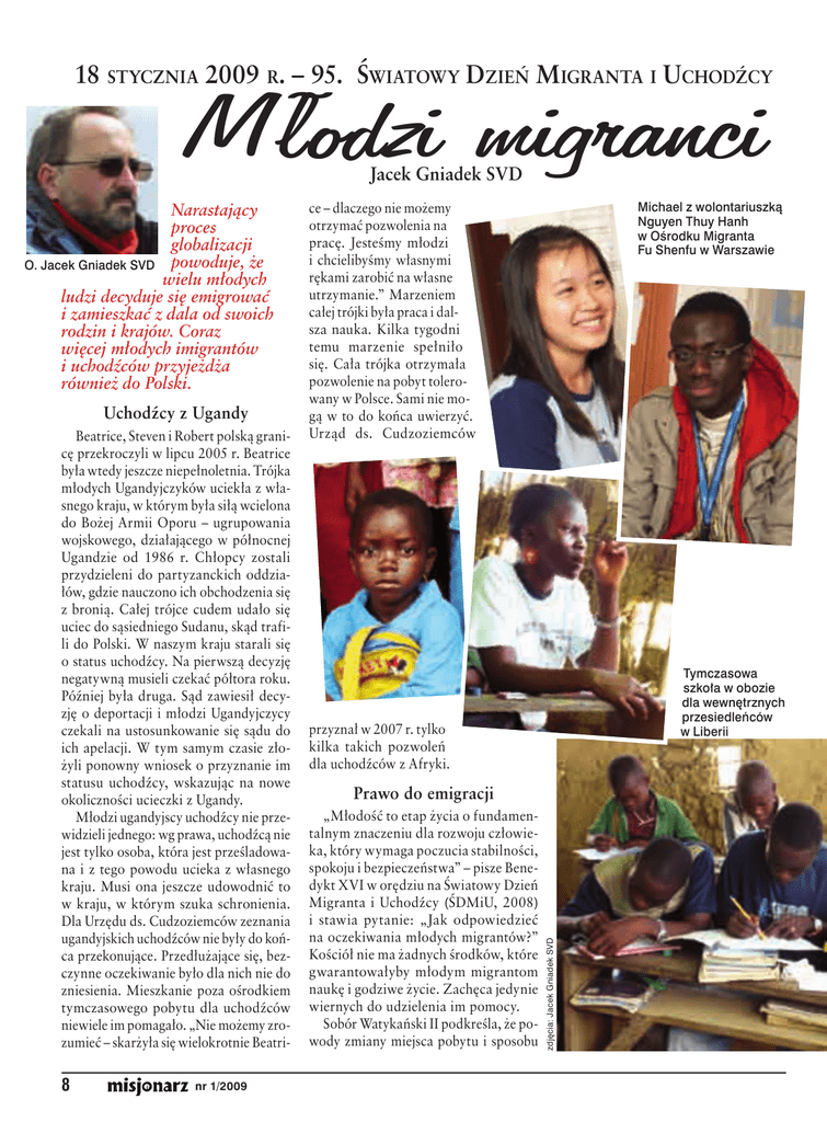 18 stycznia 2009 r. – 95. Światowy Dzień Migranta i Uchodźcy Młodzi migranci Jacek Gniadek SVD Uchodźcy z Ugandy Beatrice, Steven i Robert polską granicę przekroczyli w lipcu 2005 r. Beatrice była wtedy jeszcze niepełnoletnia. Trójka młodych Ugandyjczyków uciekła z własnego kraju, w którym była siłą wcielona do Bożej Armii Oporu – ugrupowania wojskowego, działającego w północnej Ugandzie od 1986 r. Chłopcy zostali przydzieleni do partyzanckich oddziałów, gdzie nauczono ich obchodzenia się z bronią. Całej trójce cudem udało się uciec do sąsiedniego Sudanu, skąd trafili do Polski. W naszym kraju starali się o status uchodźcy. Na pierwszą decyzję negatywną musieli czekać półtora roku. Później była druga. Sąd zawiesił decyzję o deportacji i młodzi Ugandyjczycy czekali na ustosunkowanie się sądu do ich apelacji. W tym samym czasie złożyli ponowny wniosek o przyznanie im statusu uchodźcy, wskazując na nowe okoliczności ucieczki z Ugandy. Młodzi ugandyjscy uchodźcy nie przewidzieli jednego: wg prawa, uchodźcą nie jest tylko osoba, która jest prześladowana i z tego powodu ucieka z własnego kraju. Musi ona jeszcze udowodnić to w kraju, w którym szuka schronienia. Dla Urzędu ds. Cudzoziemców zeznania ugandyjskich uchodźców nie były do końca przekonujące. Przedłużające się, bezczynne oczekiwanie było dla nich nie do zniesienia. Mieszkanie poza ośrodkiem tymczasowego pobytu dla uchodźców niewiele im pomagało. „Nie możemy zrozumieć – skarżyła się wielokrotnie Beatri- 8 nr 1/2009 Michael z wolontariuszką Nguyen Thuy Hanh w Ośrodku Migranta Fu Shenfu w Warszawie ce – dlaczego nie możemy otrzymać pozwolenia na pracę. Jesteśmy młodzi i chcielibyśmy własnymi rękami zarobić na własne utrzymanie.” Marzeniem całej trójki była praca i dalsza nauka. Kilka tygodni temu marzenie spełniło się. Cała trójka otrzymała pozwolenie na pobyt tolerowany w Polsce. Sami nie mogą w to do końca uwierzyć. Urząd ds. Cudzoziemców Tymczasowa szkoła w obozie dla wewnętrznych przesiedleńców w Liberii przyznał w 2007 r. tylko kilka takich pozwoleń dla uchodźców z Afryki. Prawo do emigracji „Młodość to etap życia o fundamentalnym znaczeniu dla rozwoju człowieka, który wymaga poczucia stabilności, spokoju i bezpieczeństwa” – pisze Benedykt XVI w orędziu na Światowy Dzień Migranta i Uchodźcy (ŚDMiU, 2008) i stawia pytanie: „Jak odpowiedzieć na oczekiwania młodych migrantów?” Kościół nie ma żadnych środków, które gwarantowałyby młodym migrantom naukę i godziwe życie. Zachęca jedynie wiernych do udzielenia im pomocy. Sobór Watykański II podkreśla, że powody zmiany miejsca pobytu i sposobu zdjęcia: Jacek Gniadek SVD Narastający proces globalizacji O. Jacek Gniadek SVD powoduje, że wielu młodych ludzi decyduje się emigrować i zamieszkać z dala od swoich rodzin i krajów. Coraz więcej młodych imigrantów i uchodźców przyjeżdża również do Polski. życia bywają różne (Konstytucja duszpasterska o Kościele, 6). Kościół uznaje prawo każdego człowieka do emigracji i zasadniczo nie odróżnia migrantów ekonomicznych od uchodźców. Katolicka nauka społeczna używa terminu „uchodźca” w szerszym znaczeniu niż prawo międzynarodowe, stosując go również do ofiar błędnych systemów ekonomicznych i do ludzi wewnętrznie przesiedlonych. Wszyscy migranci są postrzegani przez Kościół jako ludzie, którzy są w drodze do określonego celu. Prawo do emigracji łączy się jednak z chrześcijańskim obowiązkiem udzielania gościnności. Przyjęcie obcego jest zasadniczym wyznacznikiem Kościoła katolickiego („katolicki” pochodzi z języka greckiego i oznacza „powszechny”). Kościół, który byłby zamknięty na przyjęcie każdej osoby bez względu na pochodzenie, przestałby być widzialnym znakiem zbawienia dla wszystkich ludzi (por. Erga migrantes caritas Christi, 22). Czasowi migranci Studenci z innych krajów stanowią dla Benedykta XVI szczególną kategorię czasowych migrantów. Grupie tej papież poświęcił w całości swoje ubiegłoroczne orędzie. Liczba studentów zagranicznych wzrasta nieustannie, również w naszym kraju. Jan Paweł II w swojej encyklice o pracy wyraźnie stwierdza, że każdy człowiek ma prawo do zmiany miejsca zamieszkania, by szukać lepszych warunków życia (por. Laborem exercens, 23) lub studiowania w innym kraju. W ubiegło- rocznym orędziu Benedykt XVI zachęca wiernych do pomocy zagranicznym studentom, którzy „często czują się osamotnieni, obciążeni obowiązkami związanymi z nauką, a czasem także zmagają się z trudnościami ekonomicznymi”. Ponad rok temu w Ośrodku Migranta Fu Shenfu w Warszawie spotkałem po raz pierwszy Michaela, 20-letniego wówczas studenta z Ghany z licencjatem z ekonomii w kieszeni. Do Polski przyjechał po kilkumiesięcznym pobycie na Ukrainie, gdzie pojechał na dalsze studia specjalistyczne. Stypendium studenckie otrzymał od lokalnej, ghańskiej organizacji pozarządowej. Rodzina Michaela musiała jednak pokryć z góry 20 proc. kosztów jego studiów. Po kilku miesiącach na Ukrainie został bez pieniędzy. Sponsor młodego studenta z Ghany okazał się być zwyczajnym oszustem. Michael mógł kontynuować dalsze studia tylko dzięki pomocy rodziny, która jednocześnie próbowała na drodze prawnej odzyskać wyłudzone od niej pieniądze. W Warszawie Michael studiował stosunki międzynarodowe. Jego ojciec, mimo że sam nie miał wyższego wykształcenia, wzbudził u swojego syna zapał do nauki. Młody Ghańczyk z głębokim wzruszeniem wspomina ostatnie słowa ojca przed śmiercią skierowane do jego matki: „Pamiętaj, aby naszym dzieciom zapewnić najlepsze wykształcenie”. Michael był zadowolony ze studiów, choć nie ukrywał, że Polskę wybrał tylko dlatego, iż życie i studia były tutaj tańsze niż w zachodniej Europie. Kilka miesię