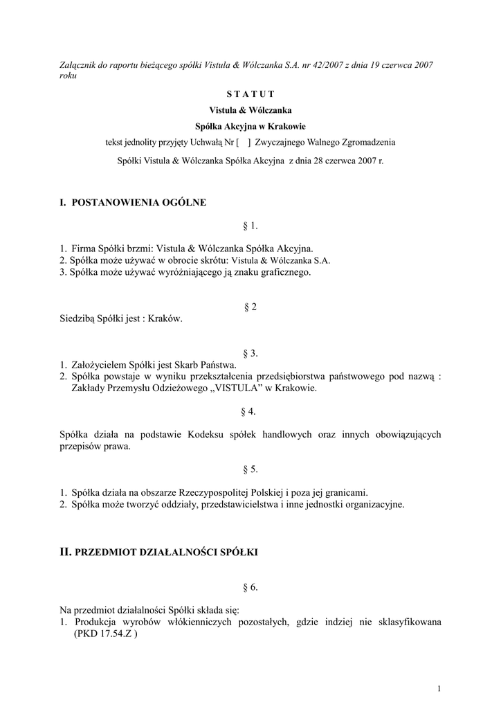 Załącznik do raportu bieŜącego spółki Vistula & Wólczanka S.A. nr 42/2007 z dnia 19 czerwca 2007 roku STATUT Vistula & Wólczanka Spółka Akcyjna w Krakowie tekst jednolity przyjęty Uchwałą Nr [ ] Zwyczajnego Walnego Zgromadzenia Spółki Vistula & Wólczanka Spółka Akcyjna z dnia 28 czerwca 2007 r. I. POSTANOWIENIA OGÓLNE § 1. 1. Firma Spółki brzmi: Vistula & Wólczanka Spółka Akcyjna. 2. Spółka moŜe uŜywać w obrocie skrótu: Vistula & Wólczanka S.A. 3. Spółka moŜe uŜywać wyróŜniającego ją znaku graficznego. §2 Siedzibą Spółki jest : Kraków. § 3. 1. ZałoŜycielem Spółki jest Skarb Państwa. 2. Spółka powstaje w wyniku przekształcenia przedsiębiorstwa państwowego pod nazwą : Zakłady Przemysłu OdzieŜowego „VISTULA” w Krakowie. § 4. Spółka działa na podstawie Kodeksu spółek handlowych oraz innych obowiązujących przepisów prawa. § 5. 1. Spółka działa na obszarze Rzeczypospolitej Polskiej i poza jej granicami. 2. Spółka moŜe tworzyć oddziały, przedstawicielstwa i inne jednostki organizacyjne. II. PRZEDMIOT DZIAŁALNOŚCI SPÓŁKI § 6. Na przedmiot działalności Spółki składa się: 1. Produkcja wyrobów włókienniczych pozostałych, gdzie indziej nie sklasyfikowana (PKD 17.54.Z ) 1 2. Produkcja dzianin ( PKD 17.60.Z ) 3. Produkcja wyrobów pończoszniczych ( PKD 17.71.Z ) 4. Produkcja odzieŜy dzianej ( PKD 17.72.Z ) 5. Produkcja odzieŜy skórzanej ( PKD 18.10.Z ) 6. Produkcja ubrań roboczych ( PKD 18.21.Z ) 7. Produkcja ubrań wierzchnich dla męŜczyzn i chłopców pozostała ( PKD 18.22.A ) 8. Produkcja ubrań wierzchnich dla kobiet i dziewcząt pozostała ( PKD 18.22.B ) 9. Produkcja bielizny ( PKD 18.23.Z ) 10. Produkcja pozostałej odzieŜy i dodatków do odzieŜy, gdzie indziej nie sklasyfikowana ( PKD 18.24.Z ) 11. Produkcja wyrobów kaletniczych i rymarskich (PKD 19.20.Z ) 12. Produkcja obuwia, z wyjątkiem sportowego (PKD 19.30.A ) 13. Produkcja obuwia sportowego (PKD 19.30.B ) 14. SprzedaŜ hurtowa wyrobów włókienniczych ( PKD 51.41.Z ) 15. SprzedaŜ hurtowa odzieŜy i obuwia ( PKD 51.42.Z ) 16. SprzedaŜ detaliczna wyrobów włókienniczych ( PKD 52.41.Z ) 17. SprzedaŜ detaliczna odzieŜy ( PKD 52.42.Z ) 18. SprzedaŜ detaliczna obuwia i wyrobów skórzanych ( PKD 52.43.Z ) 19. Działalność agentów zajmujących się sprzedaŜą wyrobów włókienniczych, odzieŜy, obuwia i artykułów skórzanych ( PKD 51.16.Z); 20. Naprawa artykułów uŜytku osobistego i domowego, gdzie indziej nie sklasyfikowana ( PKD 52.74.Z ); 21. Pranie i czyszczenie wyrobów włókienniczych i futrzarskich ( PKD 93.01.Z ); 22. Produkcja wyrobów kosmetycznych i toaletowych ( PKD 24.52.Z ); 23. Produkcja artykułów jubilerskich i podobnych, gdzie indziej nie sklasyfikowana (PKD 36.22.Z ) 24. Produkcja wyrobów pozostała, gdzie indziej nie sklasyfikowana ( PKD 36.63.Z ) 25. SprzedaŜ hurtowa perfum i kosmetyków (PKD 51.45.Z); 26. SprzedaŜ hurtowa pozostałych artykułów uŜytku domowego i osobistego (PKD 51.47.Z); 27. SprzedaŜ detaliczna kosmetyków i artykułów toaletowych (PKD 52.33.Z); 28. SprzedaŜ detaliczna zegarów, zegarków oraz biŜuterii (PKD 52.48.C); 29. SprzedaŜ detaliczna artykułów sportowych (PKD 52.48.D); 30. Przeładunek towarów w pozostałych punktach przeładunkowych (PKD 63.11.C); 31. Magazynowanie i przechowywanie towarów w pozostałych składowiskach (PKD 63.12.C); 32. Zarządzanie nieruchomościami niemieszkalnymi (PKD 70.32. B); 33. Wynajem nieruchomości na własny rachunek (PKD 70.20.Z); 34. Doradztwo w zakresie prowadzenia działalności gospodarczej i zarządzania (PKD 74.14.A); 35. Pozostała działalność komercyjna, gdzie indziej nie sklasyfikowana (PKD 74.84.B); 36. Działalność związana z zarządzaniem holdingami (PKD 74.15.Z); 37. Pozostałe pośrednictwo finansowe, gdzie indziej nie sklasyfikowane (PKD 65.23.Z).” III. KAPITAŁ WŁASNY § 7. Kapitał własny Spółki obejmuje jej kapitał zakładowy, kapitał zapasowy i inne kapitały rezerwowe. 2 § 8. 1. Kapitał zakładowy dzieli się na 80.222.190 (osiemdziesiąt milionów dwieście dwadzieścia dwa tysiące sto dziewięćdziesiąt) akcji o wartości nominalnej 20 gr (dwadzieścia groszy) kaŜda. 2. Kapitał zakładowy wynosi 18.275.378 zł (osiemnaście milionów dwieście siedemdziesiąt pięć tysięcy trzysta siedemdziesiąt osiem złotych). § 9. 1. 2. 3. Określa się wartość nominalną warunkowego podwyŜszenia kapitału zakładowego Spółki na kwotę nie wyŜszą niŜ 1.068.000 zł (jeden milion sześćdziesiąt osiem tysięcy złotych). Warunkowe podwyŜszenie kapitału zakładowego następuje w drodze emisji akcji na okaziciela serii C o wartości nominalnej 20 gr (dwadzieścia groszy) kaŜda w liczbie nie większej niŜ 1.400.000 (jeden milion czterysta tysięcy) oraz emisji akcji na okaziciela serii E o wartości nominalnej 20 gr (dwadzieścia groszy) kaŜda w liczbie nie większej niŜ 3.940.000 (trzy miliony dziewięćset czterdzieści tysięcy). Akcje serii C oraz serii E obejmowane będą odpowiednio przez uprawnionych z warrantów subskrypcyjnych serii A i serii B emitowanych na podstawie uchwały nr 3 Nadzwyczajnego Walnego Zgromadzenia Spółki z dnia 30 marca 2005 r., w brzmieniu zmienionym uchwałą nr 17 Zwyczajnego Walnego Zgromadzenia Spółki z dnia 28 czerwca 2005 r. oraz uchwałą nr 4 Nadzwyczajnego Walnego Zgromadzenia Spółki z dnia 13 listopada 2006 r. § 10. 1. Wszystkie akcje Spółki są akcjami na okaziciela. 2. Akcje mogą być umarzane w sposób i na warunkach określonych uchwałą Walnego Zgromadzenia. § 11. 1. Bank - Emitent prowadzący emisję akcji Spółki wydaje akcjonariuszom świadectwo depozytowe, stanowiące dowód, Ŝe osoba w nim określona jest właścicielem akcji na okaziciela znajdujących się w depozycie. 2. Świadectwo depozytowe jest wyłącznym dowodem stwierdzającym uprawnienie do rozporządzania i wykonywania innych praw z akcji. IV. ORGANY SPÓŁKI 