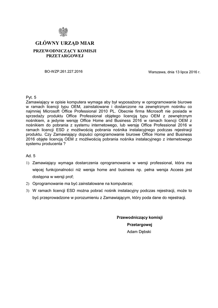 GŁÓWNY URZĄD MIAR PRZEWODNICZĄCY KOMISJI PRZETARGOWEJ BO-WZP.261.227.2016 Warszawa, dnia 13 lipca 2016 r. Pyt. 5 Zamawiający w opisie komputera wymaga aby był wyposażony w oprogramowanie biurowe w ramach licencji typu OEM, zainstalowane i dostarczone na zewnętrznym nośniku co najmniej Microsoft Office Professional 2010 PL. Obecnie firma Microsoft nie posiada w sprzedaży produktu Office Professional objętego licencją typu OEM z zewnętrznym nośnikiem, a jedynie wersję Office Home and Business 2016 w ramach licencji OEM z nośnikiem do pobrania z systemu internetowego, lub wersję Office Professional 2016 w ramach licencji ESD z możliwością pobrania nośnika instalacyjnego podczas rejestracji produktu. Czy Zamawiający dopuści oprogramowanie biurowe Office Home and Business 2016 objęte licencją OEM z możliwością pobrania nośnika instalacyjnego z internetowego systemu producenta ? Ad. 5 1) Zamawiający wymaga dostarczenia oprogramowania w wersji professional, która ma więcej funkcjonalności niż wersja home and business np. pełna wersja Access jest dostępna w wersji prof; 2) Oprogramowanie ma być zainstalowane na komputerze; 3) W ramach licencji ESD można pobrać nośnik instalacyjny podczas rejestracji, może to być przeprowadzone w porozumieniu z Zamawiającym, który poda dane do rejestracji. Przewodniczący komisji Przetargowej Adam Dębski