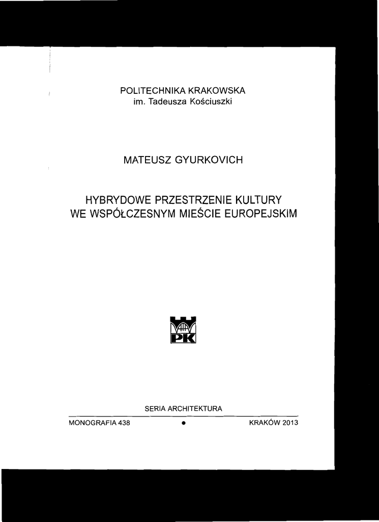 POLITECHNIKA KRAKOWSKA im. Tadeusza Kosciuszki MATEUSZ GYURKOVICH HYBRYDOWE PRZESTRZENIE KULTURY WE WSPOtCZESNYM MIESCIE EUROPEJSKIM SERIA ARCHITEKTURA MONOGRAFIA 438 • KRAK6w 2013 SPIS TRESCI Wprowadzenie . I. Obszar badall. Wspolczesne miasto europejskie w perspektywie globalnej 2. Przedmiot badan. Wprowadzenie w problematyktr wspolczesnych przestrzeni kultury 3. Stan badan................................................................................................................................... 4. Cel, hipotezy badawcze, metoda i konstrukcja pracy 4.1. Cel pracy 4.2. Hipotezy badawcze 4.3. Metoda i konstrukcja pracy................................................................................................. CztrSC I Hybrydowe obszary kultury w miastach 1. Centra miast historycznychjako multifunkcjonalne obszary kultury......................................... 1.1. Wenecja............................................................................................................................... 1.2. Krakow. 1.3. Salzburg . 1.4. Podsumowanie 2. Specjalistyczne dzielnice kultury................................................................................................ 2.1. Najstarsza dzielnica muzeow w Europie - Museumsinsel, Berlin 2.2. Wynik mecenatu wladcow Bawarii - Kunstareal, Monachium 2.3. Jedna z pierwszych wielofunkcyjnych dzielnic kultury - Keiserforum,Wieden................ 2.4. Dwa odmienne modele ksztahowania specjalistycznych dzielnic kultury w miescie globalnym - West End i South Bank, Londyn.................................................................... 2.5. Transformacja kulturotworcza srodmiejskiej dzielnicy - EI Raval, Barcelona.................. 2.6. Efekt rewitalizacji terenow poprzemyslowych - wspolczesna dzielnica kultury w Bilbao 2.7. Podsumowanie 5 5 12 20 23 23 24 26 27 28 3I 34 37 38 40 46 49 52 58 64 68 CZtrSC 11 Hybrydowe zespoly kultury w tkance miejskiej 1. Wprowadzenie do problematyki hybrydowych zespolow kultury 71 2. Zespoly powstajqce w wyniku dodawania kolejnych elementow 74 2.1. Narztrdzie polityki rewitalizacyjnej miasta metropolitalnego - hybrydowe zespoly kultury 74 w Barcelonie 2.2. Katalizator rewitalizacji sztandarowego dziela dekonstruktywizmu - nowa filharmonia w Paryi:u 84 2.3. Ksztahowanie wspolczesnego wizerunku Oslo za pomocq hybrydowego zespolu kultury 88 2.4. Wspolczesna kontynuacja powojennej odbudowy miasta - hybrydowy zespol kultury 92 w Gdansku 2.5. W strontr harmonii Kultury i Natury - Europejskie Centrum Sztuki w Bialymstoku 96 3. Zespoly powstajqce jako jednorazowa inwestycja 100 3.1. Element zwitrkszajqcy atrakcyjnosc systemu zieleni miejskiej - hybrydowy zespol kultury 100 w Walencji 4 3.2. Uzupelnienie historycznego zalozenia urbanistycznego - MuseumsQuartier w Wiedniu. 3.3. Pozornie monofunkcyjny zesp61 ku1tury w Rzymie............................................................ 3.4. Struktura komplementama do historyczncgo ukladu urbanistycznego - hybrydowa przestrzen Miasta Kultury Galicii w Santiago de Compostela........................................... 3.5. Rewitalizacja nabrzeia w Avi1es poprzez wprowadzenie hybrydowego zespolu kultury.. 3.6. Wprowadzenie hybrydowego zespolu kultury w tereny poprzemyslowe w Saint Etienne 3.7. Wprowadzanie hybrydowych form i funkcji do niewielkich osrodk6w miejskichGuimaraes........................................................................................................................... 4. Podsumowanie 105 109 111 116 119 121 124 Czysc 1Il Pojedyncze obiekty architektoniczne kreujllce hybrydowe przestrzenie kultury I. Geneza hybrydowych obiekt6w ku1tury .. 2. Wsp6lczesne hybrydowe obiekty kultury.. 2.1. Katalizator przeksztalcen obszaru poprzemyslowego w subcentrum policentrycznej metropolii - The Public w West Bromwich........................................................................ 2.2. Forma otwarta hybrydowll przestrzenill kultury w Molde................................................. 2.3. Altematywna atrakcja kurortu - hybrydowa przestrzen kultury w Lloret de Mar 2.4. Nowa brama do starego miasta Sines w Portuga1ii............................................................. 2.5. Pierwszy wsp6lczesny hybrydowy budynek kultury w Polsee - CSW w Toruniu 2.6. Wsp6lczesna hybryda w krakowskim obszarze ochrony UNESCO................................... 3. Obiekty hybrydowe wyposazone w funkcje kultury 3.1. Wsp6lczesna transformacja historycznego symbolu Krakowa........................................... 3.2. Hybrydowaprzestrzen udzyskana w Scwilli 3.3. Hybryda nowym symbolem rewitalizowanego portu w Hamburgu 3.4. Ko1ejny, hybrydowy element dzielnicy kultury w Kopenhadze......................................... 3.5. Hybrydowy katalizator urbanistyczny obszaru Seine-Rive-Gauche w Paryzu 3.6. Hybrydowa dominanta w krajobrazie Lub1any................................................................... 4. Podsumowanie 137 140 143 146 148 152 156 157 161 164 168 171 173 177 Czysc IV Teoria hybrydowych przestrzeni ku1tury. Wnioski koncowe 1. Autorska definicja hybrydowych przestrzeni ku1tury 2. Typo1ogia hybrydowych przestrzeni kultury 3. Wnioski koncowe 179 182 184 Bibliografia 193 Zr6dla ilustracji................................................................................................................................ 209 Strcszczcnia........... 210 127 135