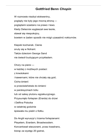 Gottfried Benn Chopin W rozmowie niezbyt elokwentny, poglądy nie były jego mocną stroną — poglądami szastano na prawo i lewo. Kiedy Delacroix wygłaszał swe teorie, stawał się niespokojny, bowiem w żaden sposób nie mógł uzasadnić nokturnów. Kiepski kochanek. Cienie snuły się w Nohant. Także dzieciom George Sand nie świecił budującym przykładem. Chory na piersi — w każdej z możliwych postaci: z krwotokami i kawernami, które nie chciały się goić. Cicha śmierć w przeciwieństwie do śmierci w paroksyzmach bólu lub od salwy plutonu egzekucyjnego. Przysunięto fortepian (Erarda) do drzwi i Delfina Potocka w ostatniej godzinie śpiewała mu pieśń o fiołku. Do Anglii wyruszył z trzema fortepianami: Pleyelem, Erardem, Broadwoodem. Koncertował wieczorami, przez kwadrans, biorąc za występ 20 gwinei, u Rotschildów, Wellingtonów, w Strafford House i u rozlicznych rycerzy podwiązki. Omroczony zmęczeniem i bliskością śmierci wrócił do domu na Square d'Orlean. Tam spalił wszystkie szkice, manuskrypty. Tylko żadnych brulionów, fragmentów, notatek, żadnych zdradzieckich śladów. Na koniec rzekł: „Usiłowania moje zgodne są z poziomem, jaki zdołałem osiągnąć.” Grać winien każdy palec z siłą odpowiednią do jego budowy. Czwarty jest najsłabszy (to tylko syjamski brat palca średniego). Kiedy miał grać, palce kładł na e, fis, gis, h, c. Kto kiedykolwiek usłyszał któreś z jego preludiów, czy to w dworku na wsi, czy w górach, czy przez drzwi otwarte tarasu w jakimś sanatorium, z trudem mógł je zapomnieć. Nie skomponował żadnej opery, żadnej symfonii, tylko te tragiczne progresje, poczęte z artystycznego przekonania i grane małą ręką. Janusz SZPOTAŃSKI