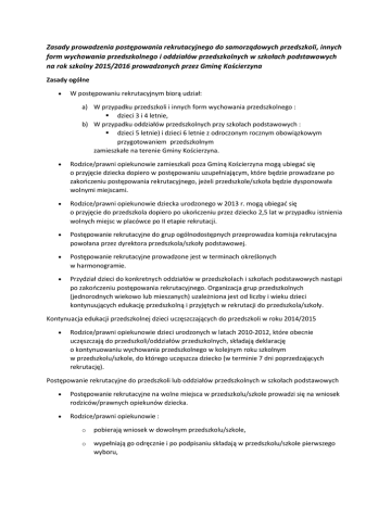 Zasady prowadzenia postępowania rekrutacyjnego do samorządowych przedszkoli, innych form wychowania przedszkolnego i oddziałów przedszkolnych w szkołach podstawowych na rok szkolny 2015/2016 prowadzonych przez Gminę Kościerzyna Zasady ogólne W postępowaniu rekrutacyjnym biorą udział: a) W przypadku przedszkoli i innych form wychowania przedszkolnego : dzieci 3 i 4 letnie, b) W przypadku oddziałów przedszkolnych przy szkołach podstawowych : dzieci 5 letnie) i dzieci 6 letnie z odroczonym rocznym obowiązkowym przygotowaniem przedszkolnym zamieszkałe na terenie Gminy Kościerzyna. Rodzice/prawni opiekunowie zamieszkali poza Gminą Kościerzyna mogą ubiegać się o przyjęcie dziecka dopiero w postępowaniu uzupełniającym, które będzie prowadzane po zakończeniu postępowania rekrutacyjnego, jeżeli przedszkole/szkoła będzie dysponowała wolnymi miejscami. Rodzice/prawni opiekunowie dziecka urodzonego w 2013 r. mogą ubiegać się o przyjęcie do przedszkola dopiero po ukończeniu przez dziecko 2,5 lat w przypadku istnienia wolnych miejsc w placówce po II etapie rekrutacji. Postępowanie rekrutacyjne do grup ogólnodostępnych przeprowadza komisja rekrutacyjna powołana przez dyrektora przedszkola/szkoły podstawowej. Postępowanie rekrutacyjne prowadzone jest w terminach określonych w harmonogramie. Przydział dzieci do konkretnych oddziałów w przedszkolach i szkołach podstawowych nastąpi po zakończeniu postępowania rekrutacyjnego. Organizacja grup przedszkolnych (jednorodnych wiekowo lub mieszanych) uzależniona jest od liczby i wieku dzieci kontynuujących edukację przedszkolną i przyjętych w rekrutacji do przedszkola/szkoły. Kontynuacja edukacji przedszkolnej dzieci uczęszczających do przedszkoli w roku 2014/2015 Rodzice/prawni opiekunowie dzieci urodzonych w latach 2010-2012, które obecnie uczęszczają do przedszkoli/oddziałów przedszkolnych, składają deklarację o kontynuowaniu wychowania przedszkolnego w kolejnym roku szkolnym w przedszkolu/szkole, do którego uczęszcza dziecko (w terminie 7 dni poprzedzających rekrutację). Postępowanie rekrutacyjne do przedszkoli lub oddziałów przedszkolnych w szkołach podstawowych Postępowanie rekrutacyjne na wolne miejsca w przedszkolu/szkole prowadzi się na wniosek rodziców/prawnych opiekunów dziecka. Rodzice/prawni opiekunowie : o pobierają wniosek w dowolnym przedszkolu/szkole, o wypełniają go odręcznie i po podpisaniu składają w przedszkolu/szkole pierwszego wyboru, Do wniosku rodzice/prawni opiekunowie dołączają dokumenty/oświadczenia potwierdzające spełnianie kryteriów. Oświadczenia składa się pod rygorem odpowiedzialności karnej za składanie fałszywych zeznań. Składający oświadczenie jest obowiązany do zawarcia w nim klauzuli następującej treści: „Jestem świadomy odpowiedzialności karnej za złożenie fałszywego oświadczenia” (art. 20t ust 6 ustawy o systemie oświaty) . Wypełniony wniosek: o podpisuje przynajmniej jeden z rodziców/prawnych opiekunów dziecka, o podpisy złożone we wniosku są potwierdzeniem zgodności informacji zawartych we wniosku ze stanem faktycznym, o za wydanie rodzicom potwierdzenia przyjęcia wniosku odpowiedzialny jest dyrektor przedszkola/szkoły. Wniosek rozpatruje komisja rekrutacyjna w przedszkolu/szkole Przewodniczący komisji rekrutacyjnej w uzgodnieniu z dyrektorem przedszkola/szkoły może: o żądać od rodziców/prawnych opiekunów przedstawienia dokumentów potwierdzających okoliczności zawarte w oświadczeniach (przewodniczący wyznacza termin przedstawienia dokumentów), o zwrócić się do Wójta/burmistrza gminy, właściwej ze względu na miejsce zamieszkania dziecka, o potwierdzenie okoliczności zawartych w oświadczeniach. Wójt/burmistrz gminy w celu potwierdzenia okoliczności zawartych w oświadczeniach: o korzysta z informacji, do których ma dostęp z urzędu, o może wystąpić do instytucji publicznych o udzielenie informacji, o może zlecić pracownikom GOPS przeprowadzenie wywiadu, aby zweryfikować oświadczenie o samotnym wychowywaniu dziecka, O wynikach weryfikacji oświadczeń wójt/burmistrz informuje przewodniczącego komisji rekrutacyjnej w ciągu 14 dni od dnia otrzymania pisma. W przypadku braku potwierdzenia okoliczności zawartych w oświadczeniu, komisja rekrutacyjna, rozpatrując wniosek, nie uwzględnia kryterium, które nie zostało potwierdzone. Na podstawie spełnianych przez kandydata kryteriów kwalifikacyjnych komisja rekrutacyjna ustala kolejność przyjęć. W przypadku większej liczby kandydatów niż liczba wolnych miejsc na pierwszym etapie postępowania rekrutacyjnego brane są pod uwagę łącznie kryteria określone w ustawie o systemie oświaty tzw. kryteria ustawowe. L.p. Nazwa kryterium Liczba punktów 1. Wielodzietność rodziny kandydata 1 2. Niepełnosprawność kandydata 1 3. Niepełnosprawność jednego z rodziców kandydata 1 4. Niepełnosprawność obojga rodziców kandydata 1 5. Niepełnosprawność rodzeństwa kandydata 1 6. Samotne wychowywanie kandydata w rodzinie 1 7. Objęcie kandydata pieczą zastępczą 1 Komisja rekrutacyjna bierze pod uwagę sumę punktów uzyskanych przez kandydata W przypadku równorzędnych wyników uzyskanych na pierwszym etapie postępowania rekrutacyjnego lub jeżeli po jego zakończeniu przedszkole nadal dysponuje wolnymi miejscami, na drugim etapie brane są pod uwagę kryteria ustalone przez dyrektora przedszkola/szkoły w porozumieniu z Wójtem Gminy Kościerzyna tzw. kryteria lokalne. Kryteria lokalne : Nazwa kryterium L.p. Liczba punktów 1. Dziecko, którego oboje rodzice (prawni opiekunowie) pracują, wykonują pracę na podstawie umowy cywilnoprawnej, uczą się w trybie dziennym, prowadzą gospodarstwo rolne lub pozarolniczą działalność gospodarczą. 10 2. Uczęszczanie rodzeństwa kandydata do danego przedszkola lub innej formy wychowania przedszkolnego 15 Dojazd rodziców kandydata do pracy w danej miejscowo