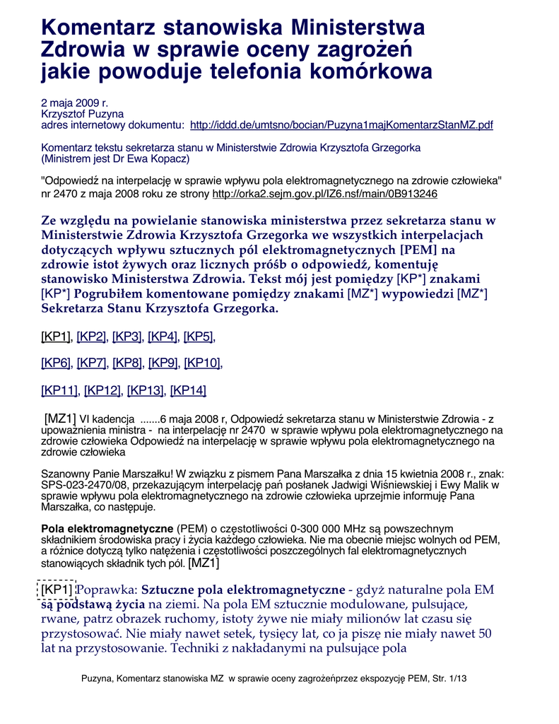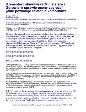 Komentarz stanowiska Ministerstwa Zdrowia w sprawie oceny zagrożeń jakie powoduje telefonia komórkowa 2 maja 2009 r. Krzysztof Puzyna adres internetowy dokumentu: http://iddd.de/umtsno/bocian/Puzyna1majKomentarzStanMZ.pdf Komentarz tekstu sekretarza stanu w Ministerstwie Zdrowia Krzysztofa Grzegorka (Ministrem jest Dr Ewa Kopacz) "Odpowiedź na interpelację w sprawie wpływu pola elektromagnetycznego na zdrowie człowieka" nr 2470 z maja 2008 roku ze strony http://orka2.sejm.gov.pl/IZ6.nsf/main/0B913246 Ze względu na powielanie stanowiska ministerstwa przez sekretarza stanu w Ministerstwie Zdrowia Krzysztofa Grzegorka we wszystkich interpelacjach dotyczących wpływu sztucznych pól elektromagnetycznych [PEM] na zdrowie istot żywych oraz licznych próśb o odpowiedź, komentuję stanowisko Ministerstwa Zdrowia. Tekst mój jest pomiędzy [KP*] znakami [KP*] Pogrubiłem komentowane pomiędzy znakami [MZ*] wypowiedzi [MZ*] Sekretarza Stanu Krzysztofa Grzegorka. [KP1], [KP2], [KP3], [KP4], [KP5], [KP6], [KP7], [KP8], [KP9], [KP10], [KP11], [KP12], [KP13], [KP14] [MZ1] VI kadencja .......6 maja 2008 r, Odpowiedź sekretarza stanu w Ministerstwie Zdrowia - z upoważnienia ministra - na interpelację nr 2470 w sprawie wpływu pola elektromagnetycznego na zdrowie człowieka Odpowiedź na interpelację w sprawie wpływu pola elektromagnetycznego na zdrowie człowieka >> Szanowny Panie Marszałku! W związku z pismem Pana Marszałka z dnia 15 kwietnia 2008 r., znak: SPS-023-2470/08, przekazującym interpelację pań posłanek Jadwigi Wiśniewskiej i Ewy Malik w sprawie wpływu pola elektromagnetycznego na zdrowie człowieka uprzejmie informuję Pana Marszałka, co następuje. >> Pola elektromagnetyczne (PEM) o częstotliwości 0-300 000 MHz są powszechnym składnikiem środowiska pracy i życia każdego człowieka. Nie ma obecnie miejsc wolnych od PEM, a różnice dotyczą tylko natężenia i częstotliwości poszczególnych fal elektromagnetycznych stanowiących składnik tych pól. [MZ1] > > [KP1] Poprawka: Sztuczne pola elektromagnetyczne - gdyż naturalne pola EM są podstawą życia na ziemi. Na pola EM sztucznie modulowane, pulsujące, rwane, patrz obrazek ruchomy, istoty żywe nie miały milionów lat czasu się przystosować. Nie miały nawet setek, tysięcy lat, co ja piszę nie miały nawet 50 lat na przystosowanie. Techniki z nakładanymi na pulsujące pola Puzyna, Komentarz stanowiska MZ w sprawie oceny zagrożeńprzez ekspozycję PEM, Str. 1/13 częstotliwościami żywych tkanek np 8.3 Hz są wprowadzane masowo dopiero po roku 2000, okresu wprowadzenia roamingu i bezprzewodowych technologii GSM, UMTS, HSDPA, DVB-t, telefonów systemu DECT, WiMax czy WiFi oraz Bluetooth. http://iddd.de/umtsno/vater/pulsung.gif [KP1] [MZ2] PEM niosą w sobie specjalny rodzaj energii (energia elektromagnetyczna), która wnika w głąb obiektów biologicznych, w tym także ciała ludzkiego i może prowadzić w określonych warunkach do oddziaływań szkodliwych.[MZ2] [KP2] Poprawka: energia elektromagnetyczna po części jest odbijana od ciała ludzkiego, po części pochłaniana, po części przenika przez organizm ludzki, po części może wejść w rezonans z biopolami żywych narządów, komórek i tkanek! W zależności od częstotliwości modulacji np. 8,3 Hz część absorbowanej energii powoduje rezonans elektromagnetyczny z odpowiednim obszarem w żywym organizmie. Zakłócenia procesów biologicznych, są udowodnione, naturalnie tylko w żywych organizmach, gdyż tylko żywe organizmy dysponują biopolami i bioenergią na bazie bardzo słabych pól elektromagnetycznych. Obliczenia i zalecenia klubu ICNIRP dotyczą martwej materii biologicznej np zwłok ludzkich. Dlatego efekty od bardzo słabych pól EM tzw. nietermiczne i biorezonans występują tylko w żywych organizmach i roślinach. Do oddziaływań szkodliwych słabych i silnych pól EM dochodzi tylko w organizmach żywych. ICNIRP konsekwentnie powyrzucała ludzi z klubu, którzy przedstawiali badania na temat efektów nietermicznych. Dr Cherry: " ICNIRP robi własną grę z własnymi regułami. Pierwsza reguła gry to: jedynym szkodliwym efektem od promieniowania mikrofalowego jest przegrzanie tkanek inne efekty nie są realne. Następstwem tej reguły w grze ICNIRP jest: nie ma innych Puzyna, Komentarz stanowiska MZ w sprawie oceny zagrożeńprzez ekspozycję PEM, Str. 2/13 szkodliwych oddziaływań. Dlatego inne oddziaływania, czy wyniki badań epidemiologicznych pokazujące efekty nietermiczne muszą być błędne i powinny zostać poprawione. Kto złamie tą regułę gry ten przegrał i musi ICNIRP opuścić. Prof. Hyland: "właściwa wiedza jest z premedytacją wykluczana, gdyż pewne Grupy nie potrafią sobie wyobrazić innego modelu oddziaływania. To Ci co porównują procesy nieliniowe z procesami liniowymi- ale ludzkie ciało reaguje nieliniowo. To jest jak powiedział Neil Cherry wbrew ludzkiemu rozsądkowi. Nowe postępy w biofizyce nie są rozumiane lub ignorowane. Jeśli jesteśmy żywi mamy dużo energii, która wzmacnia słabe sygnały elektromagnetyczne. Tylko efekt termiczny funkcjonuje zawsze - obojętnie czy na żywym czy martwym obiekcie. Ale tylko żywe obiekty są podatne na oddziaływania nietermiczne! Inż. Puzyna: na wyżej opisanej zasadzie funkcjonuje wzmocnienie zasięgu EDGE, które stosuje w Polsce m.in. PTC Era (Deutsche Telekom) Następuje rezonans elektromagnetyczny przy częstotliwość pracy serca 8 Hz. Każdy człowiek z komórką w ręku staje się nadajnikiem i anteną ! http://iddd.de/umtsno/noplakatkl.gif [KP2] [MZ3] Wraz z gwałtownym wzrostem liczby urządzeń emitujących PEM narasta w społeczeństwie obawa przed ewentualnymi negatywnymi skutkami zdrowotnymi ekspozycji powodowanymi przez te urządzenia. Dotyczy to zwłaszcza dużych i rozbudowanych przestrzennie instalacji, takich jak stacje bazowe telefonii komórkowej czy linie elektroenergetyczne wysokich napięć. >> Natężenie PEM