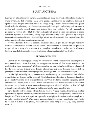 PRZEKAZ 53 BUNT LUCYFERA Lucyfer był utalentowanym Synem Lanonandekiem klasy pierwszej z Nebadonu. Służył w wielu systemach, był wysokim radcą swej grupy, wyróżnianym za mądrość, bystrość i operatywność. Lucyfer otrzymał numer 37 swojej klasy, a kiedy został nominowany przez Melchizedeków, określony był jako jeden ze stu najzdolniejszych i najbardziej utalentowanych osobowości, spośród ponad siedmiuset tysięcy istot jego rodzaju. Od tak wspaniałych początków, poprzez zło i błąd, Lucyfer zaakceptował grzech i teraz jest jednym z trzech Władców Systemu w Nebadonie, którzy ulegli wezwaniu swej jaźni i poddali się sofistyce fałszywej wolności osobistej – nie chcieli być wierni wszechświatowi i zlekceważyli braterskie zobowiązania, oślepli na kosmiczne zależności. We wszechświecie Nebadon, domenie Chrystusa Michała, jest dziesięć tysięcy systemów światów zamieszkałych. W całej historii Synów Lanonandeków, w okresie całej ich pracy we wszystkich tych tysiącach systemów i w zarządzie wszechświata, tylko trzech Władców Systemu kiedykolwiek zostało uznanych winnymi lekceważenia rządu Syna Stwórcy. 1. PRZYWÓDCY BUNTU Lucyfer nie był wznoszącą się istotą; był stworzonym Synem wszechświata lokalnego i to o nim powiedziano: „Byłeś doskonały w postępowaniu swoim od dni twego stworzenia, aż znalazła się w tobie nieprawość”. Wiele razy naradzał się on z Najwyższymi Ojcami z Edentii. I Lucyfer panował „na świętej górze Bożej”, administracyjnej górze Jerusem, jako że był on głównym administratorem wielkiego systemu, złożonego z 607 światów zamieszkałych. Lucyfer był wspaniałą istotą, utalentowaną osobowością; w bezpośredniej linii władzy wszechświatowej drugim po Najwyższych Ojcach konstelacji. Pomimo wykroczenia Lucyfera, podporządkowane mu istoty inteligentne nie okazywały mu braku szacunku i pogardy, przed obdarzeniem Urantii przez Michała. Nawet archanioł Michała, w czasach zmartwychwstania Mojżesza, „nie podniósł przeciw niemu oskarżającego sądu, ale rzekł, «Sędzia cię skarcił»”. Sąd w takich sprawach należy do Pradawnych Czasu, władców superwszechświata. Teraz Lucyfer jest upadłym i odsuniętym od rządów Władcą Satanii. Rozmyślania o sobie są wyjątkowo zgubne, nawet dla podniosłych osobowości niebiańskiego świata. Powiedziano o Lucyferze: „Twoje serce było wyniosłe z powodu twojej piękności; zniweczyłeś swą mądrość z powodu swojej świetności”. Wasz dawny prorok oglądał jego smutny stan, kiedy pisał: „Jakże ty spadłeś z niebios, o Lucyferze, synu jutrzenki! Jakże runąłeś w dół, ty, który peszyłeś światy”! Na Urantii niewiele słyszano o Lucyferze z tego powodu, że wyznaczył on swego pierwszego namiestnika, Szatana, do głoszenia jego idei na waszej planecie. Szatan był członkiem tej samej, pierwszej klasy Lanonandeków, ale nigdy nie działał jako Władca Systemu; związał się on całkowicie z powstaniem Lucyfera. „Diabeł” to nikt inny jak Caligastia, zdetronizowany Książę Planetarny Urantii, Syn z drugiej klasy Lanonandeków. Kiedy Michał przebywał w ciele na Urantii, Lucyfer, Szatan i Caligastia sprzymierzyli się, aby doprowadzić do upadku jego misję obdarzającą. Jednak mocno się zawiedli. Abaddon był szefem personelu Caligastii. Przyłączył się do buntu wraz ze swym zwierzchnikiem i od tego czasu działał jako główny administrator buntowników na Urantii. Belzebub był przywódcą nielojalnych istot pośrednich, które sprzymierzyły się z siłami zdradzieckiego Caligastii. W końcu smok stał się symbolicznym reprezentantem wszystkich tych złych postaci. Po tryumfie Michała „Gabriel zstąpił z Salvingtonu i związał smoka (wszystkich przywódców buntu) na epokę”. Napisane jest o seraficznych buntownikach z Jerusem: „I aniołów, którzy nie zachowali swojej godności, ale opuścili własne mieszkania, spętanych wiekuistymi więzami zatrzymał w ciemnościach na sąd wielkiego dnia”. 2. PRZYCZYNY BUNTU Lucyfer i jego pierwszy asystent, Szatan, panowali na Jerusem przez ponad pięćset tysięcy lat, kiedy to zaczęli w swych sercach sprzeciwiać się Ojcu Uniwersalnemu i Synowi Michałowi, który wtedy był namiestnikiem Ojca. Nie istniały szczególne czy specjalne warunki w systemie Satania, które mogły sugerować czy faworyzować bunt. Uważamy, że idea ta powstała i ukształtowała się w umyśle Lucyfera i że mógł on wywołać taki bunt bez względu na to, gdzie przebywał. Lucyfer po raz pierwszy obwieścił swe plany Szatanowi, ale trzeba było wielu miesięcy, aby zdeprawować umysł tego zdolnego i utalentowanego asystenta. Tym niemniej, gdy Szatan raz się przekonał do buntowniczych teorii, stał się odważnym i gorliwym poplecznikiem „samostanowienia i wolności”. Nikt nigdy nie proponował buntu Lucyferowi. Idea samostanowienia, w opozycji do woli Michała i do planów Ojca Uniwersalnego, tak jak je Michał reprezentował, powstała w umyśle Lucyfera. Jego związki z Synem Stwórcy były bliskie i zawsze serdeczne. Przed egzaltacją swego własnego umysłu, Lucyfer nigdy otwarcie nie wyrażał swego niezadowolenia z administracji wszechświata. Pomimo jego milczenia, Jednoczący Czasu z Salvingtonu, przez ponad sto lat standardowego czasu odzwierciedlał do Uversy, że jest pewien niepokój w umyśle Lucyfera. Informacja ta przekazana została również Synowi Stwórcy i Ojcom Konstelacji Norlatiadeku. Przez cały ten czas Lucyfer przejawiał coraz większy krytycyzm wobec całego systemu administracji wszechświatowej, jednak zawsze szczerze wyznawał swą lojalność wobec Najwyższych Władców. Jego pierwsza otwarta nielojalność miała miejsce podczas odwiedzin Gabriela na Jerusem, kilka dni przed otwartą proklamacją Lucyferowej Deklaracji Wolności. Oczywistość wybuchu buntu wywarła na Gabrielu tak wielkie wrażenie, że