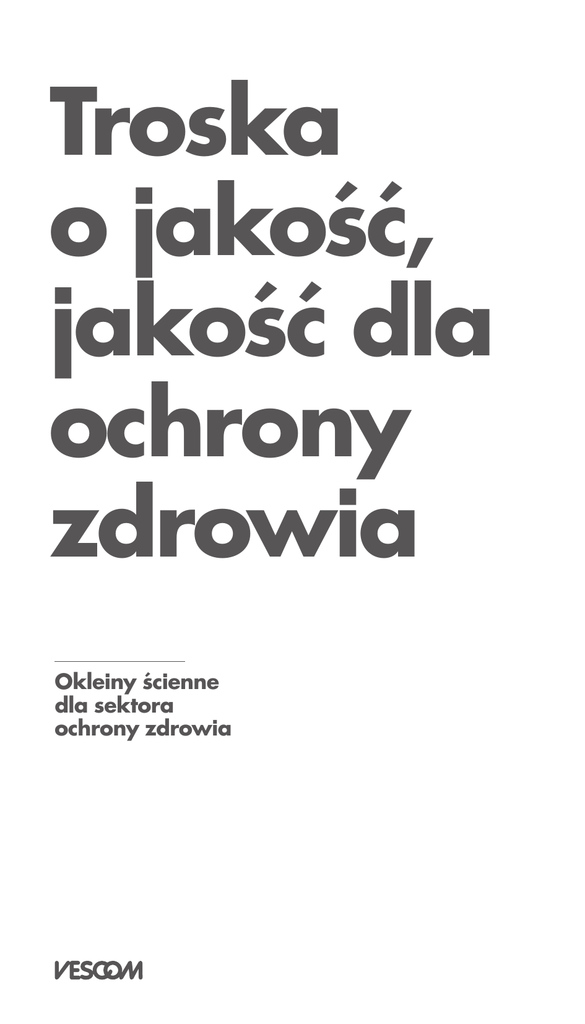 Troska o akość, jakość dla ochrony zdrowia Okleiny ścienne dla sektora ochrony zdrowia Dlatego Vescom 03 1. 2. 3. 4. 5. Higiena i bezpieczeństwo Trwałość i zgodność z zasadami zrównoważonego rozwoju Atmosfera Budżet Środowisko 04 05 Szpitale i placówki ochrony zdrowia stawiają produktom wnętrzarskim surowe wymagania - nie tylko pod względem bezpieczeństwa i higieny, lecz również w zakresie trwałości, zgodności z zasadami zrównoważonego rozwoju oraz przystępności cenowej. Ponadto za istotny czynnik uważane jest również stwarzanie przytulnej, domowej atmosfery dla pacjentów, lecz także i dla pracowników tych placówek i osób, które je odwiedzają. Okleiny ścienne Vescom już od wielu lat cieszą się międzynarodowym uznaniem w sektorze opieki zdrowotnej, jako wykończenie ścian stanowiące zdecydowanie najlepszy wybór. Z własnego doświadczenia i z reakcji otrzymywanych od klientów wiemy, że w placówkach ochrony zdrowia ważną rolę odgrywa pięć następujących kwestii: higiena i bezpieczeństwo, trwałość i zgodność z zasadami zrównoważonego rozwoju, atmosfera, budżet oraz środowisko. Kwestie te i wynikające z nich wymagania przyjęliśmy za punkt wyjścia przy opracowywaniu i produkcji naszych oklein ściennych. Kolekcja Vescom obejmuje zatem funkcjonalne rozwiązania łączące w sobie w unikalny sposób walory techniczne, gospodarczoekonomiczne i estetyczne. 06 07 01 Higiena i bezpieczeństwo Najważniejszy priorytet Winylowe okleiny ścienne Vescom wykonane są z winylowej warstwy wierzchniej na bawełnianym lub wiskozowo-poliestrowym nośniku. Warstwę wierzchnią zadrukowuje się przy użyciu farb na bazie wody. Wszystkie produkty winylowe przeznaczone do stosowania w pomieszczeniach które muszą spełniać surowe wymagania higieniczne zawierają standardowo dodatek Bio-Pruf. Ponadto dostępne są okleiny ścienne z powłoką Tedlar, zapewniającą dodatkową ochronę przed powstawaniem plam i działaniem chemikaliów. Higiena stanowi główny priorytet dla szpitali i placówek opieki zdrowotnej. Jak powszechnie wiadomo, bakterie mogą powodować rozprzestrzenianie się infekcji wśród pacjentów. Może mieć to niebezpieczne skutki. Pomieszczenia placówek ochrony zdrowia powinny właśnie zapewniać ochronę i być odporne na takie zagrożenia, jak bakterie. Kierując się tą przesłanką, firma Vescom opracowała kolekcję winylowych oklein ściennych, specjalnie przeznaczonych dla sektora ochrony zdrowia. 08 09 Bio-Pruf: jeszcze większa odporność na bakterie i grzyby Vescom z dodatkiem Bio-Pruf: doskonałe wyniki testów Escherichia coli (E. coli) Bio-Pruf zapewnia jeszcze większe bezpieczeństwo stosowania winylowych oklein ściennych w pomieszczeniach placówek ochrony zdrowia. Bio-Pruf wstrzymuje rozwój mikroorganizmów, zapobiega rozwojowi bakterii, grzybów i pleśni, które mogą powstawać pod wypływem wilgoci. Bio-Pruf nie jest metodą wykończenia powierzchni, lecz stanowi integralną część procesu produkcji. W czasie tego procesu Bio-Pruf dodawany jest do winylowej okleiny ściennej. Bio-Pruf jest zastrzeżoną marką Rohm & Haas. W celu umożliwienia używania tego znaku towarowego, winylowe okleiny ścienne Vescom zostały dokładnie przetestowane przez niezależny instytut badawczy. Rezultaty tych testów były doskonałe, dzięki czemu Vescom może używać logo Bio-Pruf. Zwięzłe zestawienie wyników przeprowadzonych testów przedstawiono na następnej stronie. Staphylococcus aureus 4.00 4.00 4.00 4.00 3.00 3.00 3.00 3.00 2.00 2.00 2.00 2.00 1.00 1.00 1.00 1.00 0.00 0.00 0.00 0.00 0hr 0hr 24hr 24hr Methicillin-resisant Staphylococcus aureus (MRSA) 0hr 0hr 24hr 4.00 3.00 4.00 4.00 3.00 3.00 2.00 2.00 1.00 1.00 0.00 0.00 2.00 1.00 0.00 24hr 0hr 10 24hr Logarytmiczna redukcja określona w drodze zliczenia mikrobiologicznego, według normy ISO 22196. Większa 0hr ilość jest lepsza. 24hr Vescom + Bio-Pruf Bez poddania obróbce 0hr 24hr Źródło: TNO 11 Tedlar: zwiększona odporność na działanie chemikaliów Bezpieczeństwo przede wszystkim Bezpieczeństwo i higienę zapewnia się poprzez ochronę przed wpływami z zewnątrz. Winyl również ma taką ochronę: Tedlar. Ta niewidoczna warstwa (powłoka PVF) zwiększa odporność na żrące działanie chemikaliów i rozpuszczalników oraz oferuje dodatkową ochronę przed zabrudzeniami, bakteriami i przebarwieniami powodowanymi przez światło i powietrze. Okleiny ścienne zaopatrzone w powłokę z tworzywa Tedlar szczególnie nadają się do stosowania w pomieszczeniach narażonych na silne oddziaływanie czynników zewnętrznych, na przykład w salach operacyjnych, salach szpitalnych, na oddziałach OIOM, w laboratoriach i w kuchniach placówek ochrony zdrowia. Czyszczenie winylowych oklein ściennych z powłoką Tedlar jest bardzo proste Placówki opieki zdrowotnej powinny spełniać najsurowsze wymogi w zakresie bezpieczeństwa przeciwpożarowego. Vescom w znaczący sposób przyczynia się do jego zapewnienia. Vescom posiada prawo opatrywania winylowych oklein ściennych znakiem CE, co oznacza, że nasz produkt spełnia między innymi wymagania europejskich nom bezpieczeństwa pożarowego. Aby utrzymać ten poziom, regularnie przeprowadzamy testy produktów. Zachowanie oklein ściennych Vescom w warunkach pożaru badane jest z zastosowaniem testu SBI (EN 13823). W klasyfikacji ogniowej według EN 1350-1-1 większość gatunków należy do klasy B – s1 – d0, zaś pozostałe gatunki do klasy B – s2 – d0 Produkty Vescom zaopatrzone w powłokę Tedlar oferują całą gamę zalet. Tak na przykład Tedlar zapewnia całkowitą odporność oklein z winylu na plamy i zabrudzenia. W prosty i skuteczny sposób można usuwać z nich nawet substancje, które normalnie pozostawiają uporczywe plamy, takie jak jod i azotan srebra. Niektóre nawet kilka miesięcy po powstaniu zabrudzeń. Ponadto okleiny ścienne z powłoką Tedlar są łatwe do czyszcz