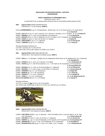 WROCŁAWSKI TOR WYŚCIGÓW KONNYCH - PARTYNICE SPRAWOZDANIE DZIEŃ 15 (NIEDZIELA) 27 PAŹDZIERNIKA 2013 r. Pochmurno; temp. + 18 oC, tor płaski lekki (2,3); tor płotowy lekko elastyczny (2,6); tor przeszkodowy lekko elastyczny (2,8) W98 Nagroda 5250 zł (3000-1200-600-300-150) Gonitwa dla 3 l. i st. koni IV grupy. (2000 m) 1 (W-wa) BOMBONIERKA kl. gn. 6 l. (Tempelwächter - Be My), hod. i wł. A. i M. Suchorzewscy, tr A. Suchorzewski dż. A. Stasiak 59 2 (W90) ELLA (AUT) kl. gn. 5 l., hod. H. Schmutz, wł. H. Schmutz i E. Porębna, tr inż. E. Porębna pr. dż. E. Porębna 59 3 (W91) NERONA kl. gn. 5 l., hod. i wł. SK Golejewko, tr M. Borkowski k. dż. N. Hendzel 58 4 (W91) MALLORY kl. gn. 3 l., hod. A. Żyłkowska, wł. Z.P.U.H. Magra, tr inż. E. Porębna k. dż. K. Barboriková 55 5 (W69) OCZAR wał. kaszt. 4 l., hod. i wł. SK Iwno, tr R. Świątek u. A. Kaleta 56 6 (W90) SPEED DANCE kl. gn. 3 l., tr T. Dębowski dż. R. G.-Panczew 58 7 (W85) TURKMEN wał. gn. 6 l., tr F. Wołoszyn k. dż. P. Gluza 59 Wycofana dodatkowo Polonia (zw.) czas 2’05”; wysyłany; dł. ½-11-5¼-7-9¼-4¾ zwc. 4,90 zł; dwj. 12,10 zł; pdk. 10,80 zł; trj. 20,80 zł; czw. 22,30 zł W99 Nagroda 8750 zł (5000-2000-1000-500-250) Gonitwa dla 3 l. koni czystej krwi arabskiej I grupy. (2000 m) 1 (W87) OLEK og. s. 3 l. (Ostragon – Owidja), hod. M. Gołębiowska GR Surchów, wł. M. Gołębiowska tr inż. S. Borkowski dż. B. Zawadzka 58 2 (W87) EVIFEDA kl. gn. 3 l., hod. i wł. P. Borecki, tr R. Świątek k. dż. K. Barboriková 56 3 (W81) CEILAN og. gn. 3 l., hod. SK Kurozwęki Sp. z o.o. - J. M. Popiel, wł. W. Kryszyłowicz, tr M. Kryszyłowicz dż. M. Kryszyłowicz 58 4 (W81) PELLENA kl. gn. 3 l., hod. i wł. SK Janów Podlaski, tr T. Dębowski dż. R. G.-Panczew 58 5 (W81) ORLANDI kl. s. 3 l., hod. R. Szpar, wł. LKS KTWK, tr S. Borkowski dż. J. Fornal-Laskosz 58 6 (W87) FOGGORIA kl. gn. 3 l., tr W. Kryszyłowicz u. R. Kułaga 56½ 7 (W87) EBERIUSZ og. s. 3 l., tr W. Kryszyłowicz k. dż. P. Gluza 58 8 (W66) PASKALA kl. s. 3 l., tr inż. S. Borkowski k. dż. N. Hendzel 58 9 (W81) CYRKA kl. s. 3 l., tr inż. S. Borkowski am. dż. M. Mioduszewska 56 10 (W81) GH ANJESSA (DE) kl. k. 3 l., tr R. Świątek dż. A. Stasiak 57 Wycofana GH Briana czas 2’22”; w walce; dł. łeb-2½-4¼-3-2-3¾-12-3¾-daleko zwc. 10,50 zł; dwj. 33,00 zł; pdk. 27,40 zł; trj. 37,30 zł; czw. 169,70 zł; pia. nie trafiona W100 Nagroda 5250 zł (3000-1200-600-300-150) Gonitwa dla 3 l. koni wyłącznie IV grupy. (1600 m) 1 (W84) FOXY KNOXY (DEN) kl. c. gn. 3 l. (Deceptor - I Don't Do Walkin), hod. A. Lund i M. Robertz, wł. M. Trela, tr W. Kryszyłowicz dż. J. Fornal-Laskosz 58 2 (W91) STAR DOLL kl. kaszt. 3 l., hod. i wł. SK Iwno, tr T. Dębowski dż. R. G.-Panczew 58 3 (W91) HISZPAN og. c. gn. 3 l., hod. SK Golejewko, wł. M. Sopański, tr W. Kryszyłowicz dż. M. Kryszyłowicz 59 4 (W84) KORNWALIA kl. sk. gn. 3 l., hod. i wł. SK Golejewko, tr inż. S. Borkowski dż. B. Zawadzka 57 5 (W85) MEADOW DEW (GER) og. gn. 3 l., hod. i wł. P. Huber, tr inż. E. Porębna k. dż. K. Barboriková 59 1 6 (W32) URA URA kl. sk. gn. 3 l., tr R. Świątek 7 (W85) CHANCO og. s. 3 l., tr R. Świątek 8 (-) MELOMAN og. kaszt. 3 l., tr F. Wołoszyn k. dż. N. Hendzel 58 dż. A. Stasiak 59 k. dż. P. Gluza 58 czas 1’40”; wysyłany; dł. 1¼-3½-1¾-3-3½-daleko-daleko zwc. 18,60 zł; dwj. 64,50 zł; pdk. 25,30 zł; trj. 499,50 zł; czw. 219,40 W101 CHYSZOWA Nagroda 10 500 zł (6000-2400-1200-600-300) Międzynarodowa gonitwa z płotami dla 4 l. i st. koni. Konie, które wygrały gonitwę przeszkodową lub płotową, niosą odpowiednio +1 i +2 kg nadwagi za każdą wygraną gonitwę. Konie, które nie zajęły płatnego miejsca w gonitwie przeszkodowej lub płotowej, korzystają z -1 kg ulgi wagi. Nie jest stosowana ulga wagi za kategorie jeździeckie. (3000 m) 1 (W88) IVO (GB) wał. kaszt. 4 l. (Generous – Idea), hod. M. Kaszubowski, wł. „MK” M. Kaszubowski i P. Wróblewski, tr P. Wróblewski k. dż. R. Benš 72 2 (W46) KREWETKA (GB) kl. sk. gn. 4 l., hod. M. Kaszubowski, wł. „MK” M. Kaszubowski, tr W. Kryszyłowicz st. u. A. Chopyk 66 3 (W88) INSTYTUCJA kl. c. gn. 4 l., hod. SK Moszna, wł. R. Kułaga, tr W. Kryszyłowicz u. R. Kułaga 66 4 (W-wa) SOPRAN LESTO (ITY) wał. c. gn. 4 l., hod. AZ AG S. Uberto In Cerecchia SRL, wł. A. Pastuszka, tr K. Rogowski u. T. Pastuszka 70 5 (W67) LUCKY MOMENT (GB) kl. gn. 6 l., hod. Northgate Lodge Stud Ltd, wł. M. Krzyśków i K. Brygier, tr M. Krzyśków u. K. Brygier 67 6 (W-wa) MY NECESSITY (IRE) og. gn. 4 l., tr K. Rogowski u. P. Pałczyński 67 Wycofana Kalpirinia czas 3’30”; silnie wysyłany; dł. 1½-2½-2¾-1-daleko zwc. 4,90 zł; dwj. 16,30 zł; trj. 32,80 zł; pdk. nie trafiony zł W102 Nagroda 7000 zł (4000-1600-800-400-200) Gonitwa dla 3 l. koni czystej krwi arabskiej II grupy. (1600 m) 1 (W99) GOTFRYD og. s. 3 l. (Pegasus – Gazira), hod. i wł. SK Michałów, tr T. Dębowski dż. R. G.-Panczew 58 2 (W79) MIA ROSA kl. gn. 3 l., hod. SK Michałów, wł. SK Michałów i A. Suchorzewski, tr A. Suchorzewski k. dż. P. Gluza 56 3 (W93) PIKTAWIA kl. kaszt. 3 l., hod. i wł. SK Janów Podlaski, tr W. Kryszyłowicz dż. M. Kryszyłowicz 56 4 (W93) PUSTYNNY LIS og. s. 3 l., hod. i wł. SK Michałów, tr R. Świątek k. dż. K. Barboriková 58 5 (W93) CHERONEA kl. gn. 3 l., hod. SK Michałów, wł. SK Michałów i A. Suchorzewski, tr A. Suchorzewski dż. A. Stasiak 57 6 (D-ka) ORLINI kl. gn. 3 l., tr S. Borkowski dż. J. Fornal-Laskosz 58 7 (W93) ELSANDRA kl. c. gn. 3 l., tr M. Borkowski k. dż. N. Hendzel 58 8 (W68) CZARUSIA kl. gn. 3 l., tr J. Pochwatka u. A. Grzegorek 56 9 (W68) EJRAGOLA kl. gn. 3 l., tr M. Borkowski u. R. Kułaga 56½ 10 (W93) ERMELO og. s. 3 l., tr inż. S. Borkowski am. dż. M. Mioduszewska 58 11 (W93) GREG og. sk. gn. 3 l., tr M. Borkowski am. u. S. Dorosz 58 12 (W93) FLORIANA kl. s. 3 l., tr R. Świątek u. A. Kaleta 56 13 (W93) EMSTER og. s. 3 l., tr T
