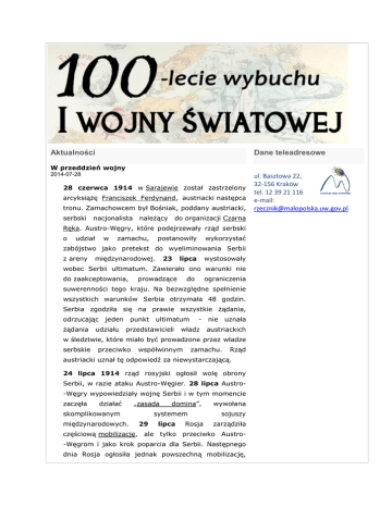 Aktualności Dane teleadresowe W przeddzień wojny 2014-07-28 28 czerwca 1914 w Sarajewie został zastrzelony arcyksiążę Franciszek Ferdynand, austriacki następca tronu. Zamachowcem był Bośniak, poddany austriacki, serbski nacjonalista należący do organizacji Czarna Ręka. Austro-Węgry, które podejrzewały rząd serbski o udział w zamachu, postanowiły wykorzystać zabójstwo jako pretekst do wyeliminowania Serbii z areny międzynarodowej. 23 lipca wystosowały wobec Serbii ultimatum. Zawierało ono warunki nie do zaakceptowania, prowadzące do ograniczenia suwerenności tego kraju. Na bezwzględne spełnienie wszystkich warunków Serbia otrzymała 48 godzin. Serbia zgodziła się na prawie wszystkie żądania, odrzucając jeden żądania udziału punkt ultimatum przedstawicieli - nie uznała władz austriackich w śledztwie, które miało być prowadzone przez władze serbskie przeciwko współwinnym zamachu. Rząd austriacki uznał tę odpowiedź za niewystarczającą. 24 lipca 1914 rząd rosyjski ogłosił wolę obrony Serbii, w razie ataku Austro-Węgier. 28 lipca Austro-Węgry wypowiedziały wojnę Serbii i w tym momencie zaczęła działać „zasada skomplikowanym międzynarodowych. domina”, systemem 29 lipca Rosja wywołana sojuszy zarządziła częściową mobilizację, ale tylko przeciwko Austro-Węgrom i jako krok poparcia dla Serbii. Następnego dnia Rosja ogłosiła jednak powszechną mobilizację, ul. Basztowa 22, 32-156 Kraków tel. 12 39 21 116 e-mail: [email protected] skierowaną także przeciwko sprzymierzonym z Austrią Niemcom. Niemcy 31 lipca zagroziły wypowiedzeniem wojny w wypadku, gdyby Rosja nie odwołała mobilizacji. Gdy Rosja nie udzieliła odpowiedzi na to ultimatum, 1 sierpnia Niemcy wypowiedziały jej wojnę. 1 sierpnia mobilizację ogłosiła także związana sojuszem z Rosją Francja.