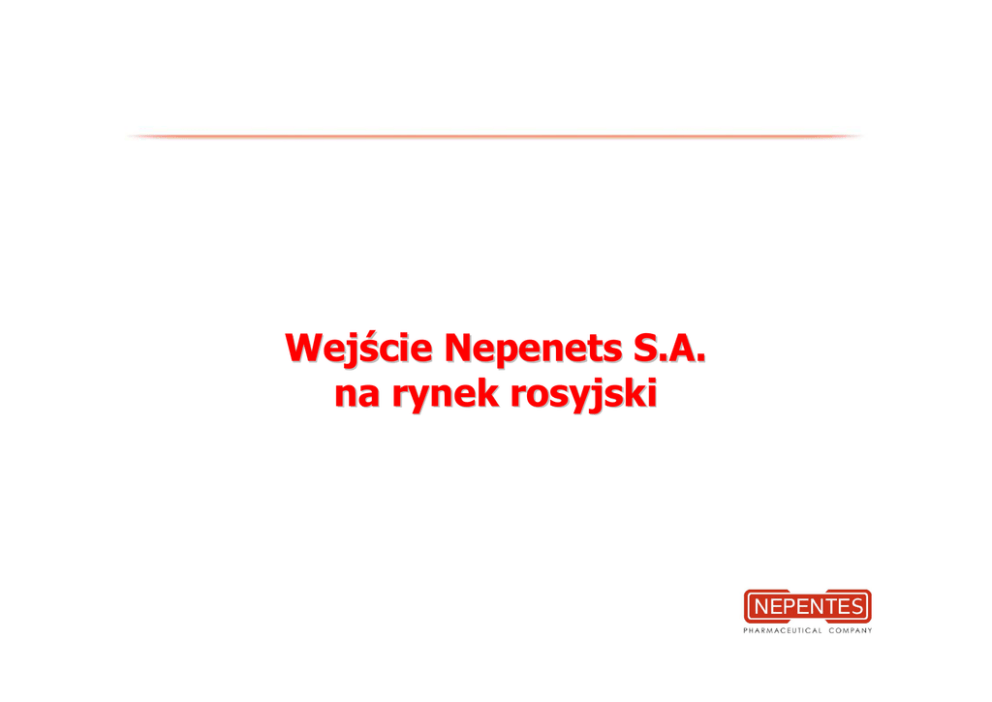 Wej cie Nepenets S.A. na rynek rosyjski Zastrze enia Niniejsze opracowanie zosta o sporz dzone wy cznie w celach informacyjnych. Nie stanowi reklamy ani oferowania papierów warto ciowych w publicznym obrocie. Zosta y w nim wykorzystane ród a informacji, które Nepentes S.A. uznaje za wiarygodne i dok adne, jednak nie ma gwarancji, e s one wyczerpuj ce i w pe ni odzwierciedlaj stan faktyczny. Opracowanie mo e zawiera stwierdzenia dotycz ce przysz ci, które stanowi ryzyko inwestycyjne lub ród o niepewno ci i mog istotnie ró ni si od faktycznych rezultatów. Nepentes S.A. nie ponosi odpowiedzialno ci za efekty decyzji, które zosta y podj te na podstawie niniejszego opracowania. Odpowiedzialno spoczywa wy cznie na korzystaj cym z opracowania. Opracowanie podlega ochronie wynikaj cej z ustawy o prawie autorskim i prawach pokrewnych. Powielanie, publikowanie lub jego rozpowszechnianie wymaga pisemnej zgody Nepentes S.A. 2 Agenda prezentacji Wej cie Nepentes na rynek rosyjski Rynek kosmetyków aptecznych i preparatów OTC w Rosji Partner spó ki Nepentes w Rosji Podsumowanie 3 Wej cie Nepentes S.A. na rynek rosyjski 4 Dlaczego Rosja? realizacja celów strategicznych: nowy rynek eksportowy o najwi kszym potencjale w regionie kolejny krok w budowie organizacji sprzeda owej dzia aj cej w ca ym regionie CEE pocz tek globalizacji Emolium realizacja celów operacyjnych: kontrybucja do przychodów 2009 roku na poziomie minimum 0,6 mln z Litwa docelowo w perspektywie 3 lat przychody porównywane z Polska osi ganymi teraz w Polsce Czechy owacja Rumunia asna organizacja sprzeda y ekspansja w 2009 r. kolejne cele 5 Bu garia Rosja Ukraina Umowa zawarta na 10 lat umowa dystrybucyjna z wiod farmaceutyczn Akrikhin rosyjsk firm rozliczenia z partnerem rosyjskim w PLN koszty marketingu i dystrybucji ponoszone przez stron rosyjsk sprzeda w sprawdzonym na krajowym rynku modelu dystrybucji przez sie aptek pierwszy krok - wej cie na rynek rosyjski z produktami Emolium gwarantowana w umowie realizacja sprzeda y na poziomie minimum 0,6 mln z w 2009 roku 6 Dlaczego Emolium? Brak bezpo redniej konkurencji Emolium na rynku rosyjskim Pozycjonowanie Emolium w Rosji Pozycjonowanie Emolium w Polsce max. Avene Trixera Mustella Stelatopia Uriage Emoliente LRP-Lipikar max. Bioderma Atoderm Mustella Stelatopia A-Derma Exohesa Oilatum LRP-Lipikar Physiogel Linola Baln. Hermal EMOLIUM kosmetyk Topicream Balneum lek EMOLIUM kosmetyk Topic 10 ówni konkurenci dla Emolium na rynku polskim min. cena 7 ród o: Spó ka na podstawie danych IMS Health cena min. lek Cechy Emolium zastosowanie do skóry bardzo suchej, szorstkiej, pop kanej w przebiegu atopowego zapalenia skóry w innych chorobach przebiegaj cych z sucho ci skóry (m.in. rybia uska, uszczyca, wyprysk, liszaj p aski) uzupe niaj ca kuracj miejscowo stosowanymi kortykosteroidami unikalne cechy Emolium kompleksowa piel gnacja skóry suchej, podra nionej i atopowej odpowiednie do piel gnacji skóry dzieci i niemowl t potwierdzona badaniami klinicznymi i udowodniona skuteczno - szybkie i d ugotrwa e zmniejszanie nasilenia zmian skórnych takich jak wi d, przesuszenie, zaczerwienienie oraz pieczenie skóry innowacyjna linia emolientów dzia aj ca na 4 p aszczyznach 8 Harmonogram wdro e w Rosji 2009 Rejestracja Dystrybucja Sprzeda Termin II – III kwarta Krem 75 ml Krem specjalny 75 ml el pod prysznic 200 ml Emulsja do cia a 200 ml Emulsja pod prysznic 200 ml Emulsja specjalna 200 ml IV kwarta 9 Olejek k pielowy 200 ml Krem ochronny 40 ml el pod prysznic 400 ml Emulsja do cia a 400 ml Szampon 200 ml Model dzia a marketingowych bezpo rednia wspó praca z dermatologami i pediatrami wspó praca z piel gniarkami bezpo rednia edukacja wybranych grup konsumentów EMOLIUM aktywne zarz dzanie ekspozycj w aptece drukowane materia y edukacyjne oraz próbki dla konsumentów 10 szerokie wykorzystanie Internetu intensywne dzia ania PR szkolenia dla aptekarzy wykorzystanie bada klinicznych Rynek kosmetyków aptecznych i preparatów OTC w Rosji 11 Wzrost za ostatni rok (%) Wzrost rynku OTC w Rosji 3-letni CAGR w Europie = 3.8% 25 owacja 20 kraje Ba tyckie Rosja 15 Ukraina 10 Polska UK gry 5 Stopa wzrost w Europie w 2007= 3.9% Czechy 0 -10 -5 0 5 10 15 20 25 30 3-letni CAGR (%) -5 Niemcy -10 stopa wzrostu w Europie rodkowej i Wschodniej > 10% 12 ród o: IMS OTC Review Plus, MAT Q3 2007 Wzrost rynku OTC, w tym Rosja Wzrost sprzeda y w EUR mln Wzrost wiatowego rynku OTC w 2007 w cenach producenckich, w podziale na g ówne rynki 1200 1000 800 600 400 200 0 978 540 344 Europa 235 Azja P d.- Ameryka P d. Wsch. / Chiny Japonia 157 Ameryka P n. 265 Inne Wzrost europejskiego rynku OTC w 2007 w cenach producenckich, w podziale na g ówne kraje 300 Rosja „odpowiedzialne” za blisko 20% przyrostu ca ego rynku europejskiego Wzrost sprzeda y w EUR mln 250 200 175 165 150 138 266 120 100 50 52 47 40 Hiszpania Grecja Ukraina 0 -50 13 Rosja ród o: IMS Consumer Health Polska Wielka Brytania ochy Niemcy -26 Inne Rynek kosmetyczny w Rosji sprzeda kosmetyków aptecznym w kanale w I pó . 2007 r. sprzeda wzros a o 25% do 388 mln USD vs. I pó . 2006 r. liderem sprzeda y VICHY z 19,7% udzia em najwi ksze proc. wzrosty sprzeda y wed ug kategorii: preparaty do piel gnacji twarzy 38% preparaty do piel gnacji cia a – 19% preparaty do piel gnacji w osów i skóry g owy – 14 % Wielko c rynku kosmetycznego w Rosji 18 /dane w mld USD/ 8,6 2007 2008P 2017P Udzia marek kosmetycznych /ilo ciowo/ MAT 2’ 2008 w sprzeda y VICHY 8% MICHEL 7% zachowania konsumenckie 53% kobiet regularnie nabywa kosmetyki w w aptekach 78% rosyjskich konsumentów wskazuje apteki jako miejsce zakupu kosmetyków (na wiecie rednio – 54%) 9,3 BELWEDER 4% 3% NIVEA 3% POZOSTA E 70% FRENCHI 3% 5 2% 14 ród o: Discovery Research Group, dane spó ki Partner Nepentes S.A. na rynku rosyjskim 15 Akrikhin wiod ca na rosyjskim rynku firma farmaceutyczna, dystrybutor i producent leków asne zak ady produkcyjne /standard GMP/ w regionie Moskwy zatrud