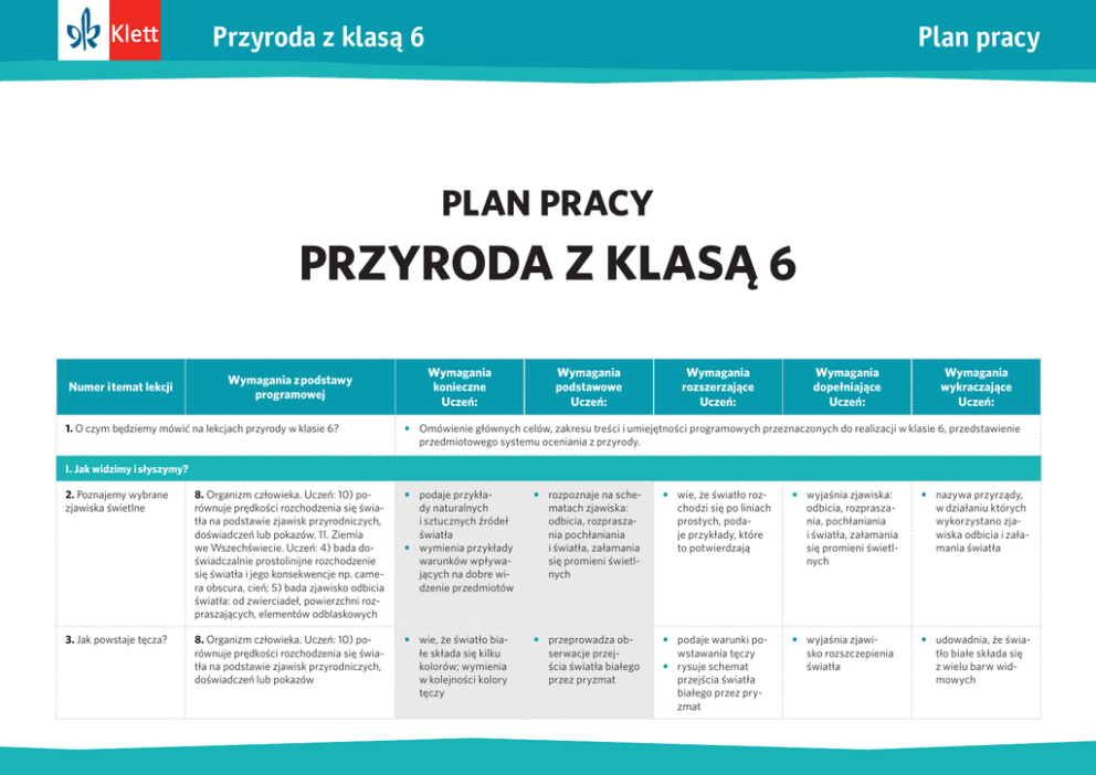 Przyroda z klasą 6 Plan pracy PLAN PRACY PRZYRODA Z KLASĄ 6 Numer i temat lekcji Wymagania z podstawy programowej 1. O czym będziemy mówić na lekcjach przyrody w klasie 6? Wymagania konieczne Uczeń: Wymagania podstawowe Uczeń: Wymagania rozszerzające Uczeń: Wymagania dopełniające Uczeń: Wymagania wykraczające Uczeń: • Omówienie głównych celów, zakresu treści i umiejętności programowych przeznaczonych do realizacji w klasie 6, przedstawienie przedmiotowego systemu oceniania z przyrody. I. Jak widzimy i słyszymy? 2. Poznajemy wybrane zjawiska świetlne 8. Organizm człowieka. Uczeń: 10) porównuje prędkości rozchodzenia się światła na podstawie zjawisk przyrodniczych, doświadczeń lub pokazów. 11. Ziemia we Wszechświecie. Uczeń: 4) bada doświadczalnie prostolinijne rozchodzenie się światła i jego konsekwencje np. camera obscura, cień; 5) bada zjawisko odbicia światła: od zwierciadeł, powierzchni rozpraszających, elementów odblaskowych • podaje przykłady naturalnych i sztucznych źródeł światła • wymienia przykłady warunków wpływających na dobre widzenie przedmiotów • rozpoznaje na schematach zjawiska: odbicia, rozpraszania pochłaniania i światła, załamania się promieni świetlnych • wie, że światło rozchodzi się po liniach prostych, podaje przykłady, które to potwierdzają • wyjaśnia zjawiska: odbicia, rozpraszania, pochłaniania i światła, załamania się promieni świetlnych • nazywa przyrządy, w działaniu których wykorzystano zjawiska odbicia i załamania światła 3. Jak powstaje tęcza? 8. Organizm człowieka. Uczeń: 10) porównuje prędkości rozchodzenia się światła na podstawie zjawisk przyrodniczych, doświadczeń lub pokazów • wie, że światło białe składa się kilku kolorów; wymienia w kolejności kolory tęczy • przeprowadza obserwacje przejścia światła białego przez pryzmat • podaje warunki powstawania tęczy • rysuje schemat przejścia światła białego przez pryzmat • wyjaśnia zjawisko rozszczepienia światła • udowadnia, że światło białe składa się z wielu barw widmowych Plan pracy Numer i temat lekcji 4. Jak rozchodzą się dźwięki? Przyroda z klasą 6 Wymagania z podstawy programowej 8. Organizm człowieka. Uczeń: 8) wskazuje rodzaje źródeł dźwięku, bada doświadczalnie zależność powstającego dźwięku od. np. naprężenia i długości struny; 9) bada rozchodzenie się dźwięków w powietrzu i ciałach stałych; 10) porównuje prędkości rozchodzenia się dźwięku na podstawie zjawisk przyrodniczych, doświadczeń lub pokazów Wymagania konieczne Uczeń: • podaje przykłady źródeł dźwięków Wymagania podstawowe Uczeń: Wymagania rozszerzające Uczeń: Wymagania dopełniające Uczeń: Wymagania wykraczające Uczeń: • podaje przykłady świadczące o tym, że dźwięki rozchodzą się w różnych ośrodkach • wykonuje doświadczenie ilustrujące przenoszenie dźwięków przez ciała stałe, porównuje prędkości rozchodzenia się dźwięków na podstawie zjawisk przyrodniczych, doświadczeń lub pokazów • wyjaśnia sposób rozchodzenia się dźwięków • projektuje i wykonuje doświadczenie ilustrujące przenoszenie dźwięków przez różne ośrodki: ciała stałe, powietrze itp. 5. i 6. Utrwalenie i sprawdzian wiadomości i umiejętności ucznia po dziale I Jak widzimy i słyszymy? II. Jakie jest miejsce Ziemi we wszechświecie? 7. Gwiazdy, planety i planetoidy 11. Ziemia we Wszechświecie. Uczeń: 3) wyjaśnia założenia teorii heliocentrycznej Mikołaja Kopernika • wie, czego dokonał M. Kopernik • identyfikuje Słońce jako gwiazdę najbliższą Słońcu • wskazuje różnice między gwiazdą a planetą • wyjaśnia różnice między teorią geoi heliocentryczną • definiuje pojęcia: planetoidy, komety • wie, kim byli Galileusz i Kepler • wyjaśnia znaczenie teorii heliocentrycznej dla rozwoju nauki • definiuje pojęcie: rok świetlny 8. Układ Słoneczny 11. Ziemia we Wszechświecie. Uczeń: 2) wymienia nazwy planet Układu Słonecznego i porządkuje je według odległości od Słońca • wie, że Ziemia jest 3. planetą Układu Słonecznego • wyjaśnia, dlaczego na Ziemi panują warunki umożliwiające życie • wymienia w kolejności planety Układu Słonecznego • identyfikuje Księżyc jako naturalnego satelitę Ziemi • wymienia typy planet i podaje przykłady • rozróżnia fazy Księżyca • charakteryzuje warunki panujące na Księżycu • podaje nazwisko Polaka, który odbył podróż kosmiczną • wymienia przykłady pojazdów i urządzeń, które człowiek wysyłał w kosmos • wymienia przykłady astronautów i ich dokonania w kosmosie • wyjaśnia znaczenie lotów kosmicznych dla rozwoju nauki • wyjaśnia znaczenie skrótu NASA, przygotowuje informacje na temat działalności NASA • identyfikuje globus jako model Ziemi • wskazuje na globusie: równik, bieguny • wyjaśnia, jak działa siła grawitacji • wyjaśnia, czym jest oś ziemska • wyjaśnia różnice między masą o ciężarem • podaje jednostki masy i ciężaru • wyjaśnia, co to jest pole grawitacyjne 9. Człowiek odkrywa kosmos 10. Kształt, obwód, masa i ciężar, czyli kilka faktów na temat Ziemi 11. Ziemia we Wszechświecie. Uczeń: 1) opisuje kształt Ziemi z wykorzystaniem jej modelu – globusa Przyroda z klasą 6 Numer i temat lekcji Wymagania z podstawy programowej Plan pracy Wymagania konieczne Uczeń: Wymagania podstawowe Uczeń: Wymagania rozszerzające Uczeń: Wymagania dopełniające Uczeń: 11. Jak określić położenie obiektu geograficznego na kuli ziemskiej? 12. Lądy i oceany. Uczeń: 1) wskazuje na globusie: bieguny, równik, południk zerowy i 1800, półkule, kierunki główne; 2) wskazuje na mapie świata, równik, południk zerowy i 1800, bieguny • rozróżnia i wskazuje na globusie: równoleżniki i południki, kierunki główne • wskazuje na mapie świata, równik, południ