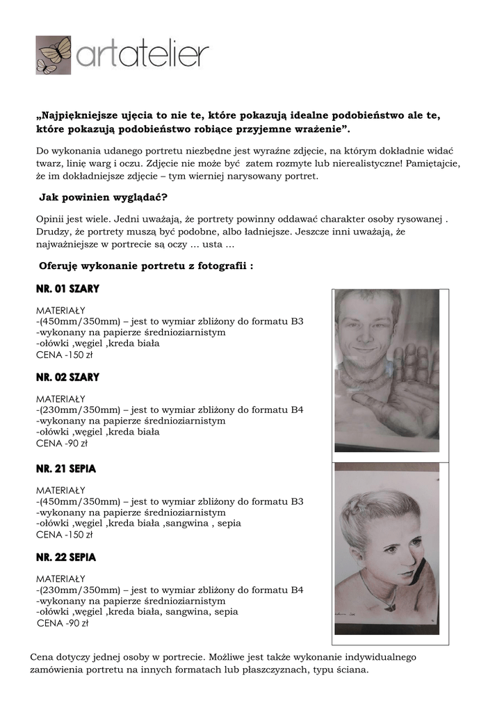 „Najpiękniejsze ujęcia to nie te, które pokazują idealne podobieństwo ale te, które pokazują podobieństwo robiące przyjemne wrażenie”. Do wykonania udanego portretu niezbędne jest wyraźne zdjęcie, na którym dokładnie widać twarz, linię warg i oczu. Zdjęcie nie może być zatem rozmyte lub nierealistyczne! Pamiętajcie, że im dokładniejsze zdjęcie – tym wierniej narysowany portret. Jak powinien wyglądać? Opinii jest wiele. Jedni uważają, że portrety powinny oddawać charakter osoby rysowanej . Drudzy, że portrety muszą być podobne, albo ładniejsze. Jeszcze inni uważają, że najważniejsze w portrecie są oczy … usta … Oferuję wykonanie portretu z fotografii : MATERIAŁY -(450mm/350mm) – jest to wymiar zbliżony do formatu B3 -wykonany na papierze średnioziarnistym -ołówki ,węgiel ,kreda biała CENA -150 zł MATERIAŁY -(230mm/350mm) – jest to wymiar zbliżony do formatu B4 -wykonany na papierze średnioziarnistym -ołówki ,węgiel ,kreda biała CENA -90 zł MATERIAŁY -(450mm/350mm) – jest to wymiar zbliżony do formatu B3 -wykonany na papierze średnioziarnistym -ołówki ,węgiel ,kreda biała ,sangwina , sepia CENA -150 zł MATERIAŁY -(230mm/350mm) – jest to wymiar zbliżony do formatu B4 -wykonany na papierze średnioziarnistym -ołówki ,węgiel ,kreda biała, sangwina, sepia CENA -90 zł Cena dotyczy jednej osoby w portrecie. Możliwe jest także wykonanie indywidualnego zamówienia portretu na innych formatach lub płaszczyznach, typu ściana. wyślij zdjęcie –możliwości poniżej (im lepsza jakość fotografii tym lepszy efekt portretu) adres e-mail: [email protected] tel: 784 818 831 wiadomość na facebook: https://www.facebook.com/Artatelier-Agnieszka- Moskalewicz-424123101132216/ poczekaj na odpowiedź, ustalimy szczegóły(wymiar , kolor , cenę) prześlę zdjęcie Twojego portretu do akceptacji jeżeli efekt zadowalający możesz dokonać płatności i oczekiwać paczki. Portrety zabezpieczone fiksatywą wysyłam w tubach na własny koszt - nie płacisz za wysyłkę. Wysyłka gratis na terenie kraju.