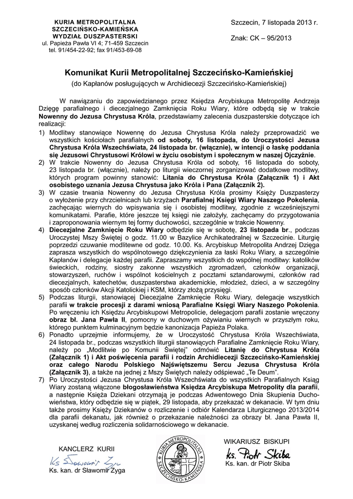 Komunikat Kurii Metropolitalnej Szczecińsko