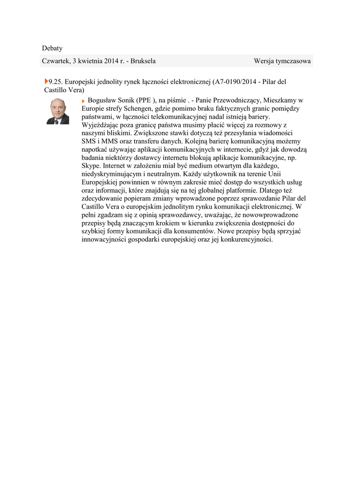 Debaty Czwartek, 3 kwietnia 2014 r. - Bruksela Wersja tymczasowa 9.25. Europejski jednolity rynek łączności elektronicznej (A7-0190/2014 - Pilar del Castillo Vera) Bogusław Sonik (PPE ), na piśmie . - Panie Przewodniczący, Mieszkamy w Europie strefy Schengen, gdzie pomimo braku faktycznych granic pomiędzy państwami, w łączności telekomunikacyjnej nadal istnieją bariery. Wyjeżdżając poza granicę państwa musimy płacić więcej za rozmowy z naszymi bliskimi. Zwiększone stawki dotyczą też przesyłania wiadomości SMS i MMS oraz transferu danych. Kolejną barierę komunikacyjną możemy napotkać używając aplikacji komunikacyjnych w internecie, gdyż jak dowodzą badania niektórzy dostawcy internetu blokują aplikacje komunikacyjne, np. Skype. Internet w założeniu miał być medium otwartym dla każdego, niedyskryminującym i neutralnym. Każdy użytkownik na terenie Unii Europejskiej powinnien w równym zakresie mieć dostęp do wszystkich usług oraz informacji, które znajdują się na tej globalnej platformie. Dlatego też zdecydowanie popieram zmiany wprowadzone poprzez sprawozdanie Pilar del Castillo Vera o europejskim jednolitym rynku komunikacji elektronicznej. W pełni zgadzam się z opinią sprawozdawcy, uważając, że nowowprowadzone przepisy będą znaczącym krokiem w kierunku zwiększenia dostępności do szybkiej formy komunikacji dla konsumentów. Nowe przepisy będą sprzyjać innowacyjności gospodarki europejskiej oraz jej konkurencyjności.